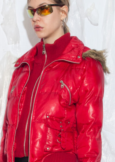 Vintage Y2K Puffer Jacket with Fur Hood in Red