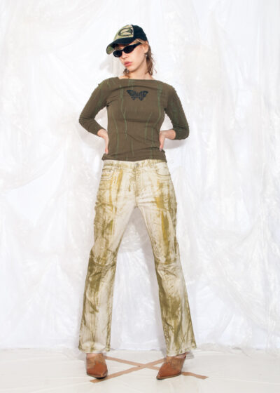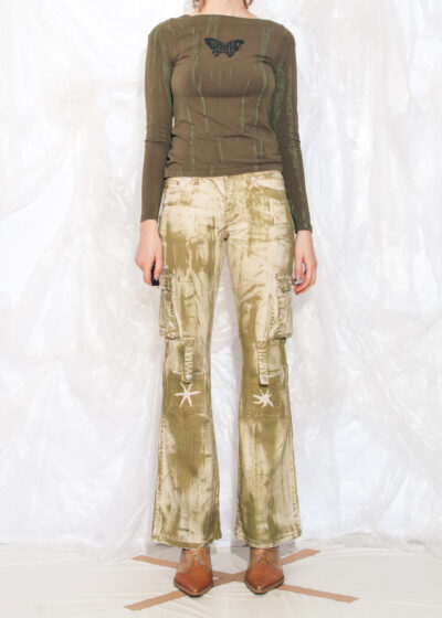 Vintage Y2K Reworked Flare Jeans in Hand-Painted Green Beige