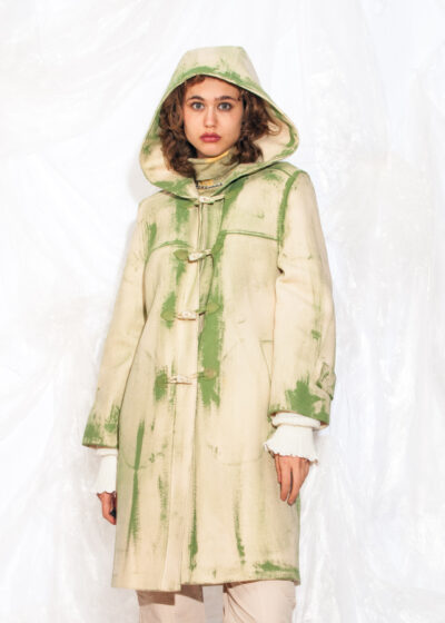 Vintage 80s Hooded Wool Coat in Hand Painted Beige