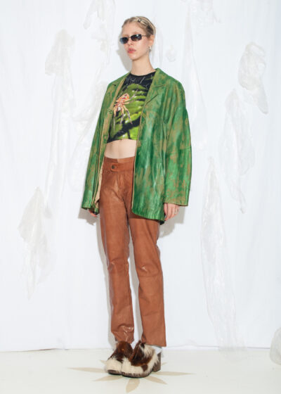 Reworked Vintage Y2K Leather Coat in Hand-Painted Green