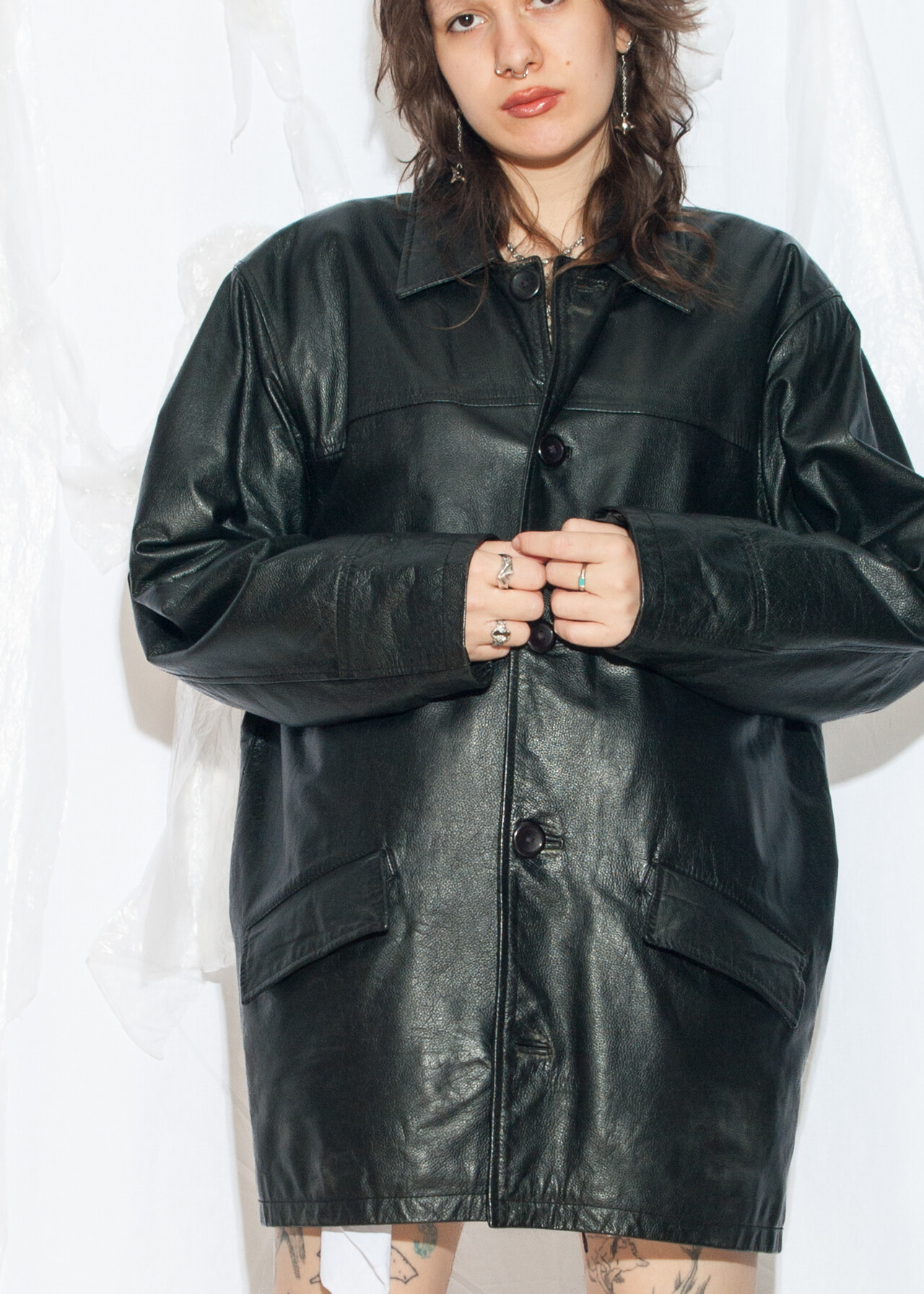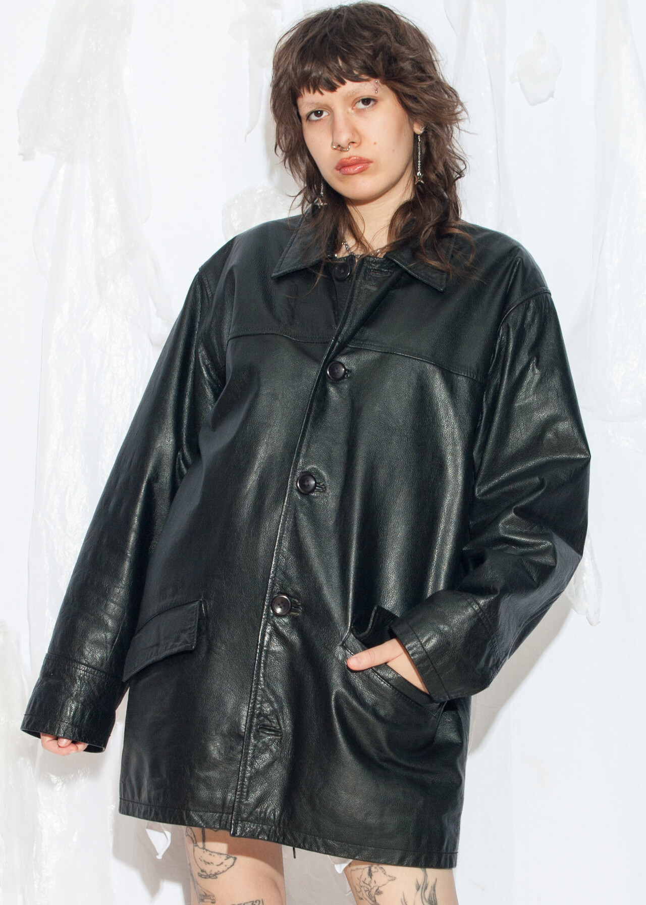 Vintage Y2K Boxy Fit Leather Coat in Black