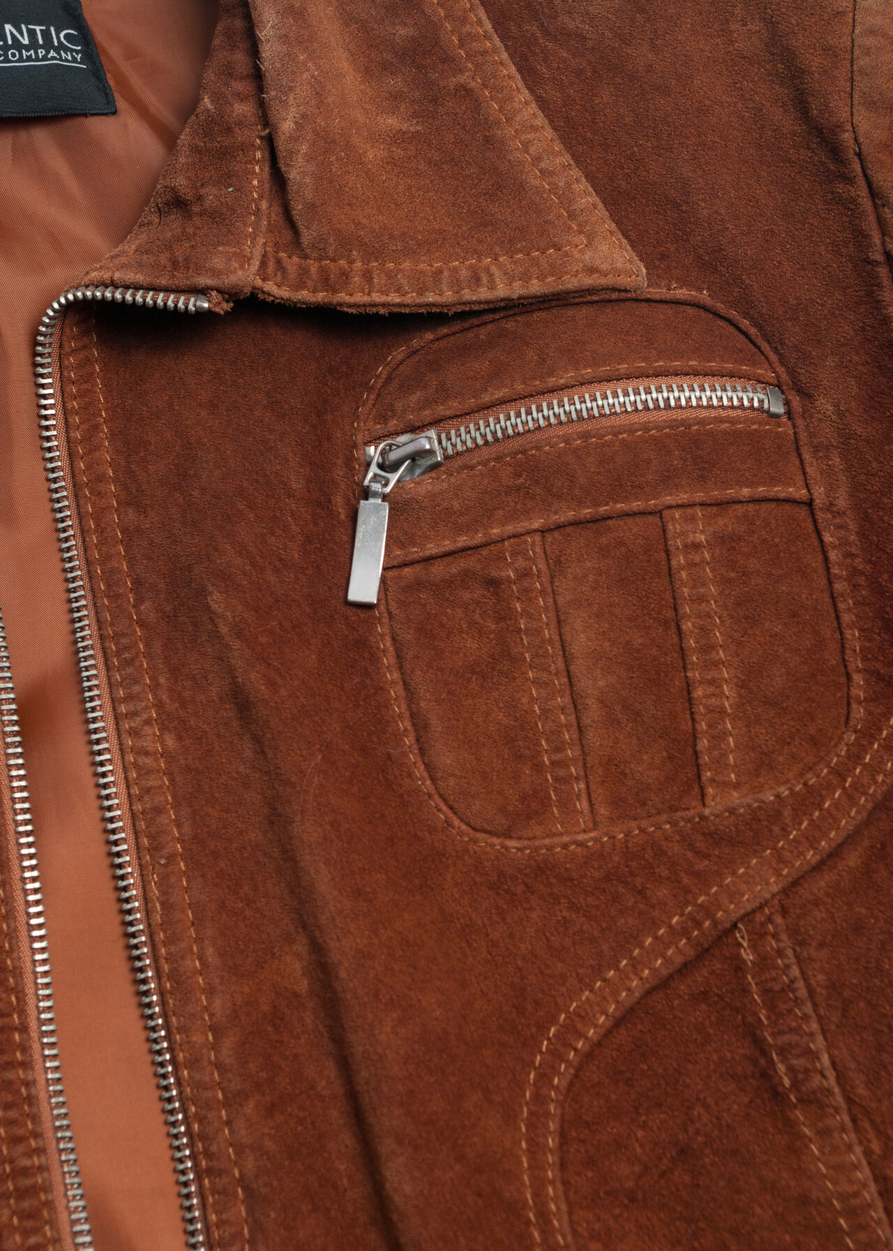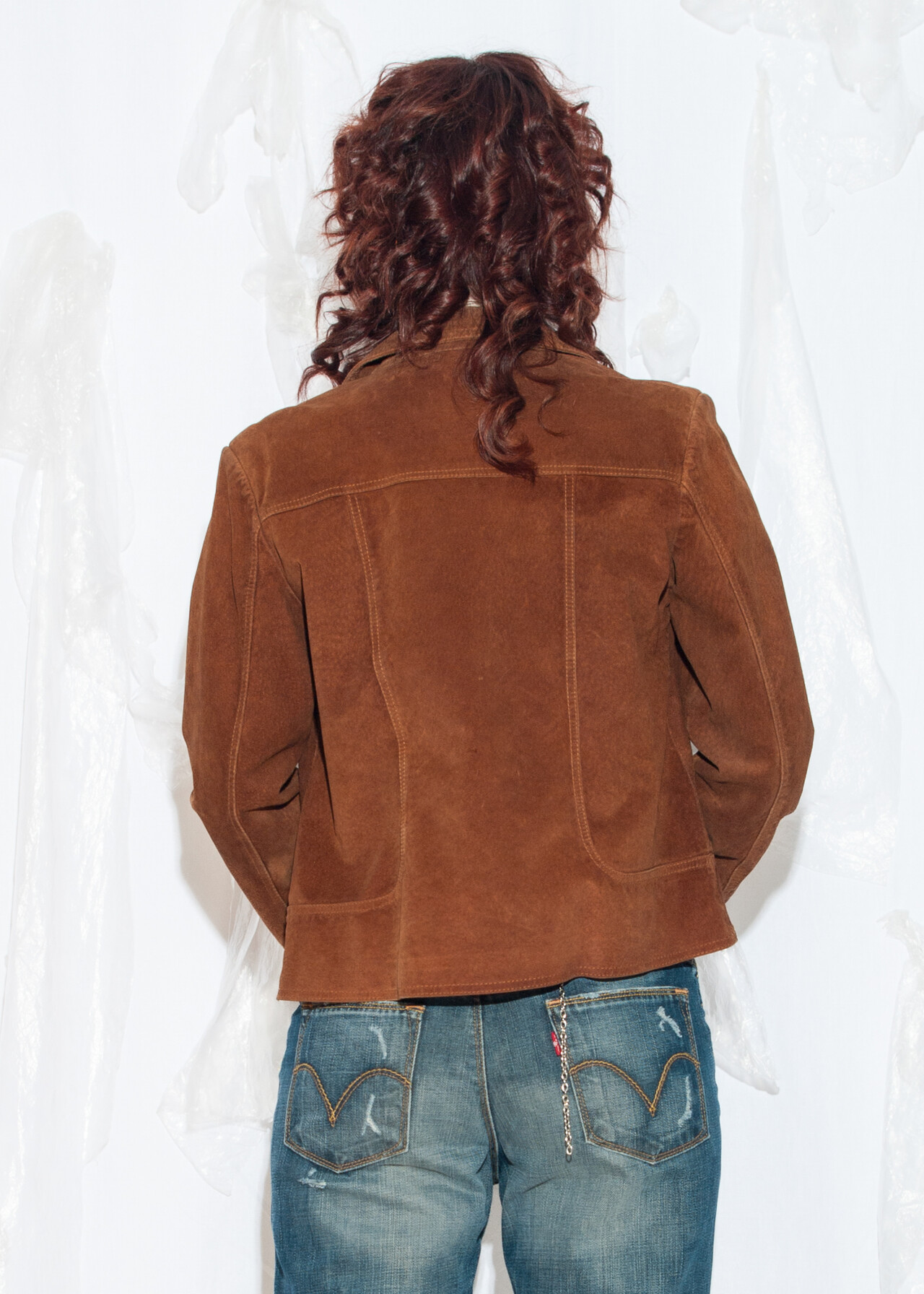 This Y2K vintage jacket is a brown suede leather masterpiece that brings all the 2000s style clothing vibes without requiring a time-traveling DeLorean.