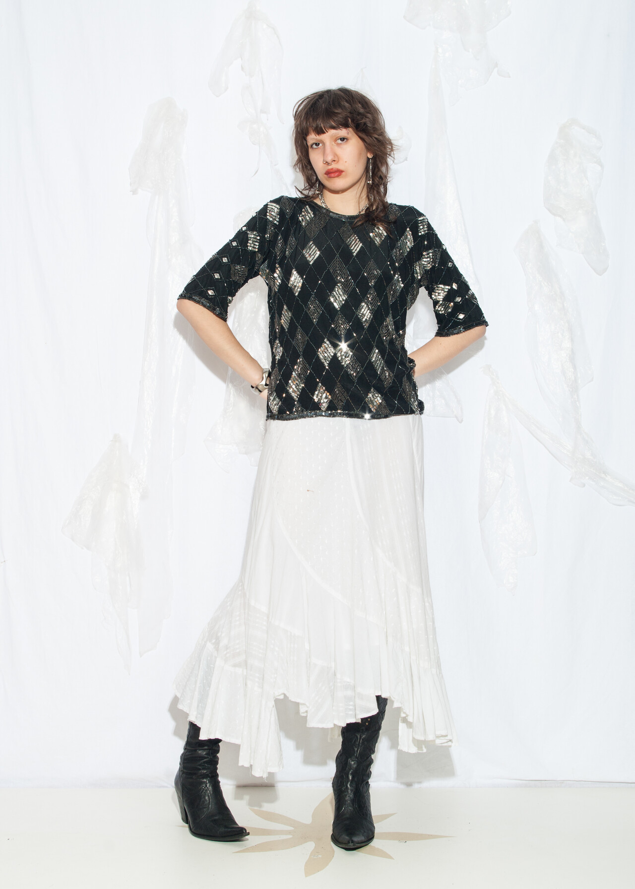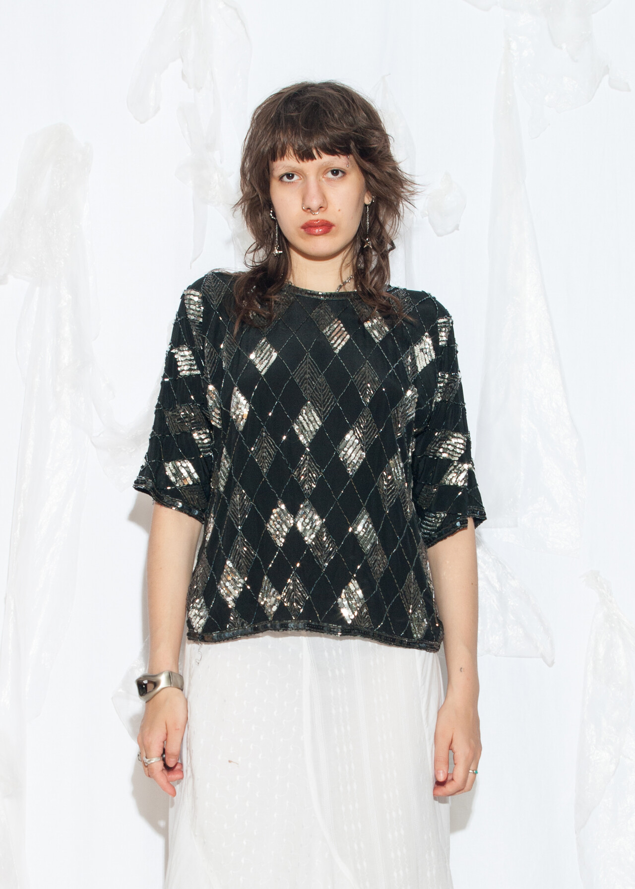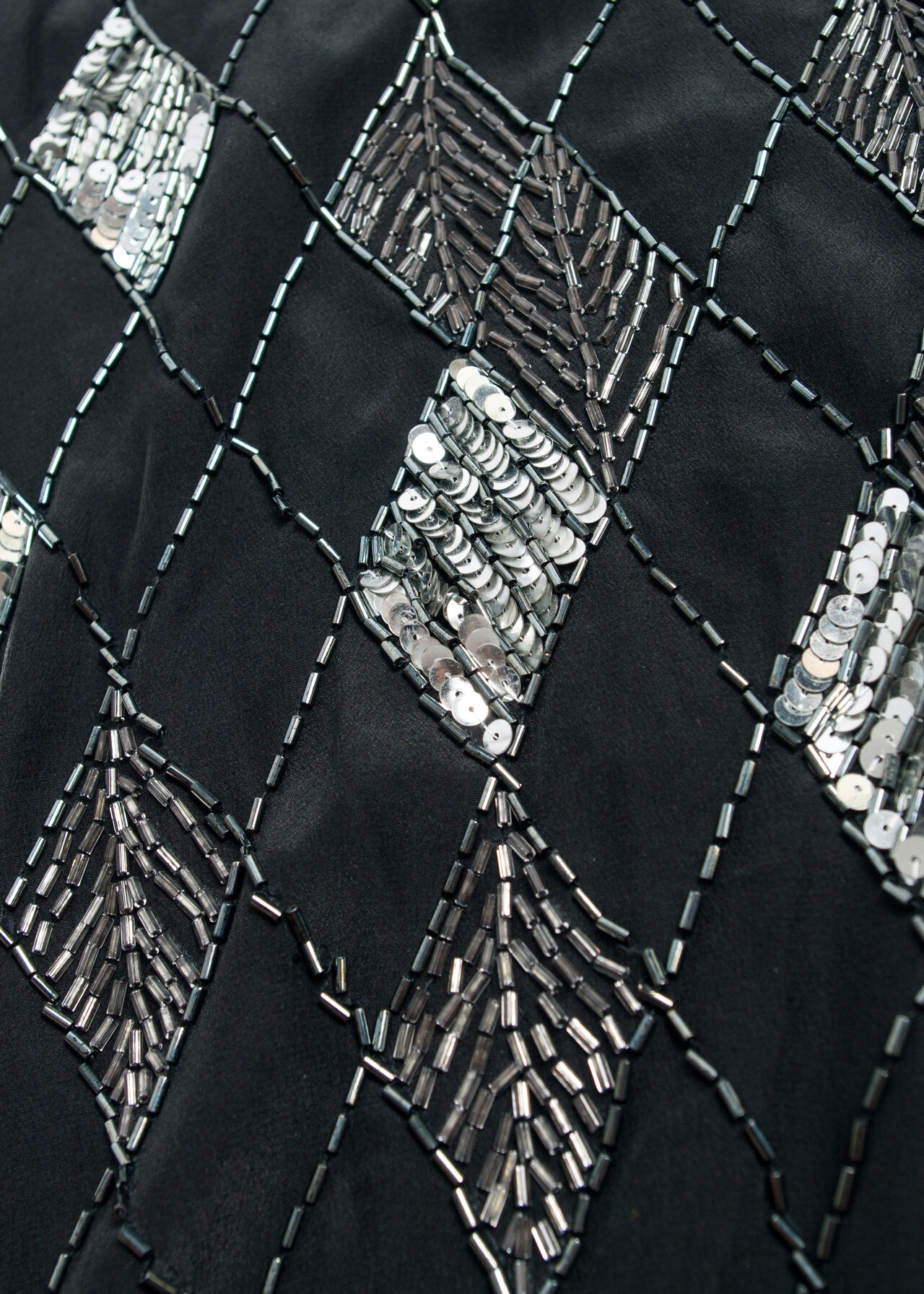 Absolutely amazing black and silver silk party top from the glamorous 80s. It survived in great condition. It features glass bead decoration and has a button closure at back. It’s unlined. Fits more sizes depending on the desired look (EU 36-40).