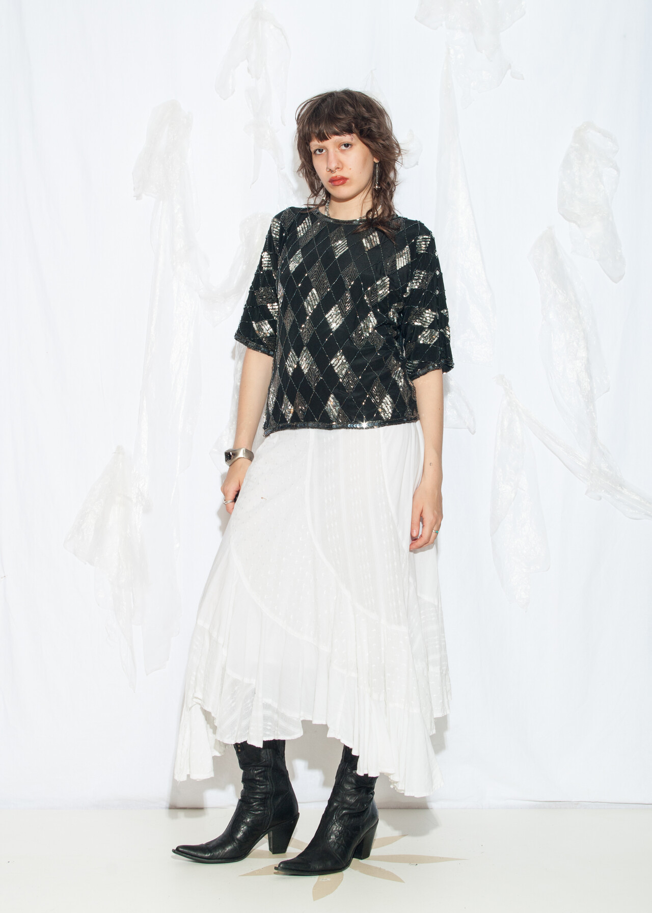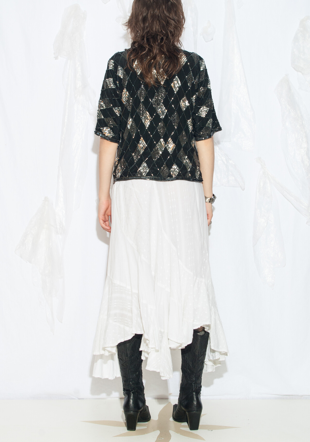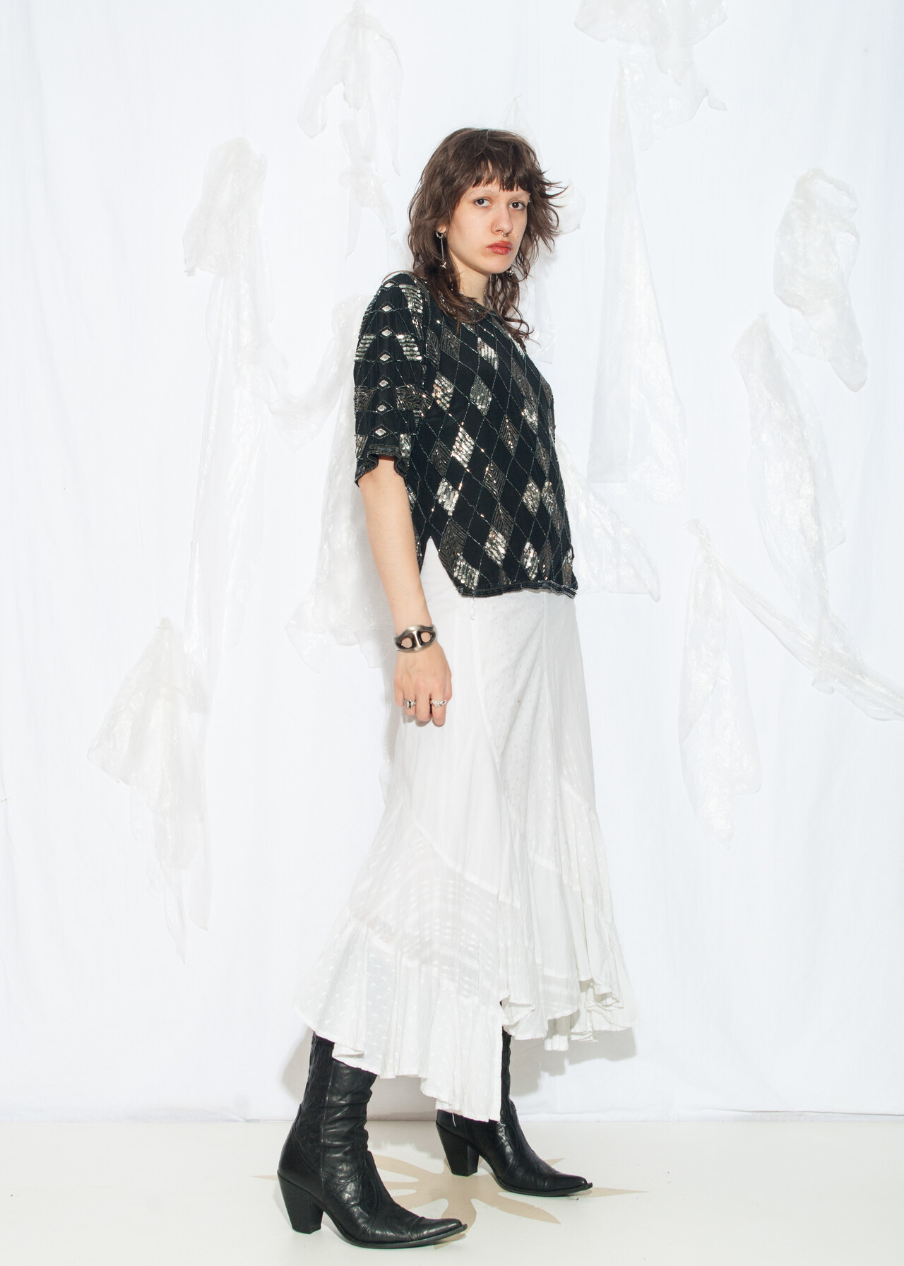 Absolutely amazing black and silver silk party top from the glamorous 80s. It survived in great condition. It features glass bead decoration and has a button closure at back. It’s unlined. Fits more sizes depending on the desired look (EU 36-40).