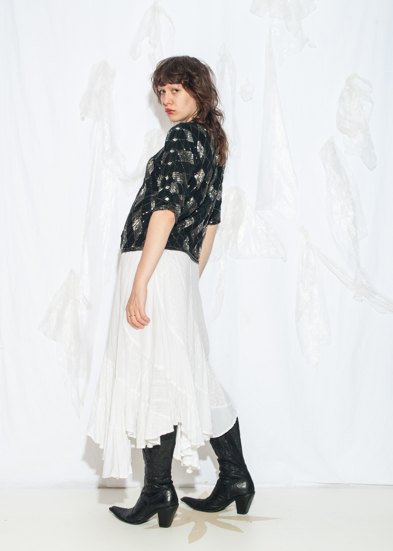 Vintage Silk Blouse 80s Silver Glam Party Top in Black