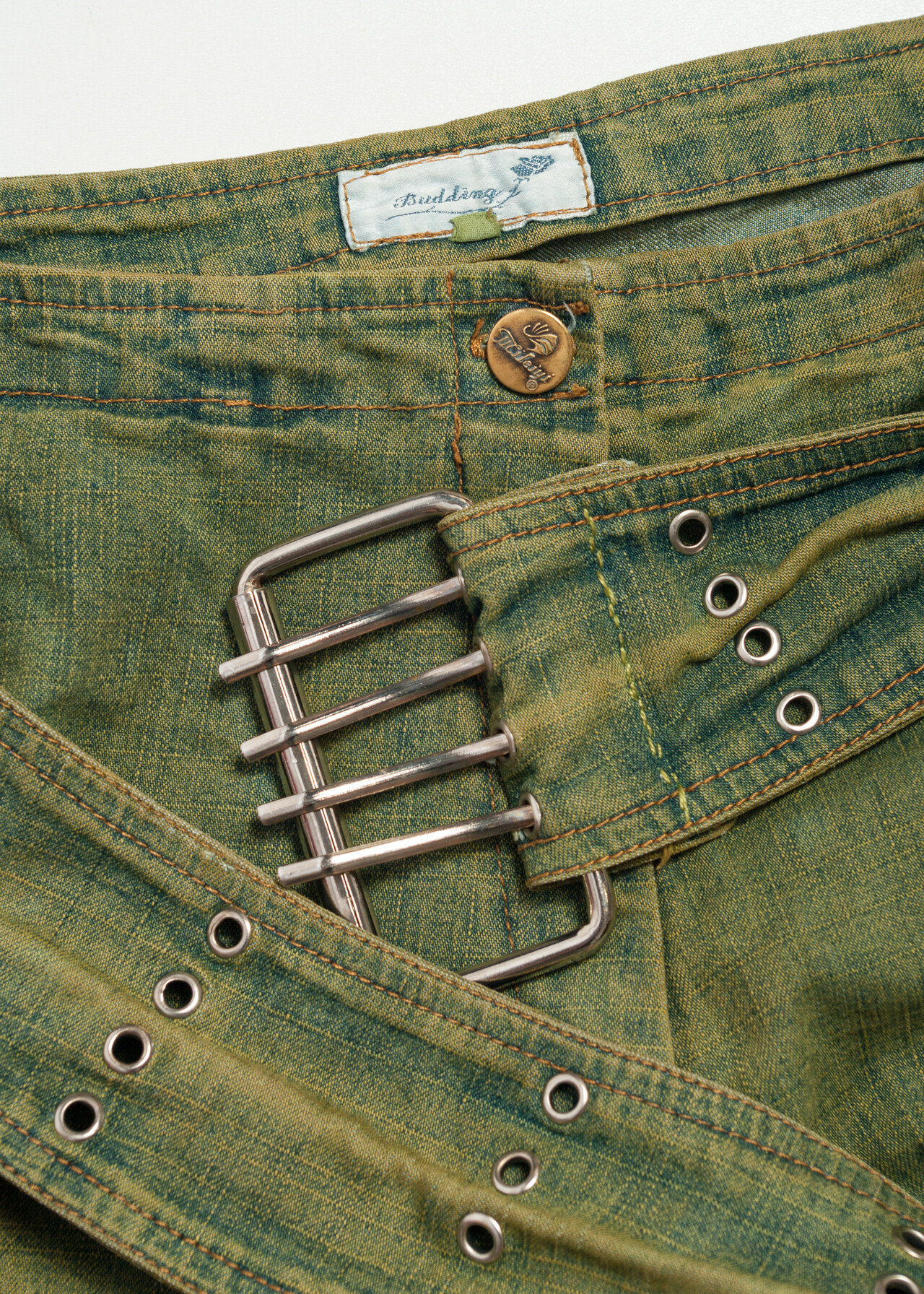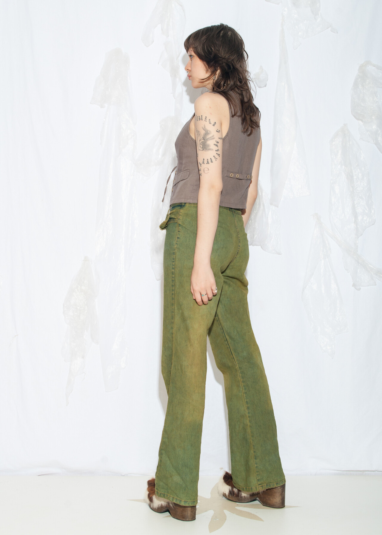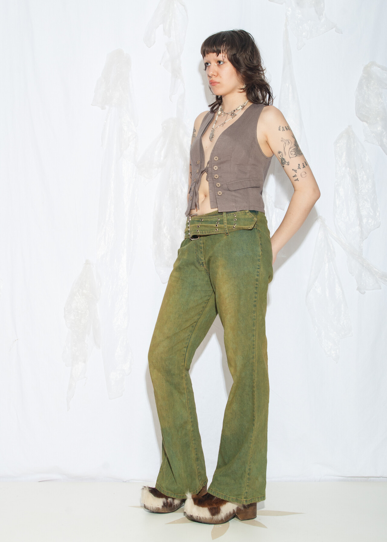 These Y2K vintage green flare jeans are the ultimate reworked masterpiece that will have you strutting like it’s 2003 and your ringtone is the latest pop hit.