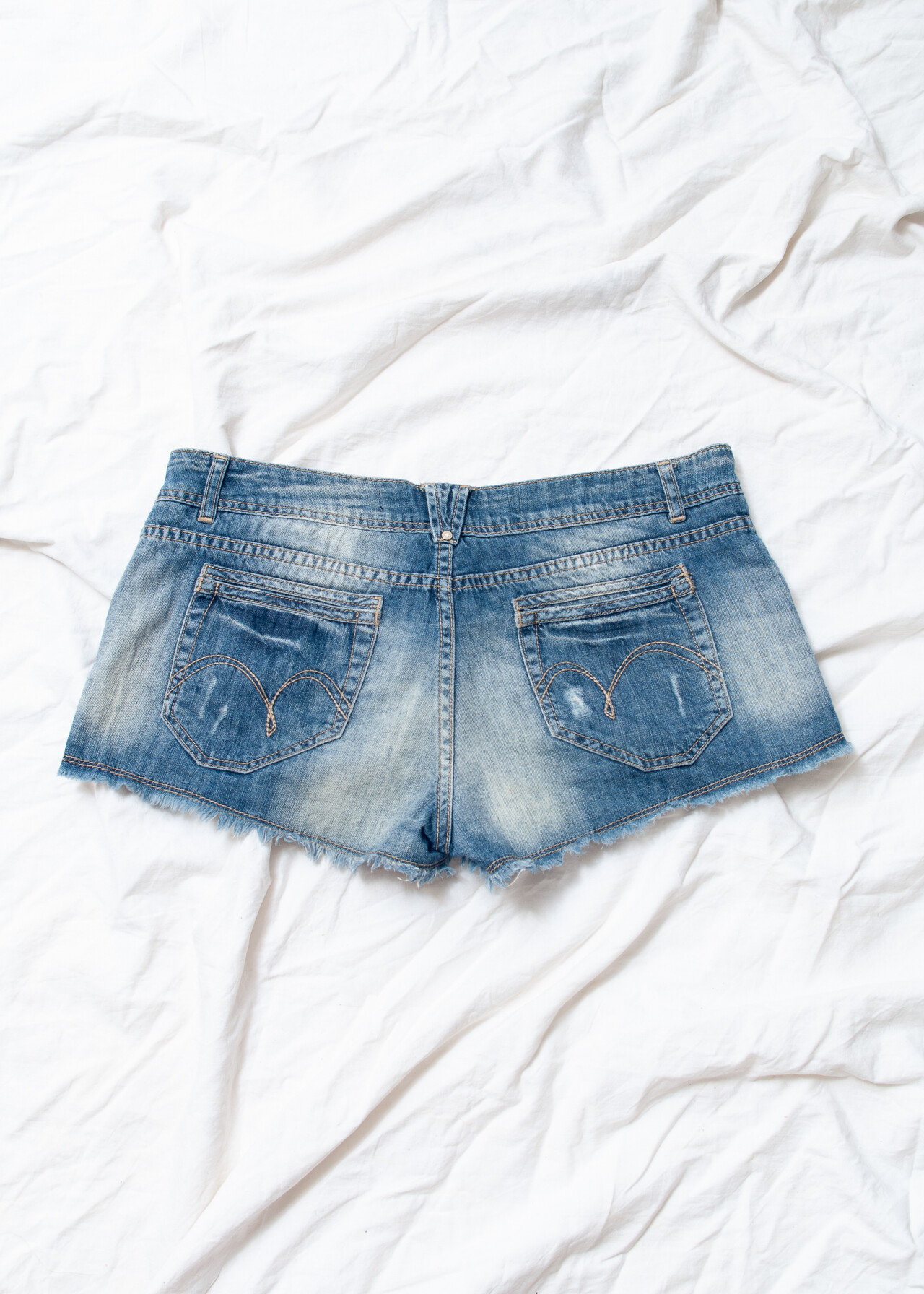 These Y2K vintage denim micro shorts are the cheeky throwback your wardrobe’s been begging for, ready to transport you to the days of stonewashed dreams and low-rise adventures!