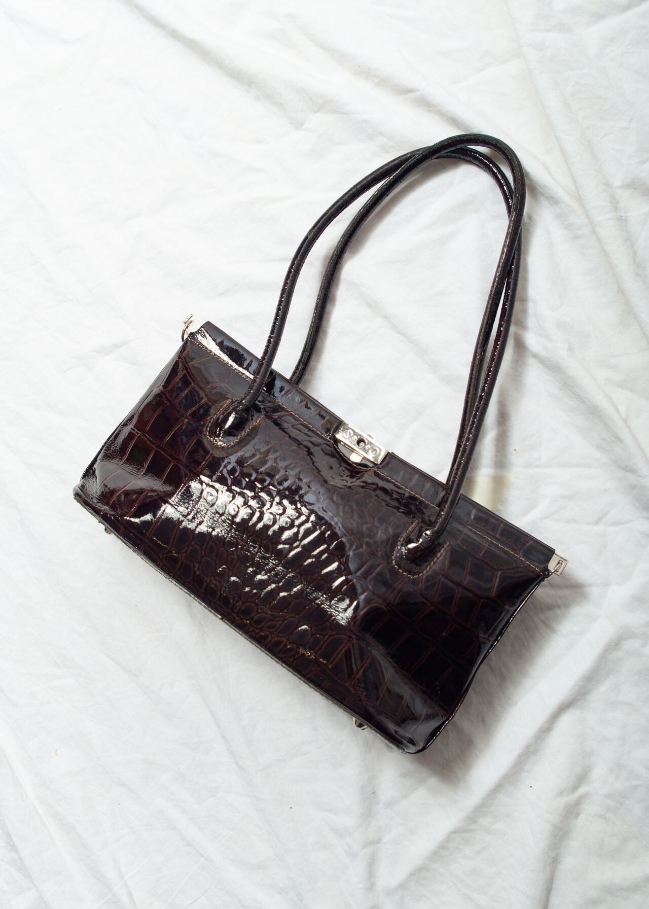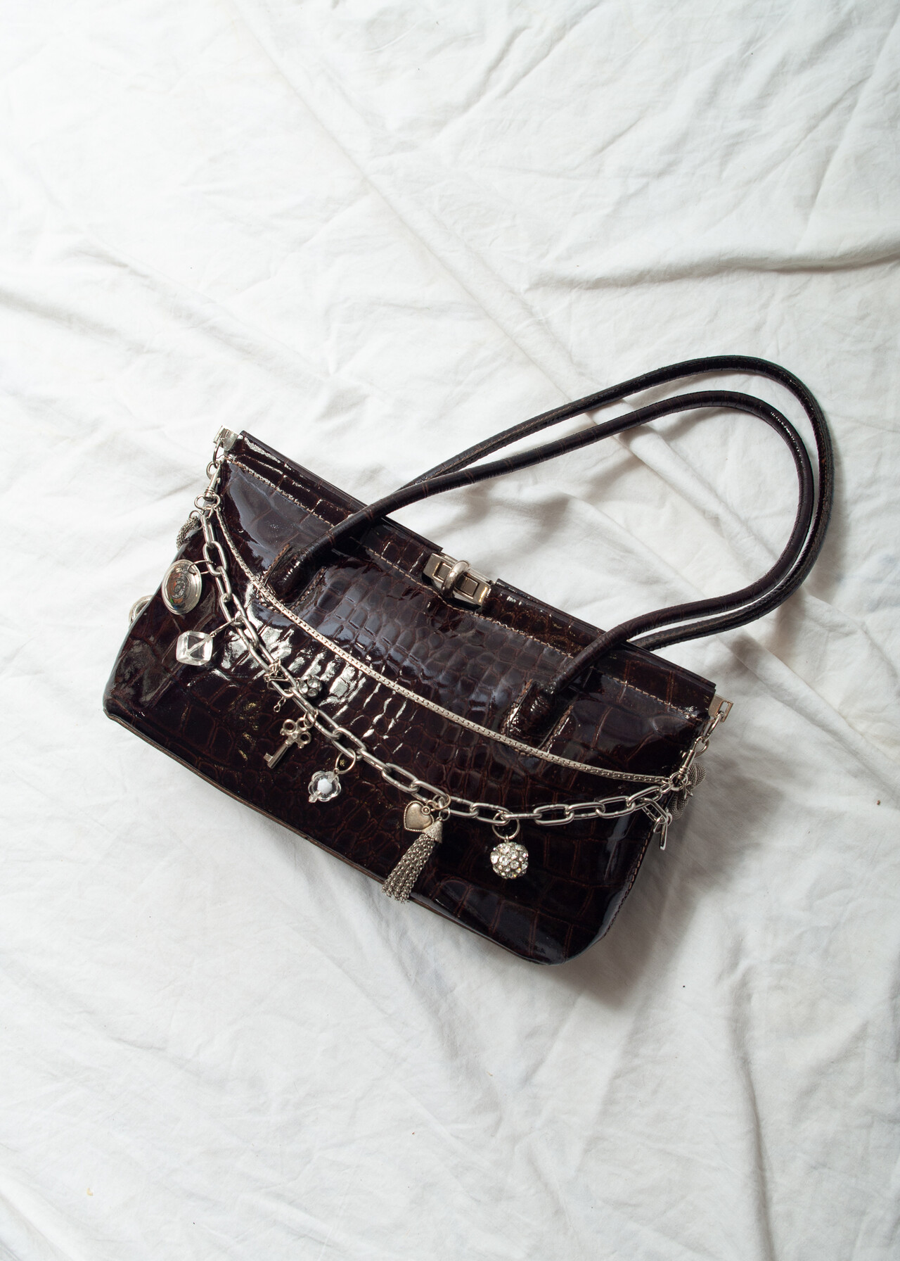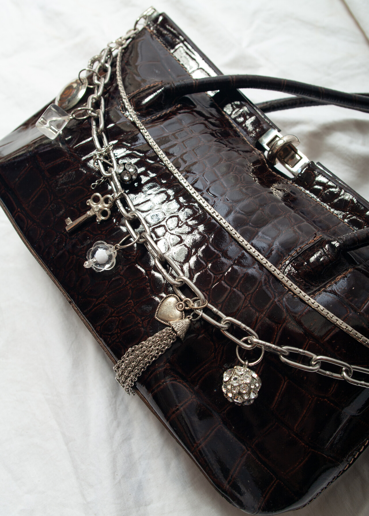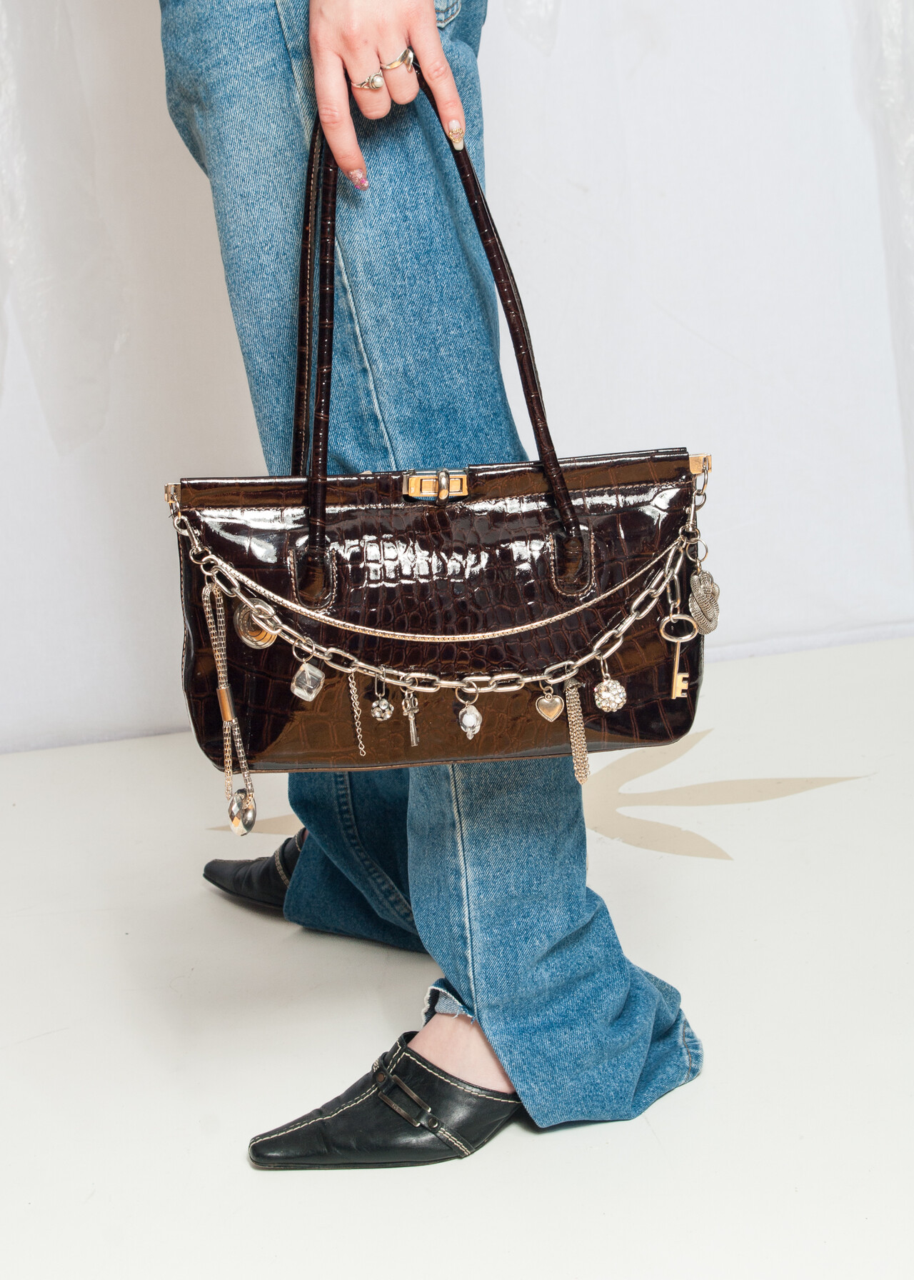 Tags: chain key beads, croco shoulder bag, European vintage, made in Italy, maximalism, patent leather purse, real leather bag, reworked, silver hardware, upcycled