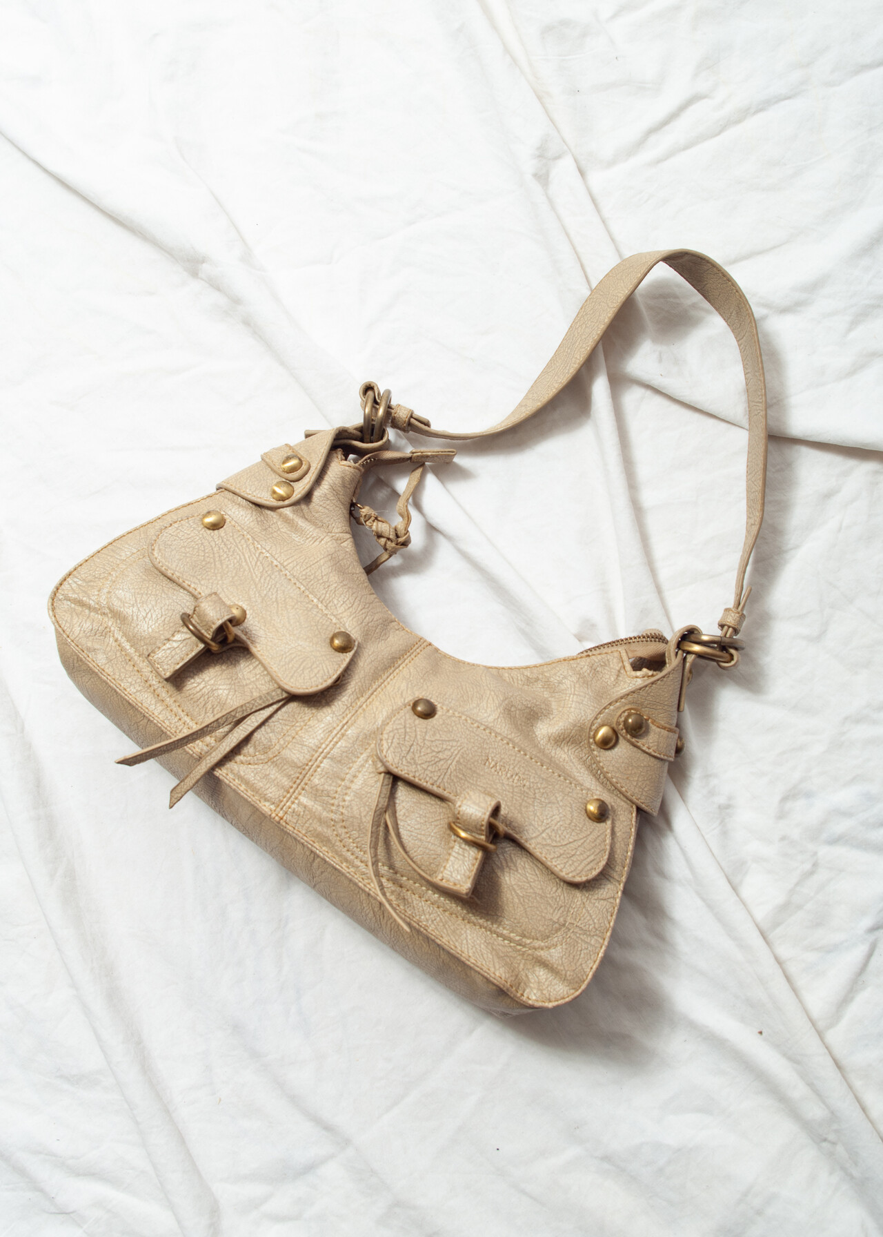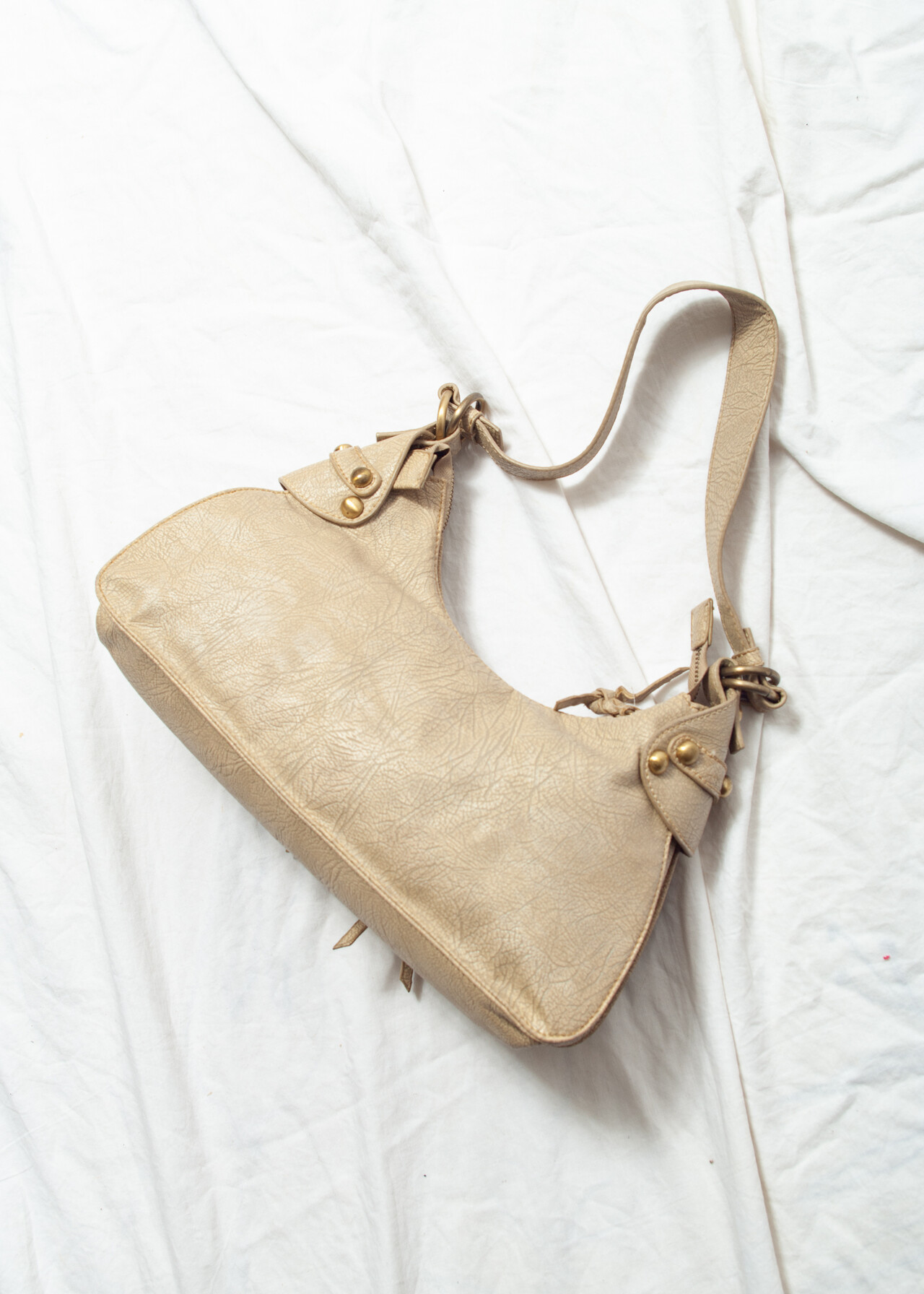 Tags: 2000s vintage, beige purse, bronze studs, faux leather bag, grunge outfit, medieval look, shoulder bag, y2k style accessory