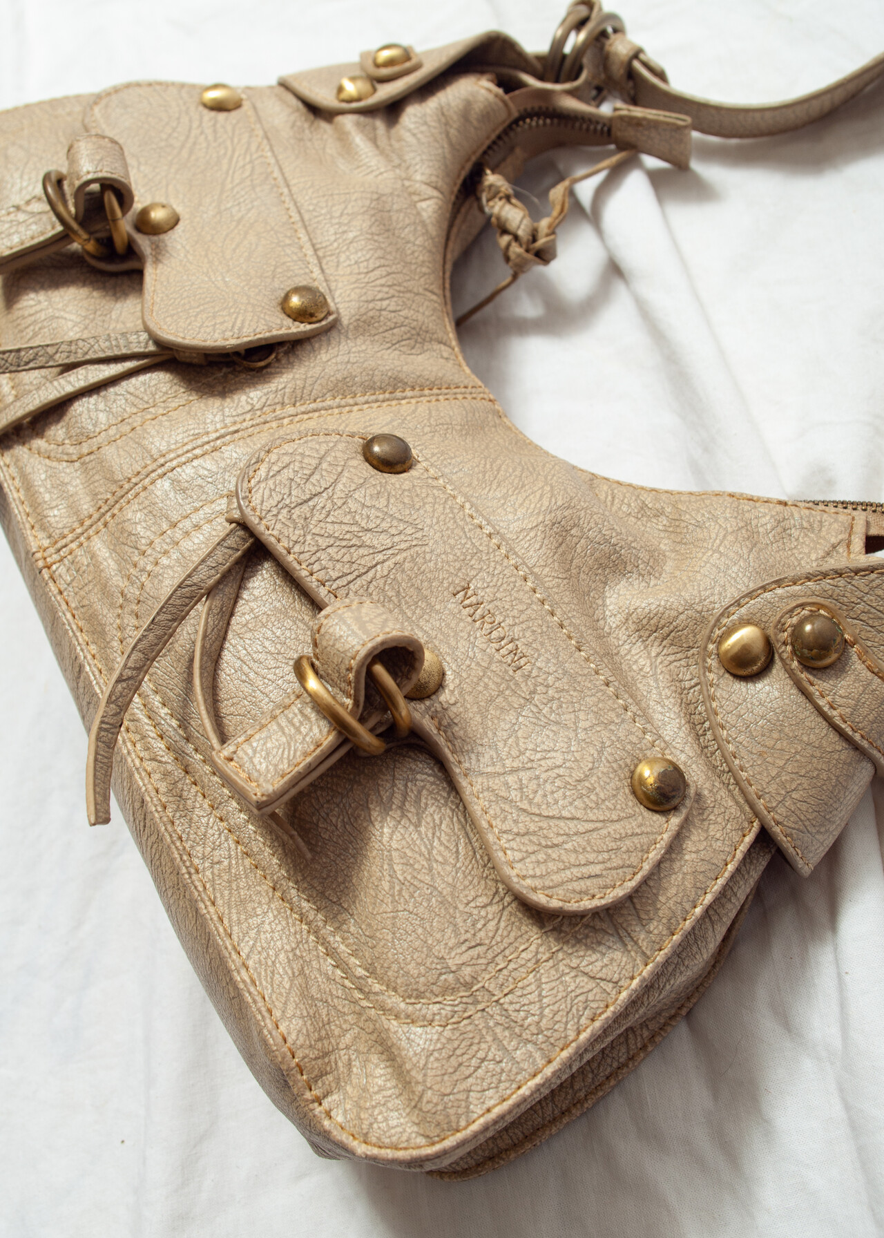 This Y2K vintage bag by nardini is a beige wonder with bronze studs that screams early 2000s, perfect for anyone who misses their flip phone.