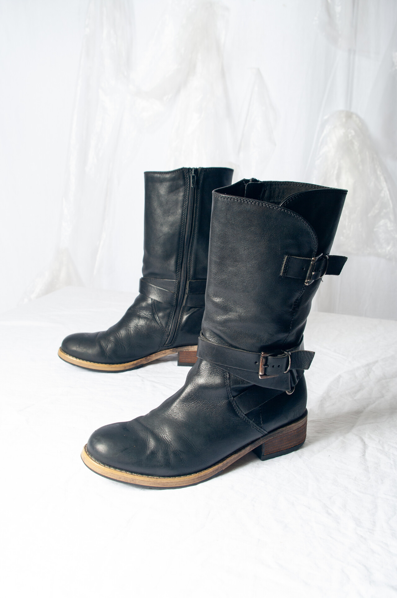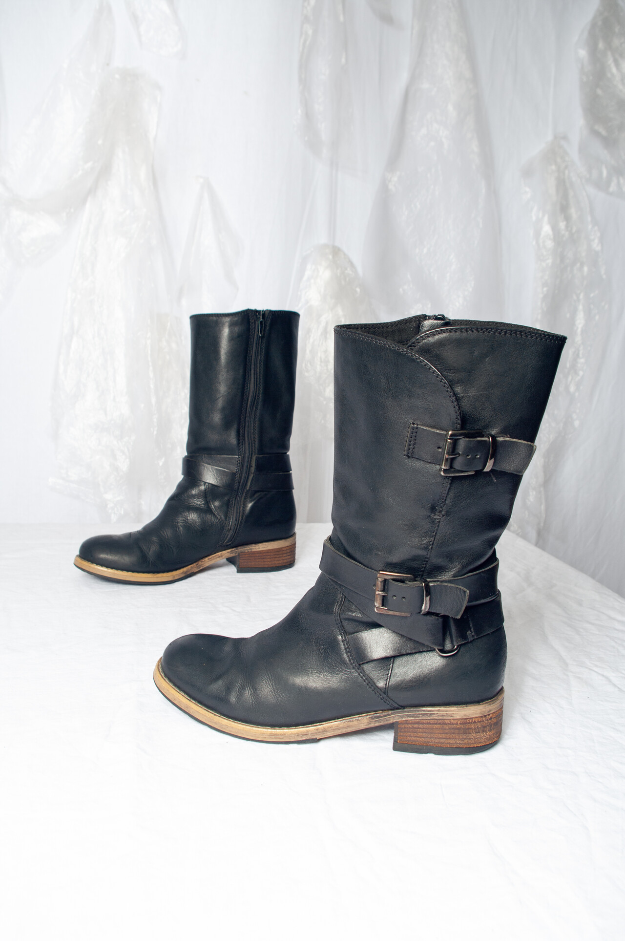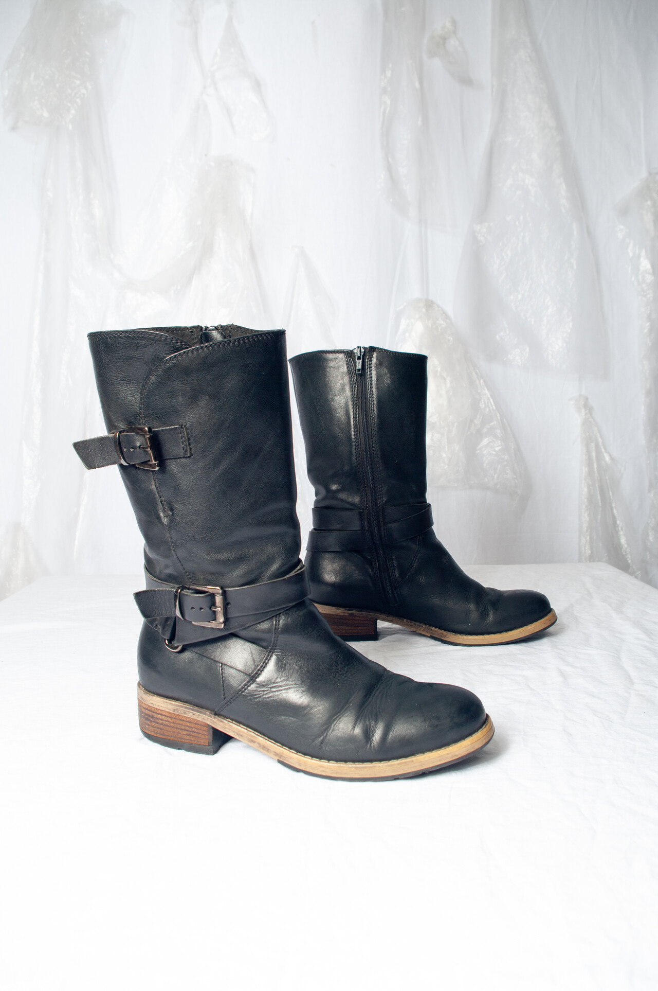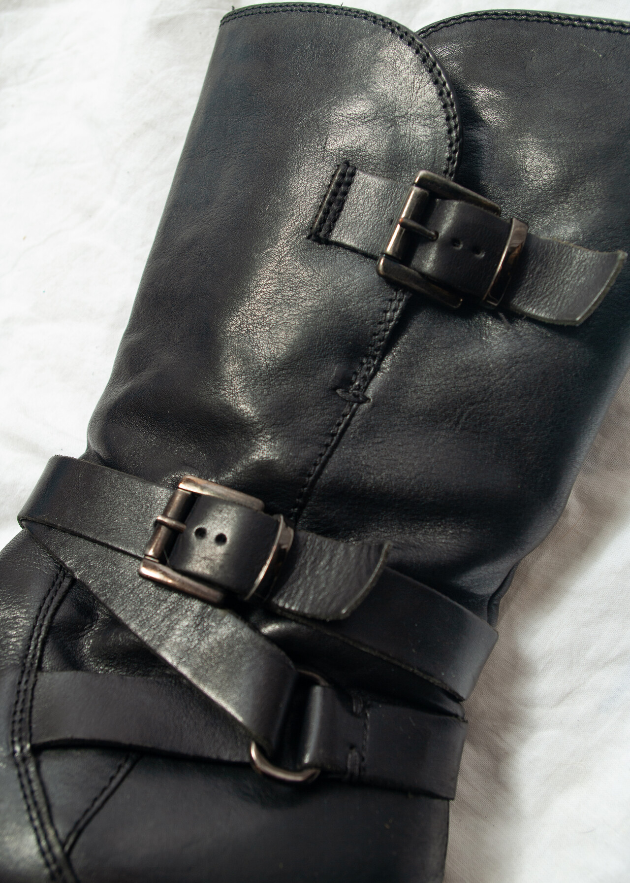 Tags: 00s vintage fashion, 2000s streetwear, cowboy boots, grunge outfit, leather boots, slouchy riding boots, straps and buckles, y2k style accessory