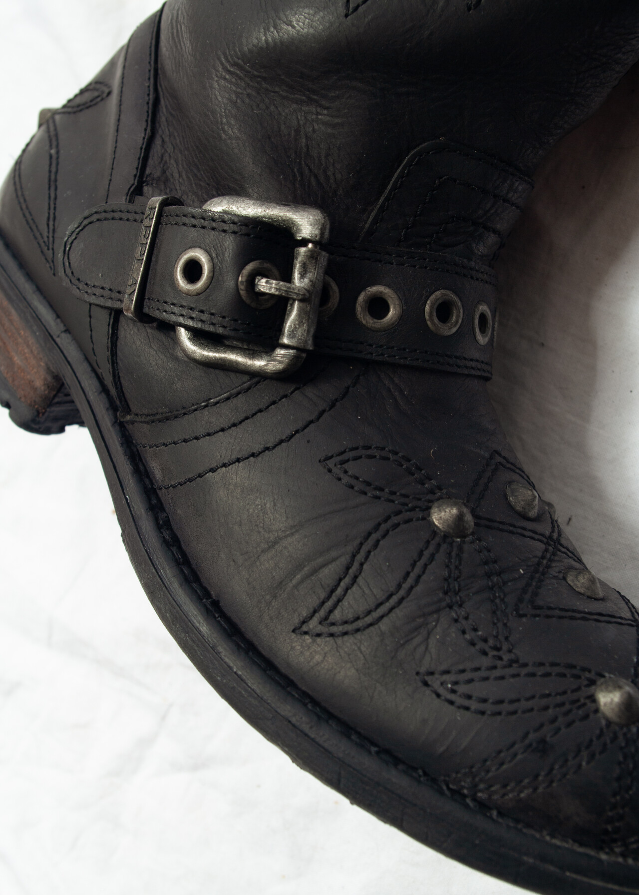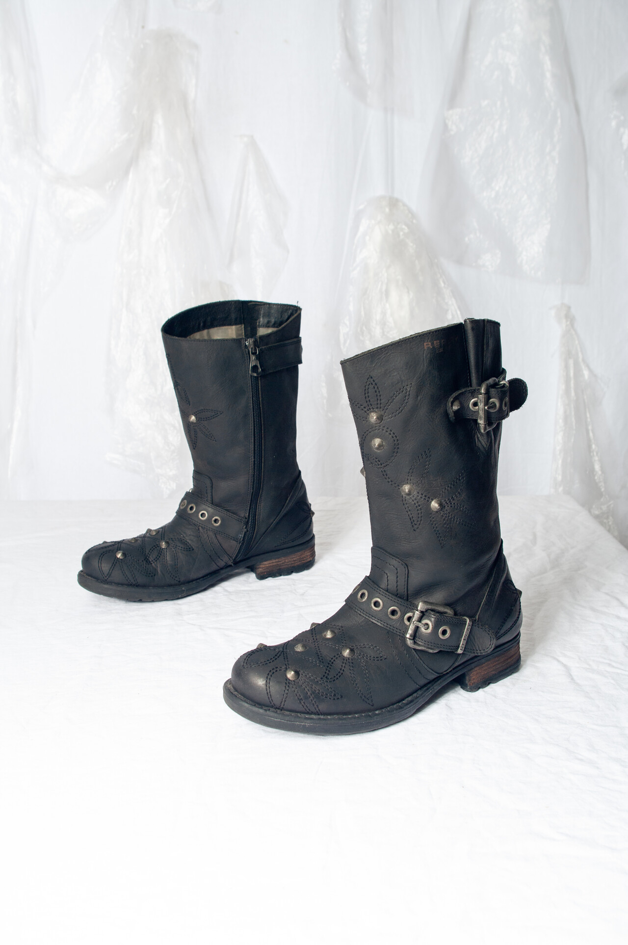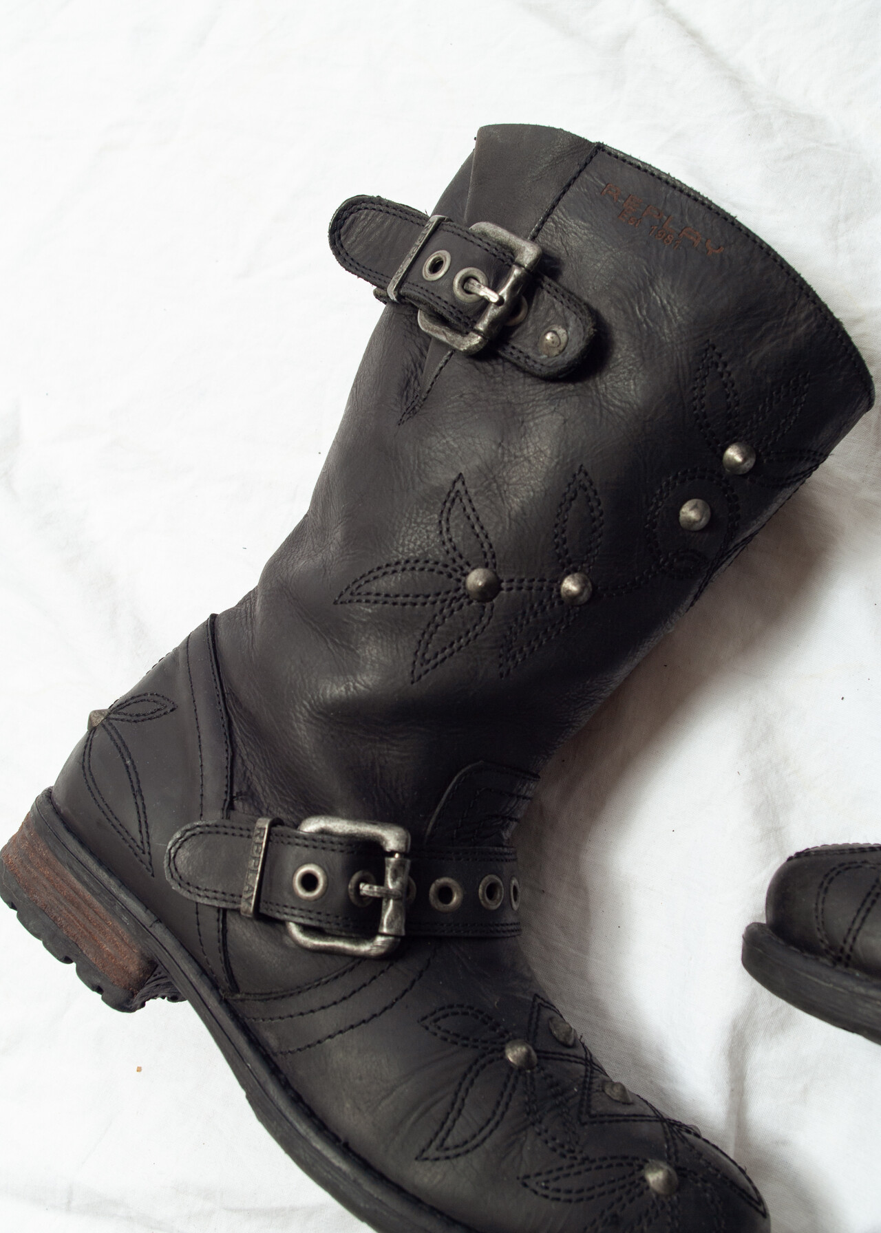 Tags: 2000s vintage fashion, biker boots, cowboy boots, designer vintage, European vintage, goth style, made in Portugal, real leather boots, Replay boots, studded, whimsigoth aesthetic, y2k grunge outfit, y2k style accessory