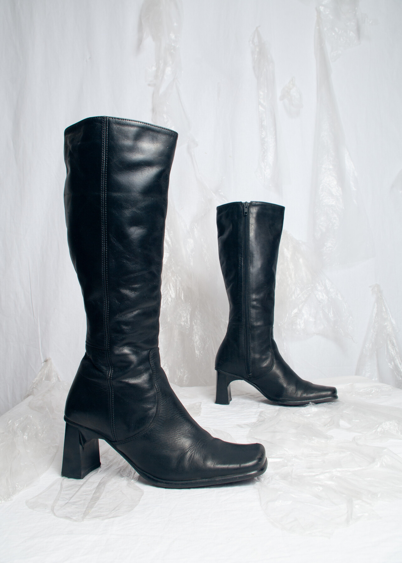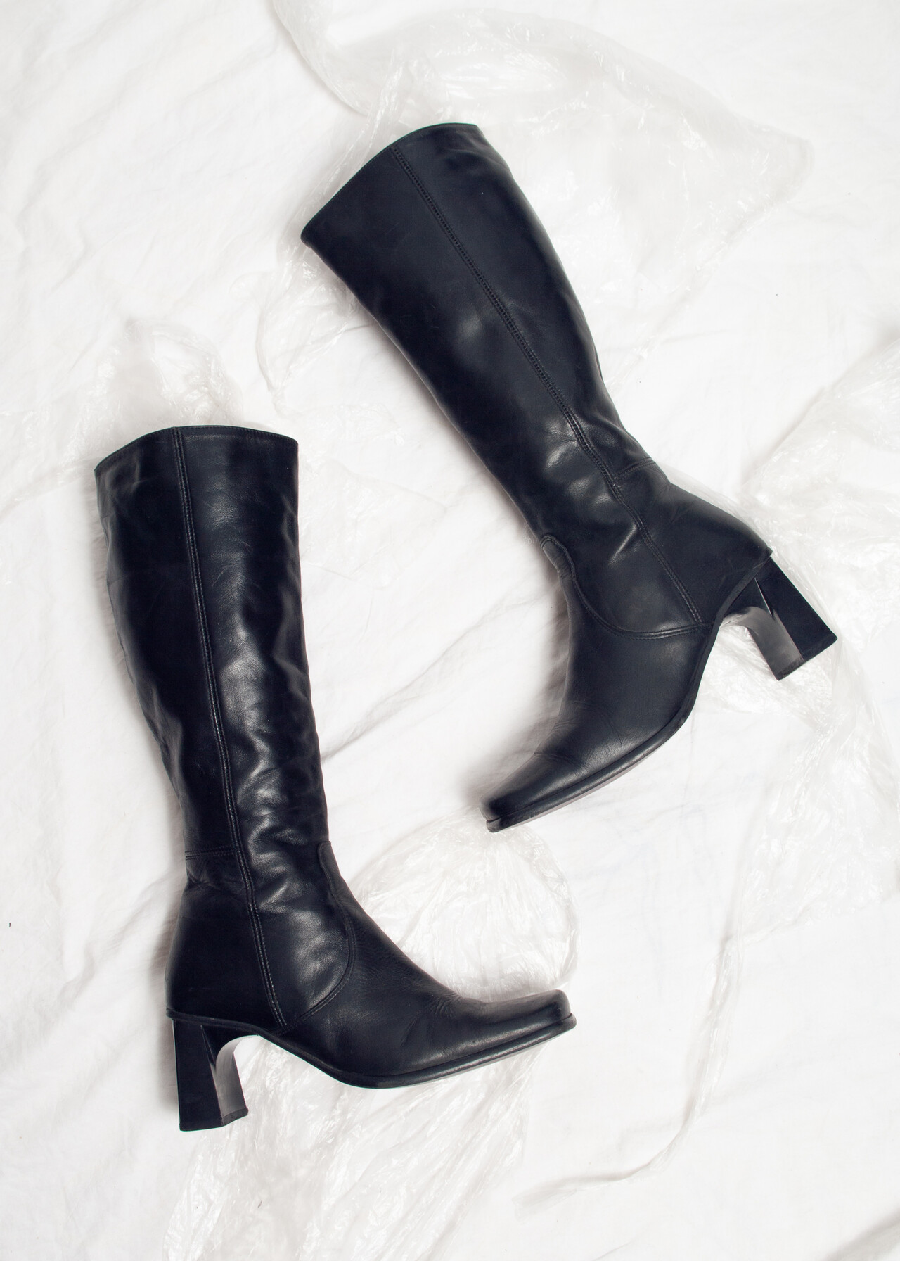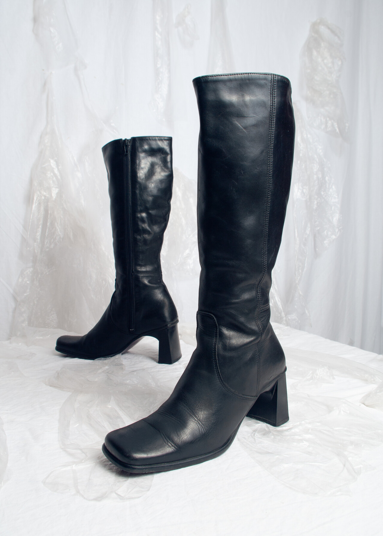 Tags: 2000s vintage, knee high boots, minimaist, office siren, real leather boots, square toe, whimsical aesthetic, y2k style accessory