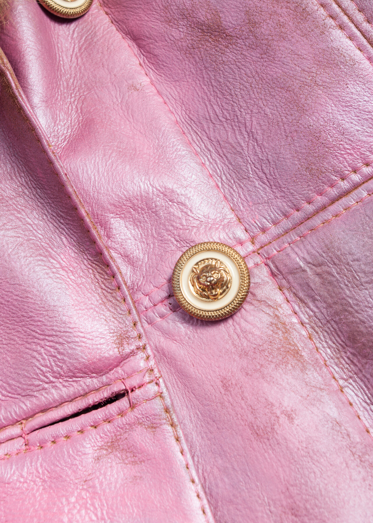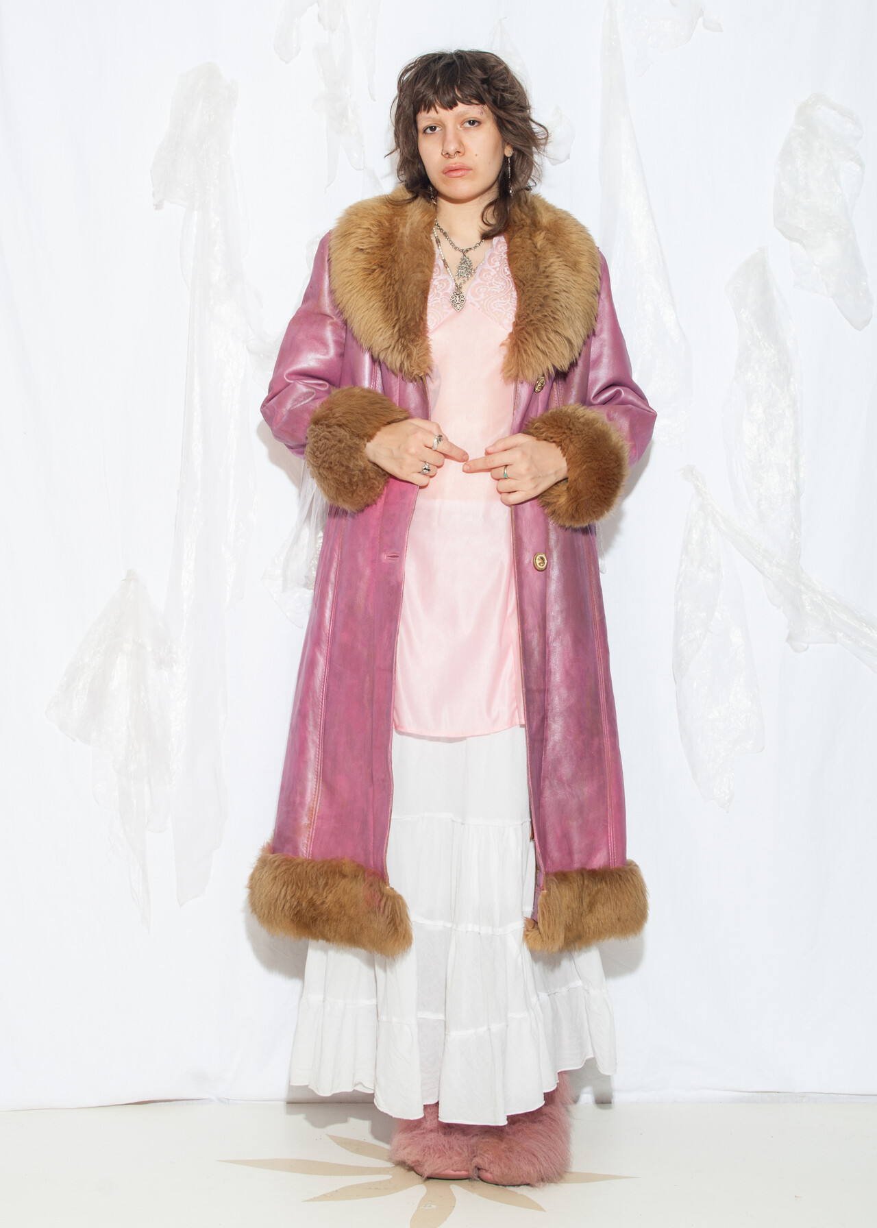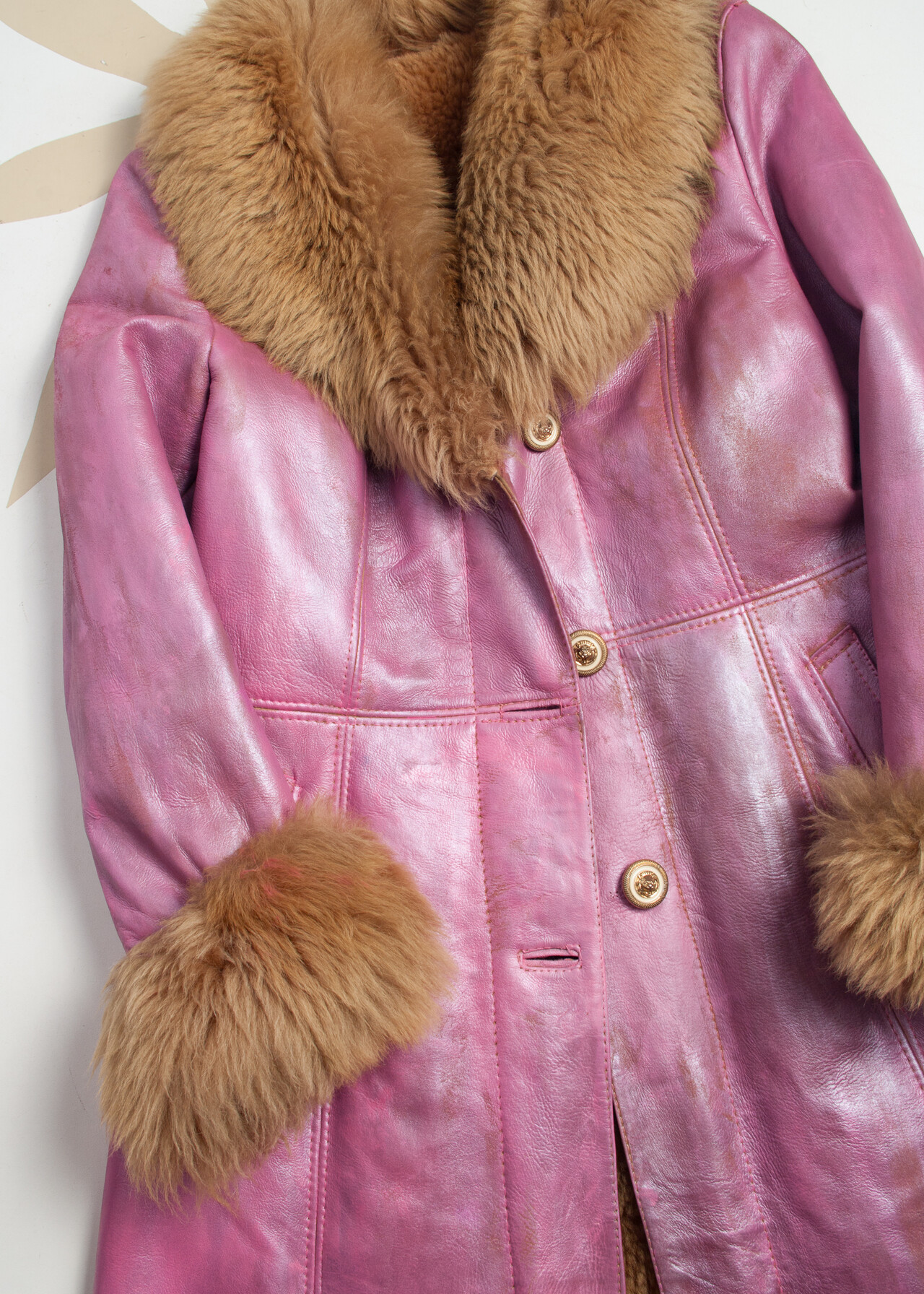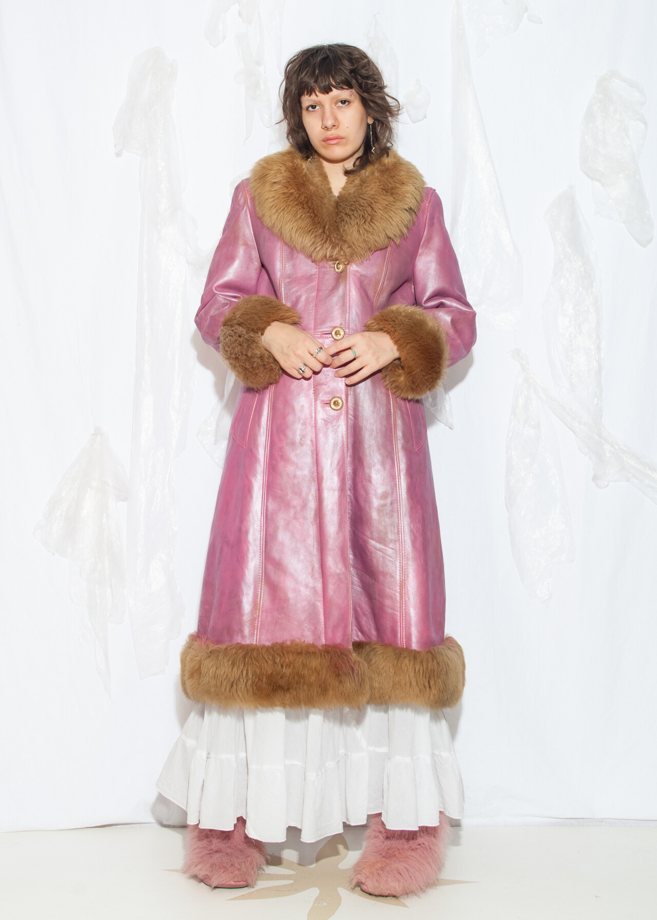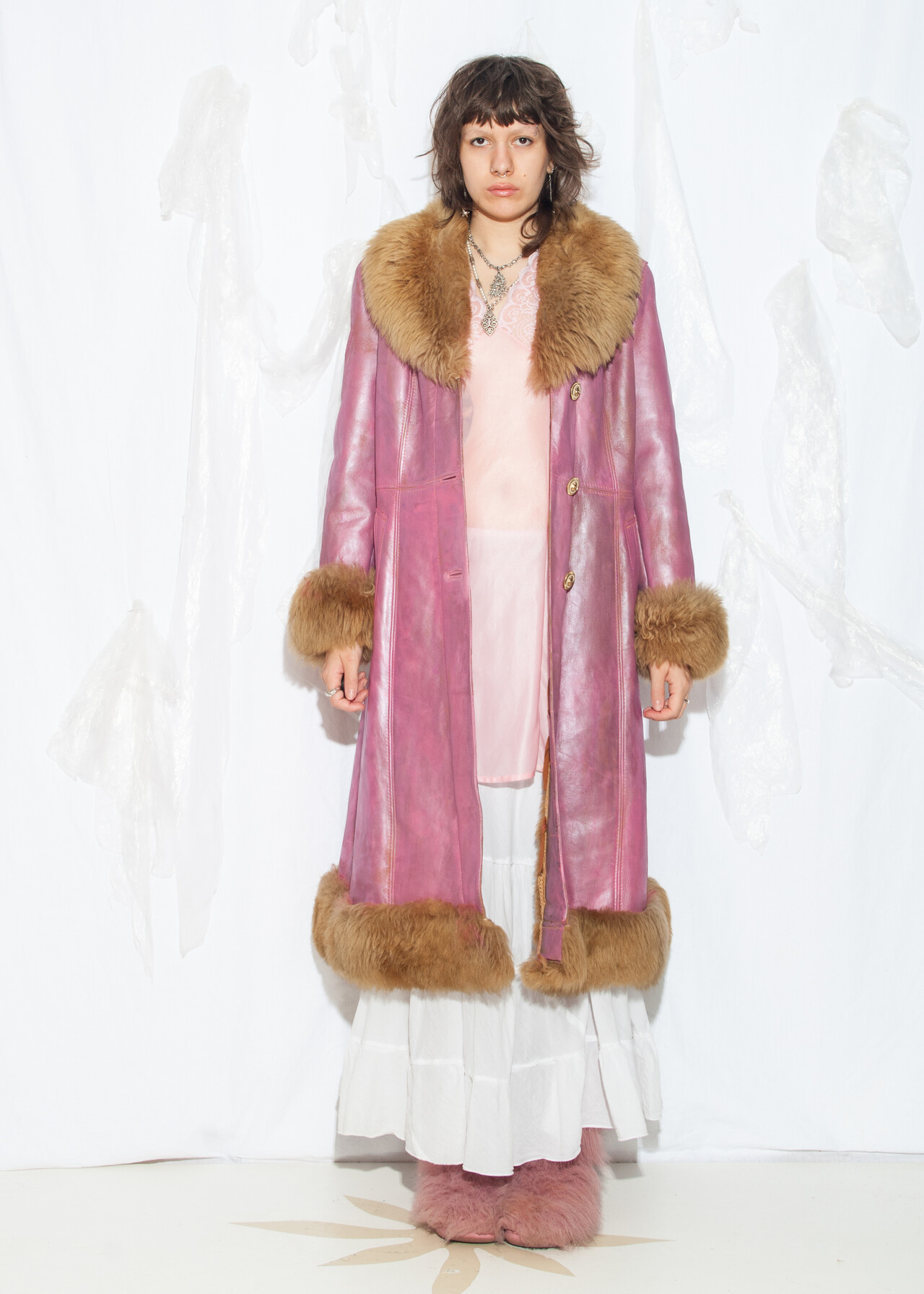 This reworked 70s vintage real shearling coat is a hand-painted pink suede masterpiece that’s like a wearable time capsule from the era of disco balls and bell bottoms.