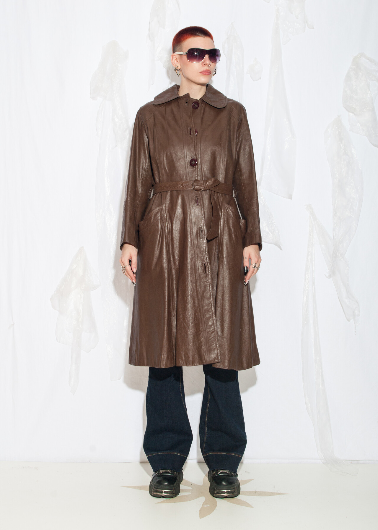 Tags: 70s vintage fashion, brown leather jacket, European vintage, leather trench coat, long leather coat, minimalist look, tie waist coat, y2k grunge outfit, y2k style clothing