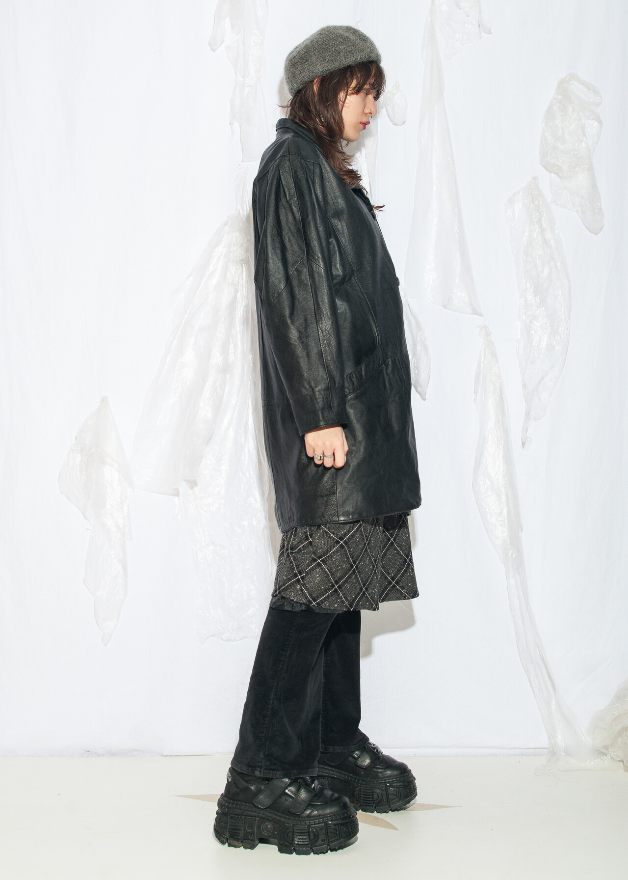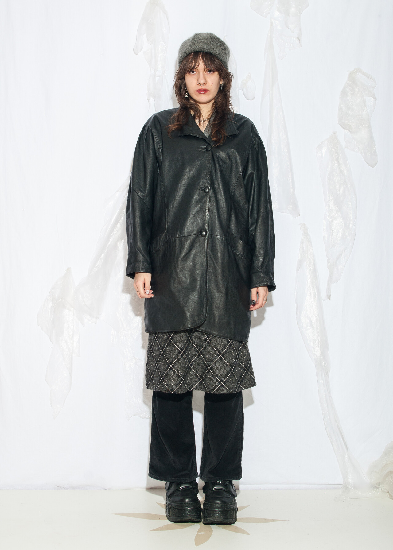 Tags: 80s vintage fashion, chunky black coat, European vintage, grunge outfit, oversized jacket, real leather coat, whimsigoth, wide shoulders, y2k style clothing