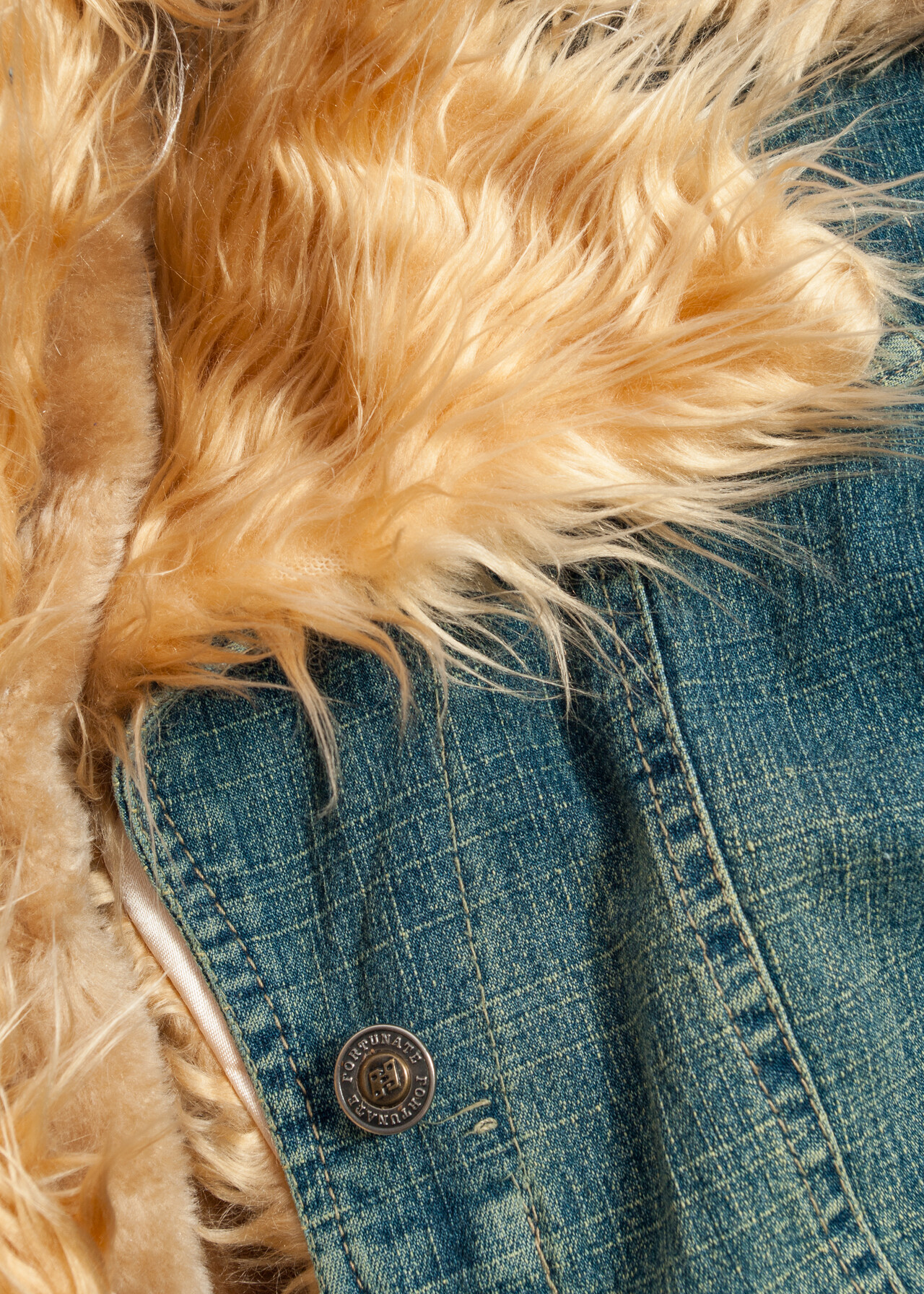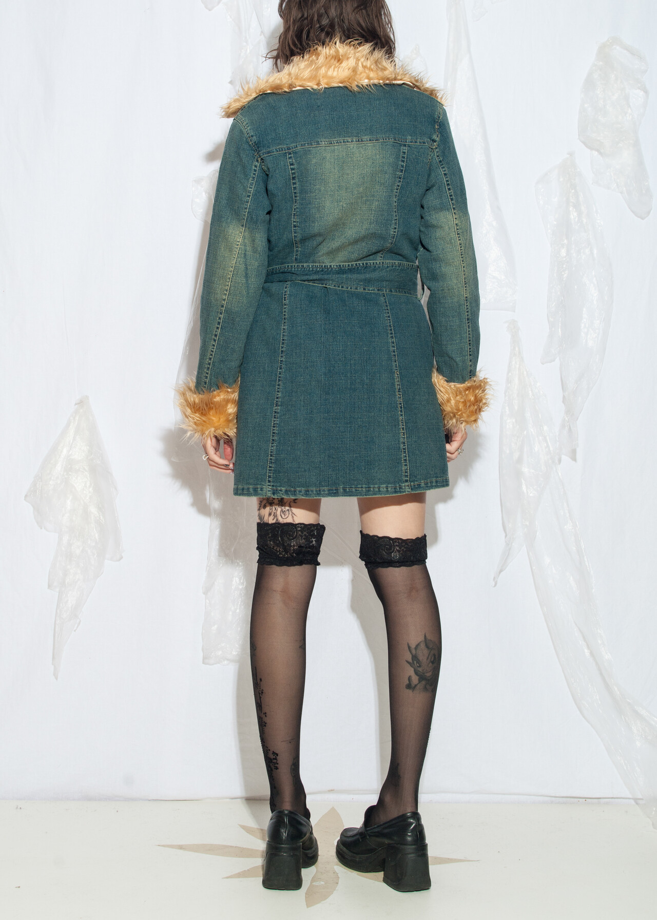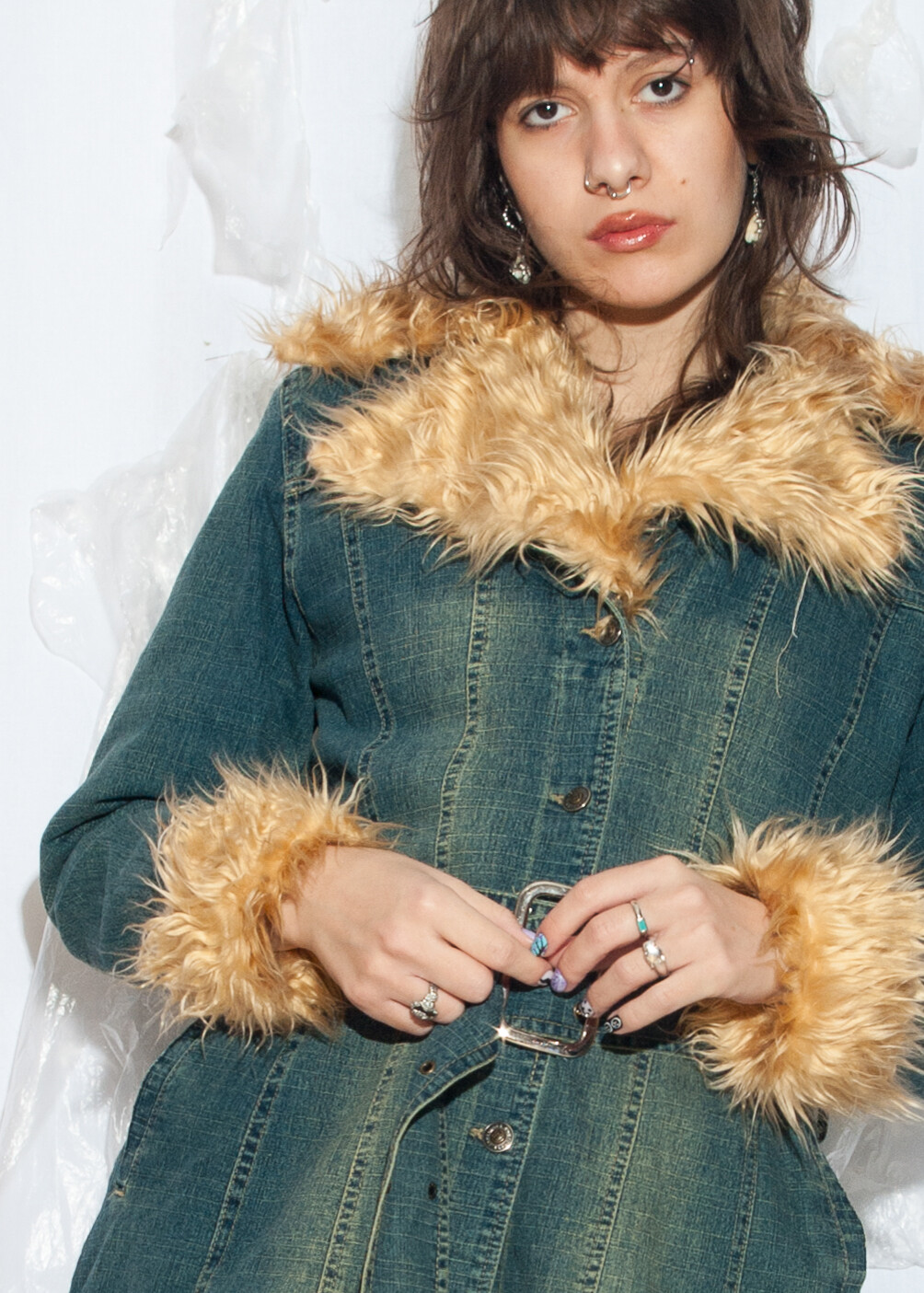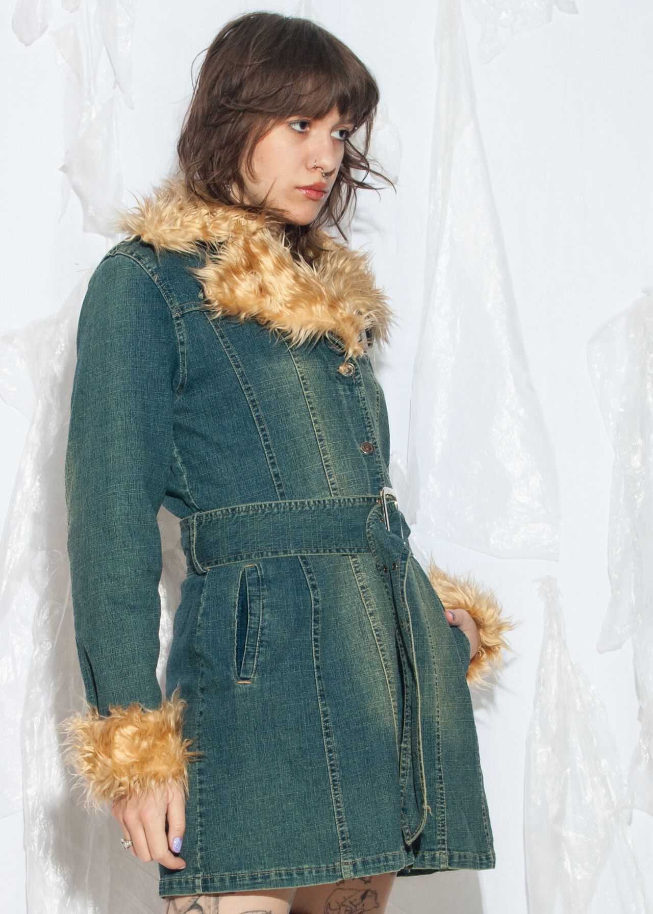 Tags: 2000s vintage style, denim trench coat, fur collar, natural fabric, Penny Lane coat, removable collar, slim fit jacket, stonewashed, whimsigoth, y2k grunge outfit