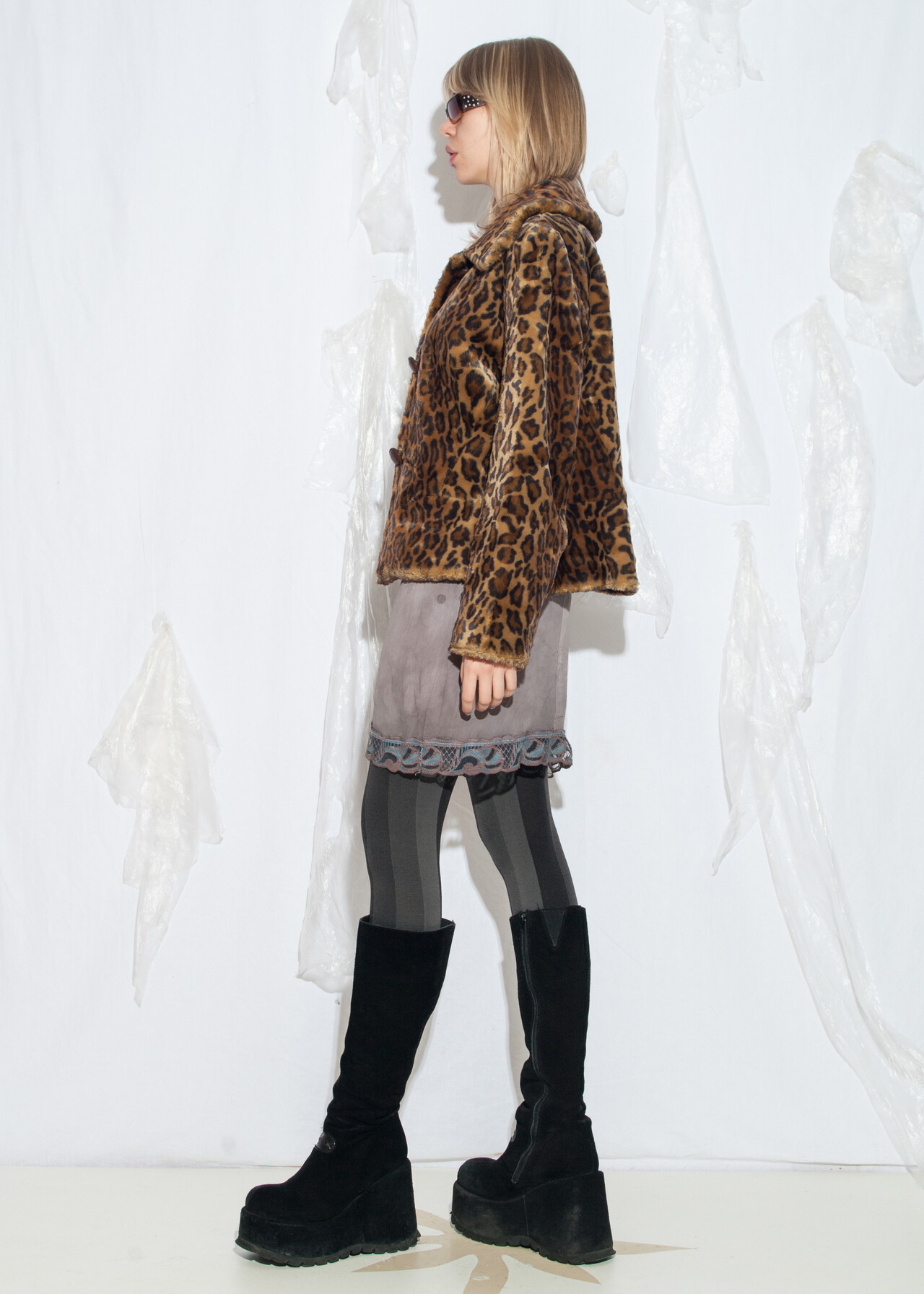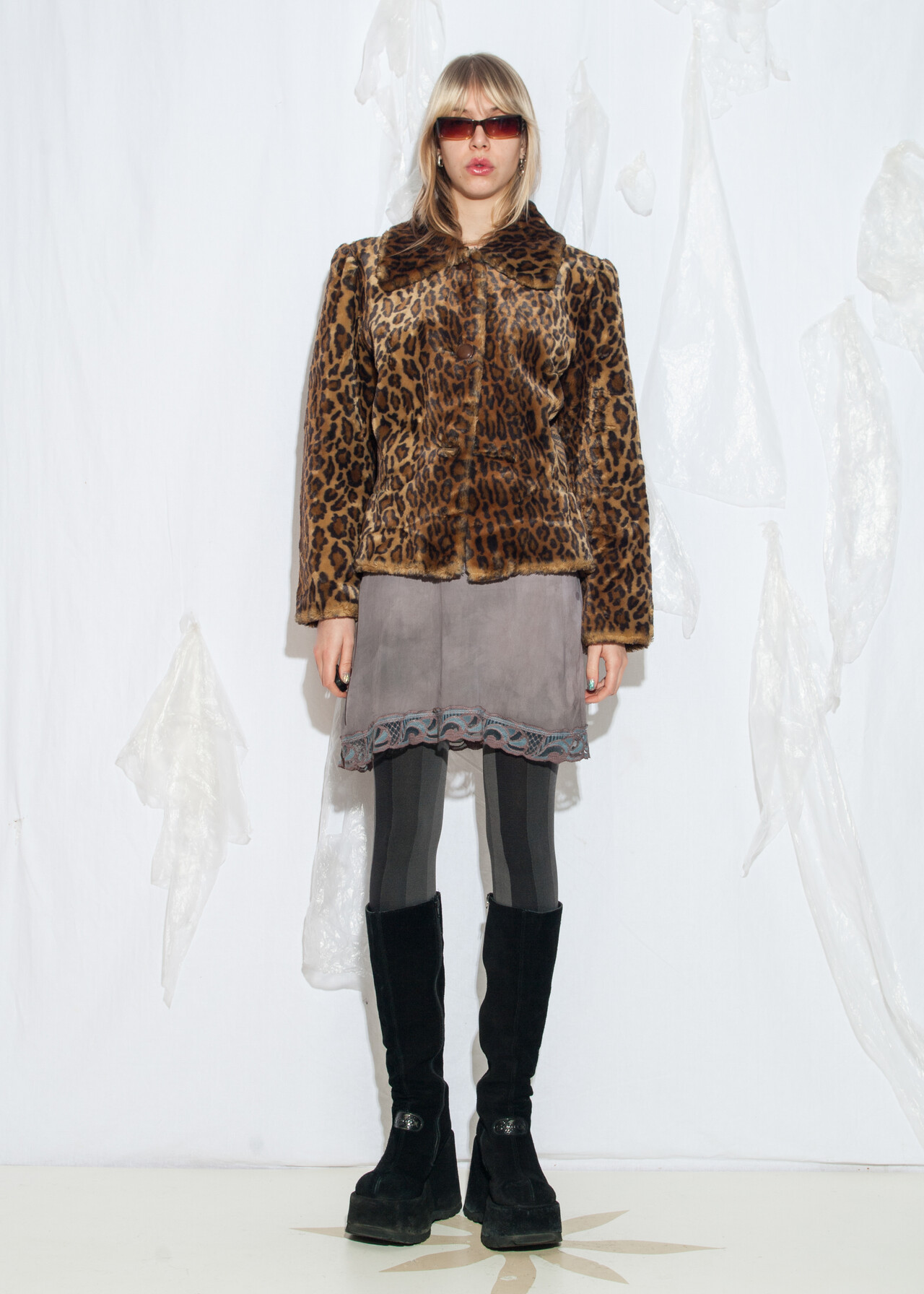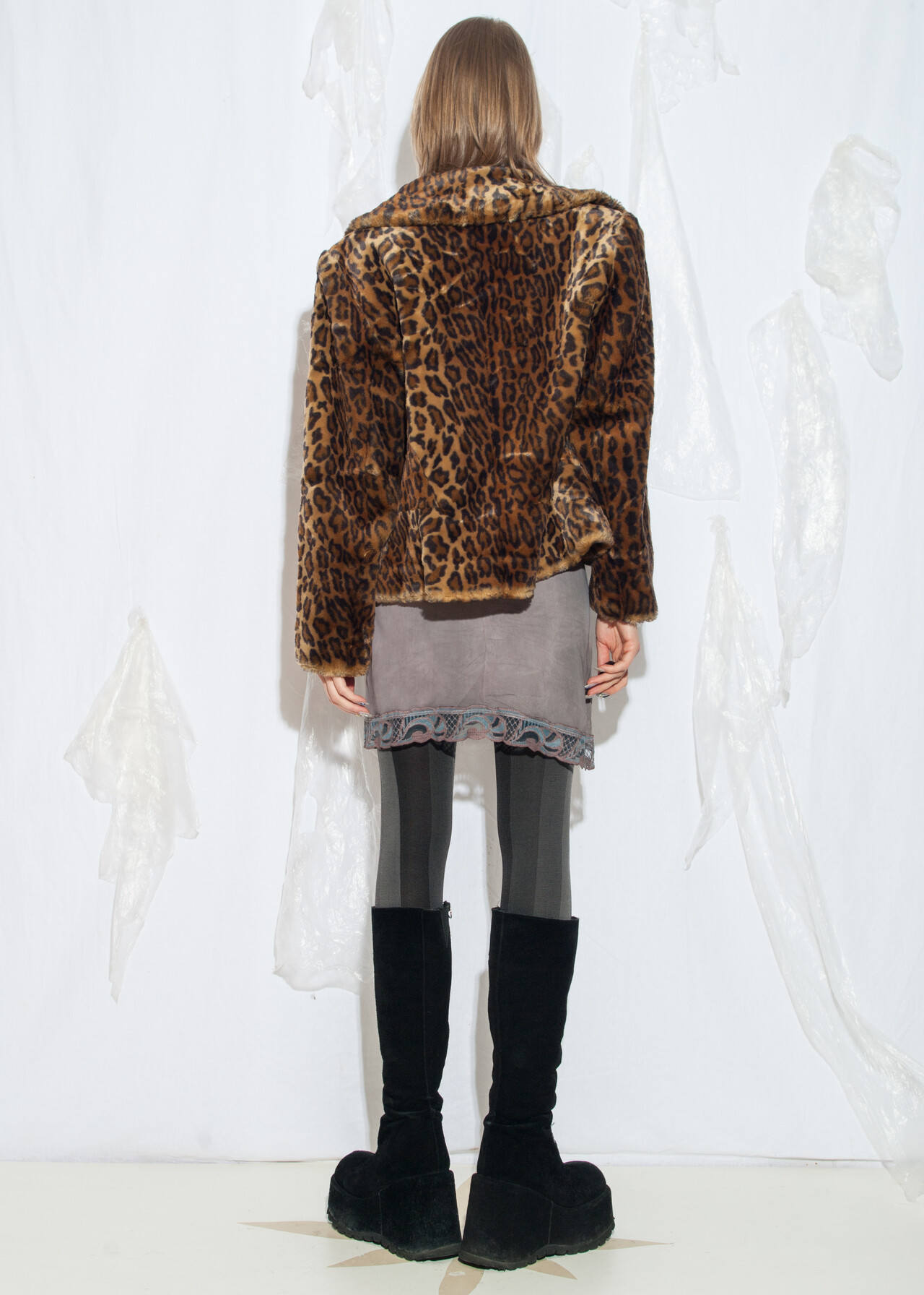 Tags: 90s vintage fashion, European vintage, faux fur jacket, indie sleaze, leopard pattern, made in Italy, ocelot print, slim fit coat, y2k grunge outfit