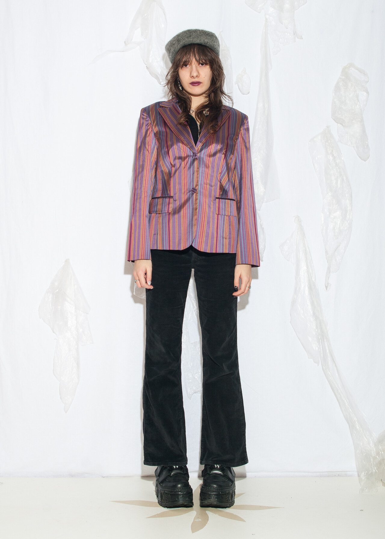 Tags: 90s vintage fashion, clown outfit, clowncore aesthetic, European vintage, grunge look, natural fabric, oversized suit, pure silk, striped blazer, y2k style clothing