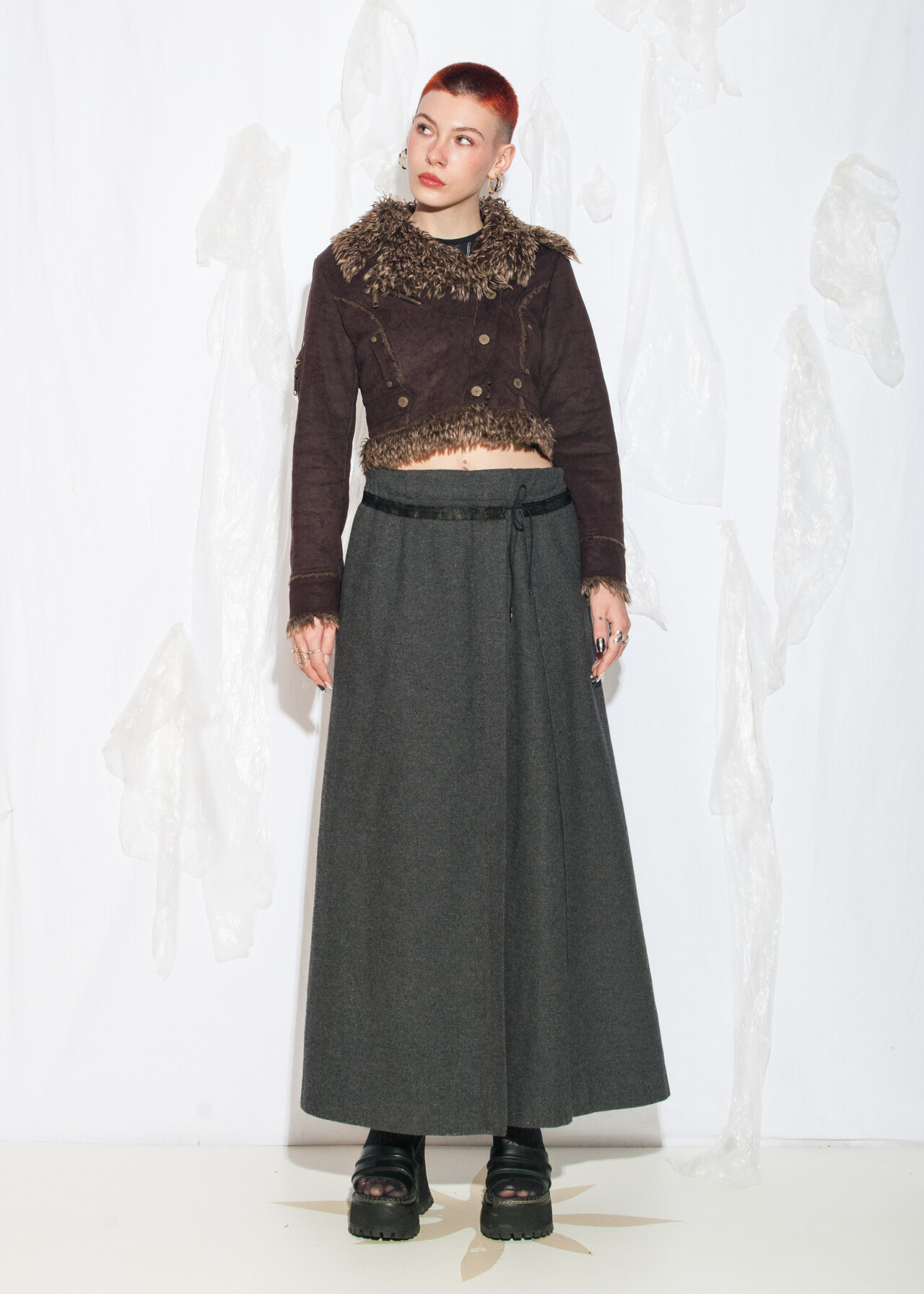 Tags: 00s streetwear, 2000s style clothing, brown suede, faux fur crop coat, furry jacket, shearling coat, whimsigoth, y2k grunge outfit, y2k vintage fashion