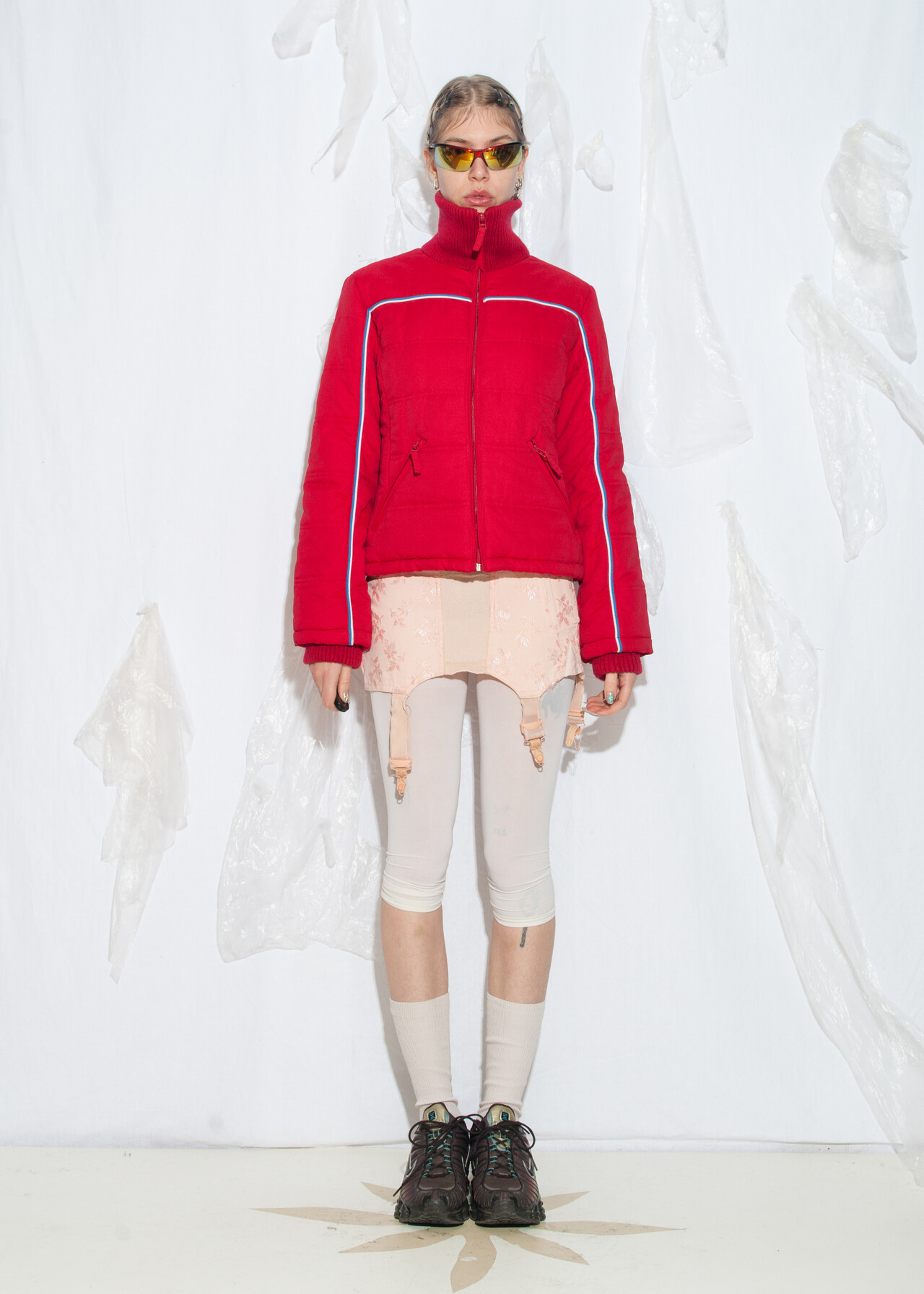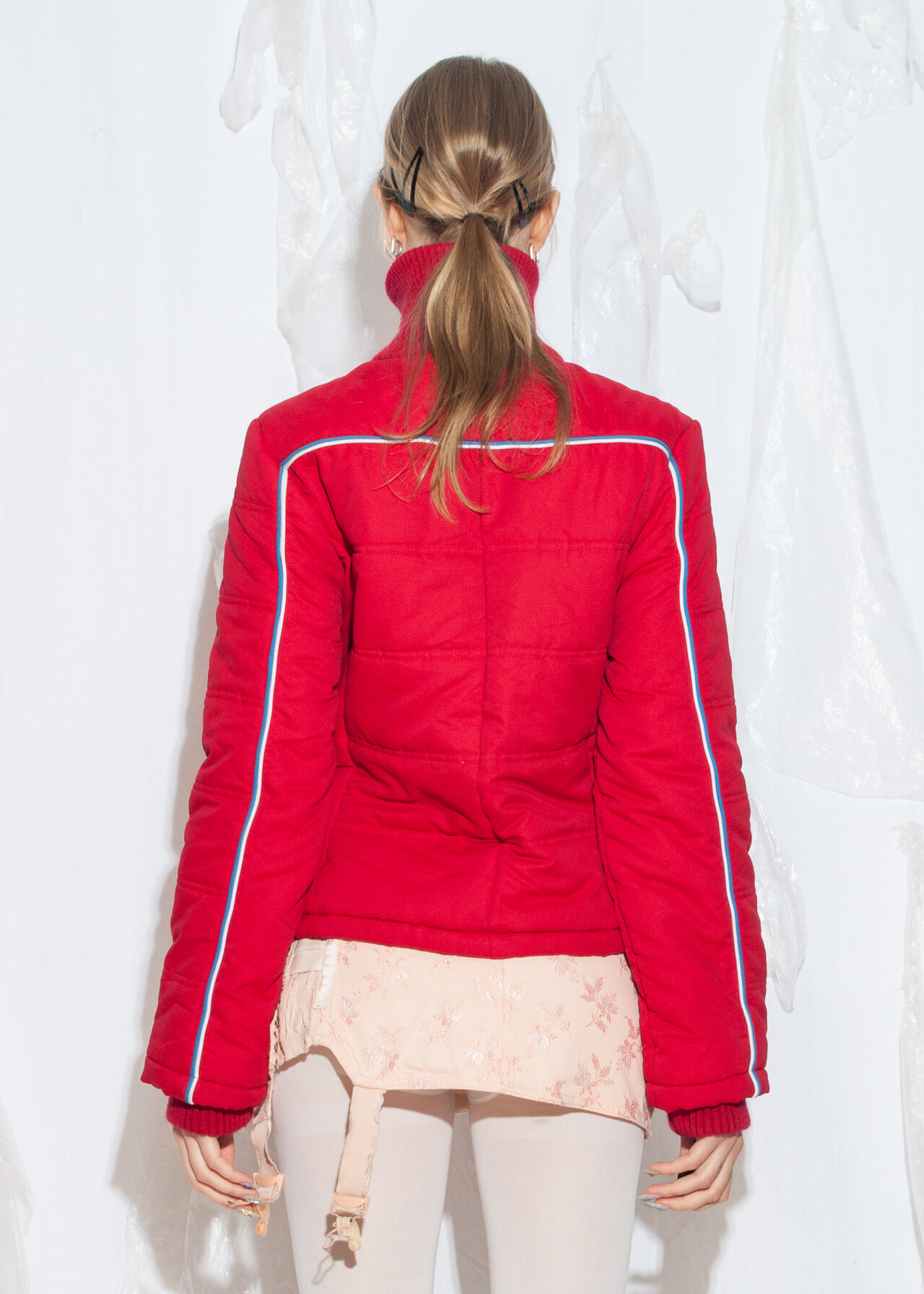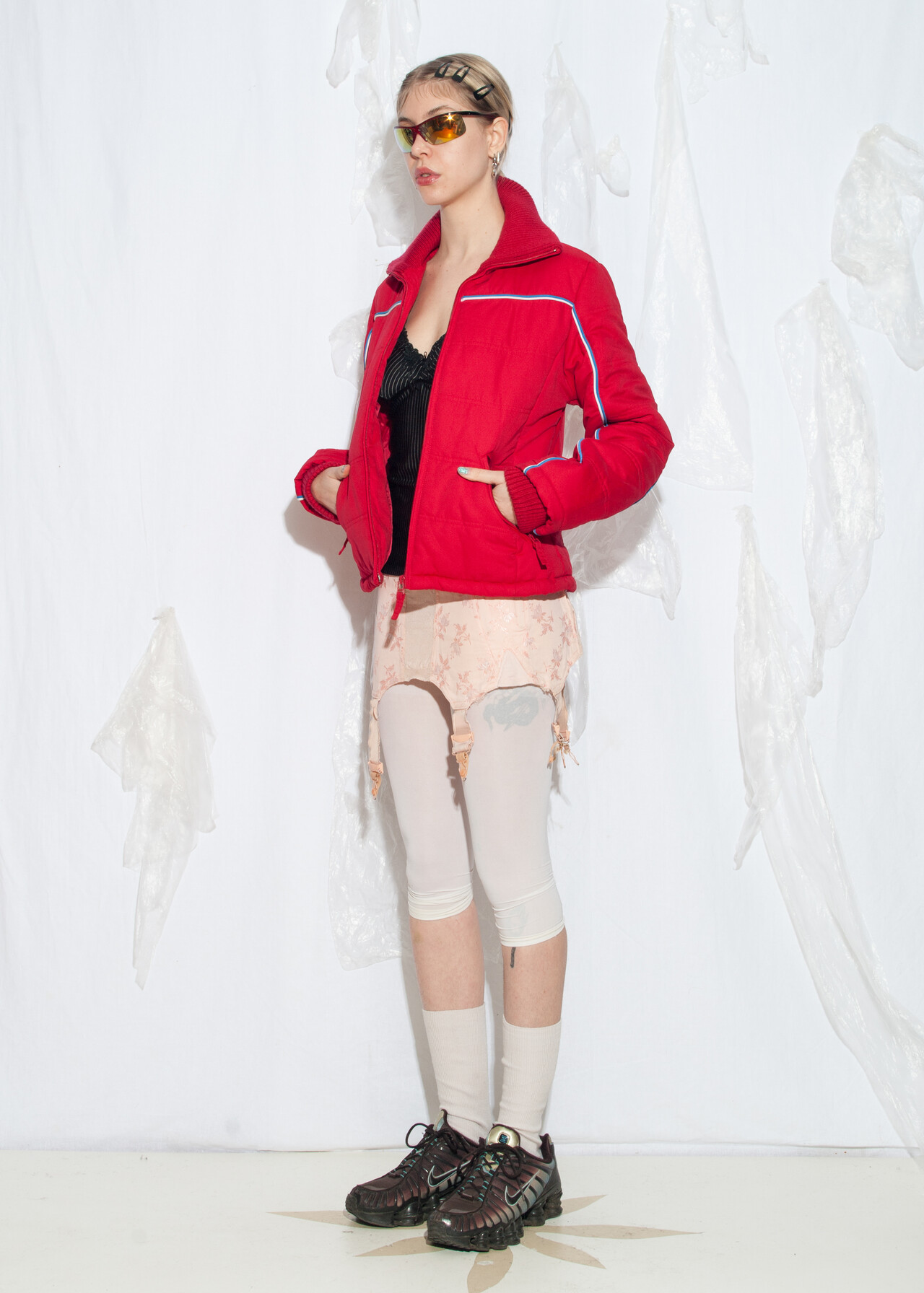 Tags: 00s sportswear, 2000s style fashion, fitted red crop jacket, grunge outfit, puffer jacket, ski jacket, sporty coquette, streetwear look, windbreaker, y2k vintage clothing