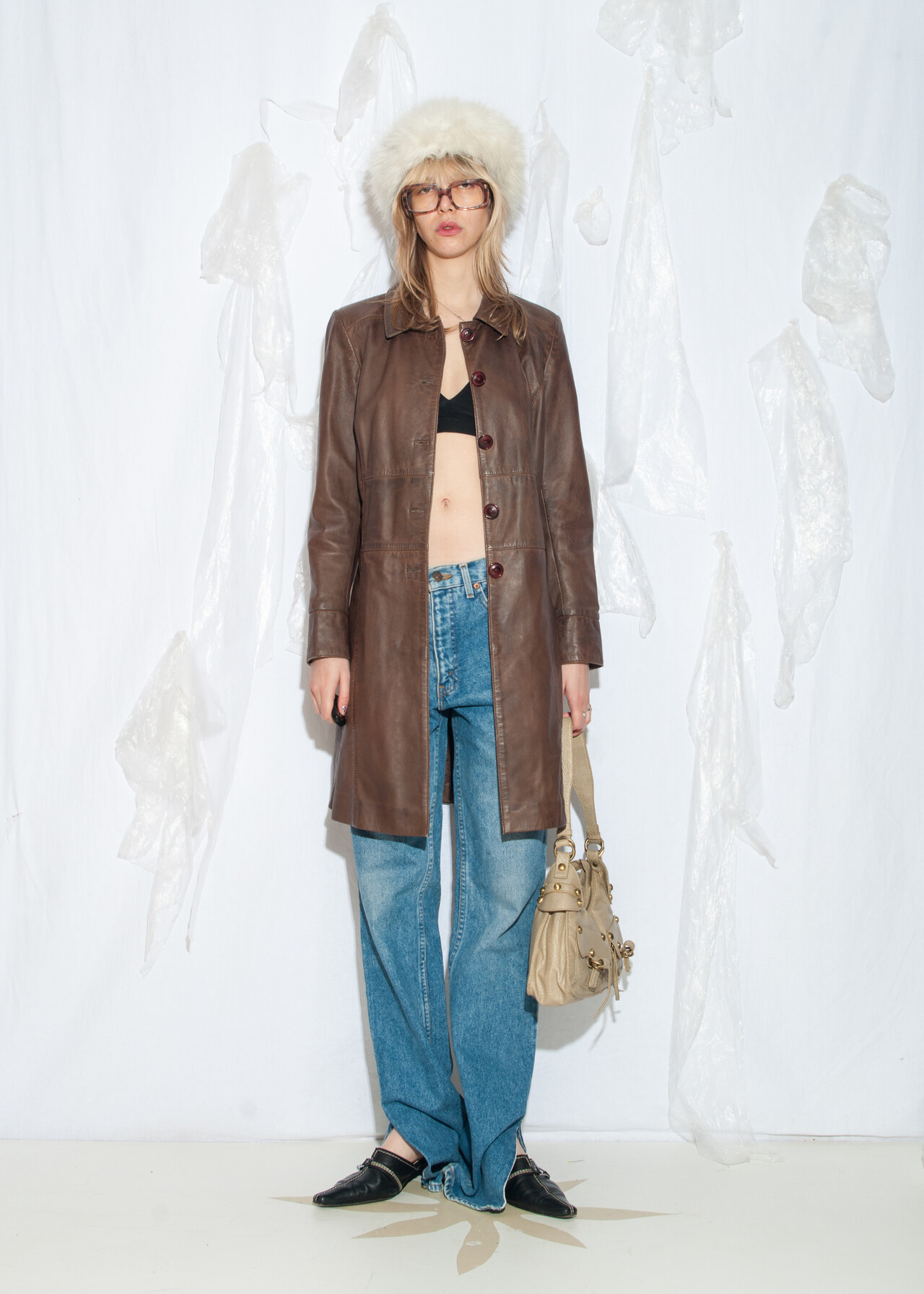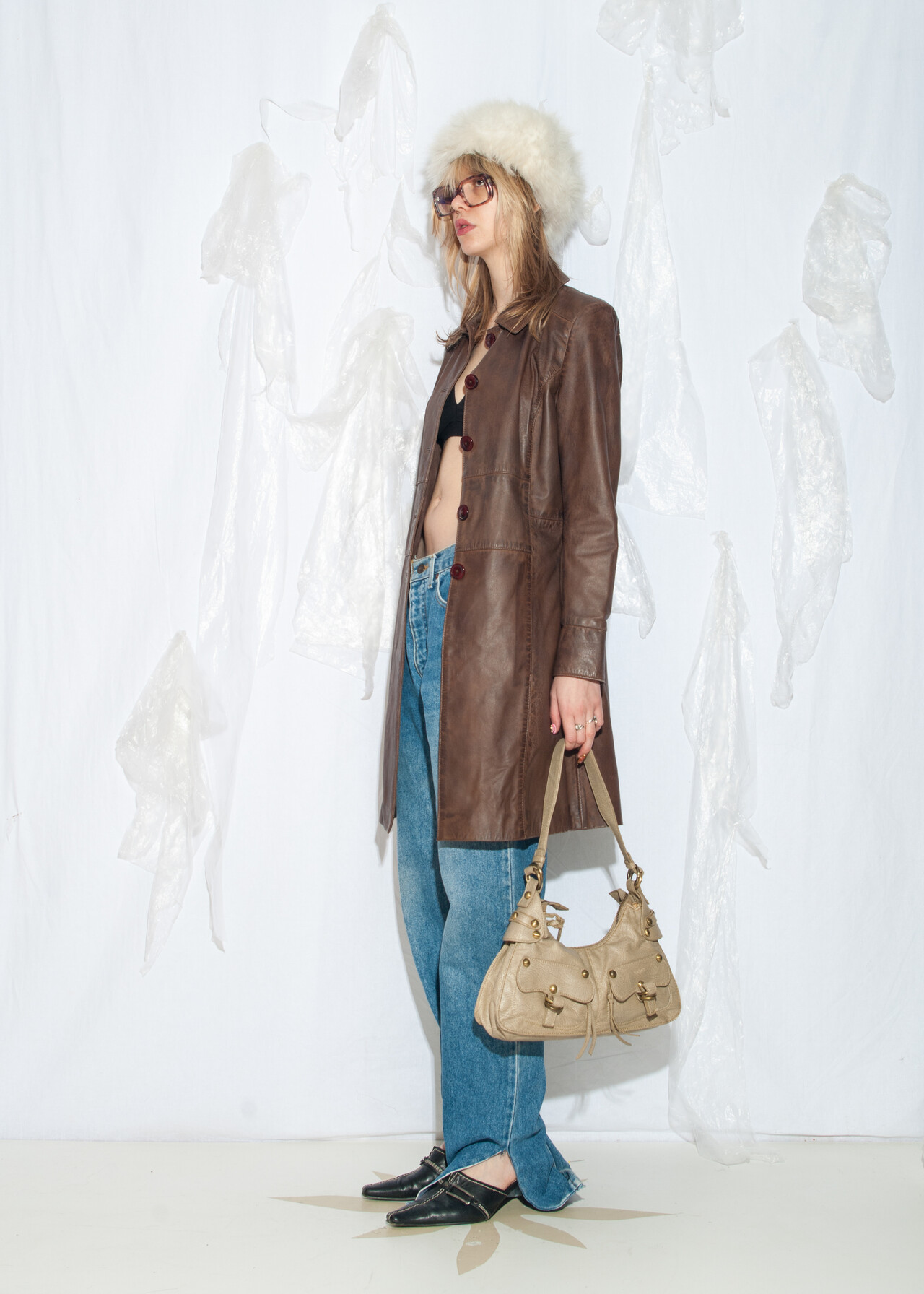 This Y2K vintage coat is your ticket to mastering the 2000s grunge look while feeling like a whimsigoth icon in a real leather embrace.