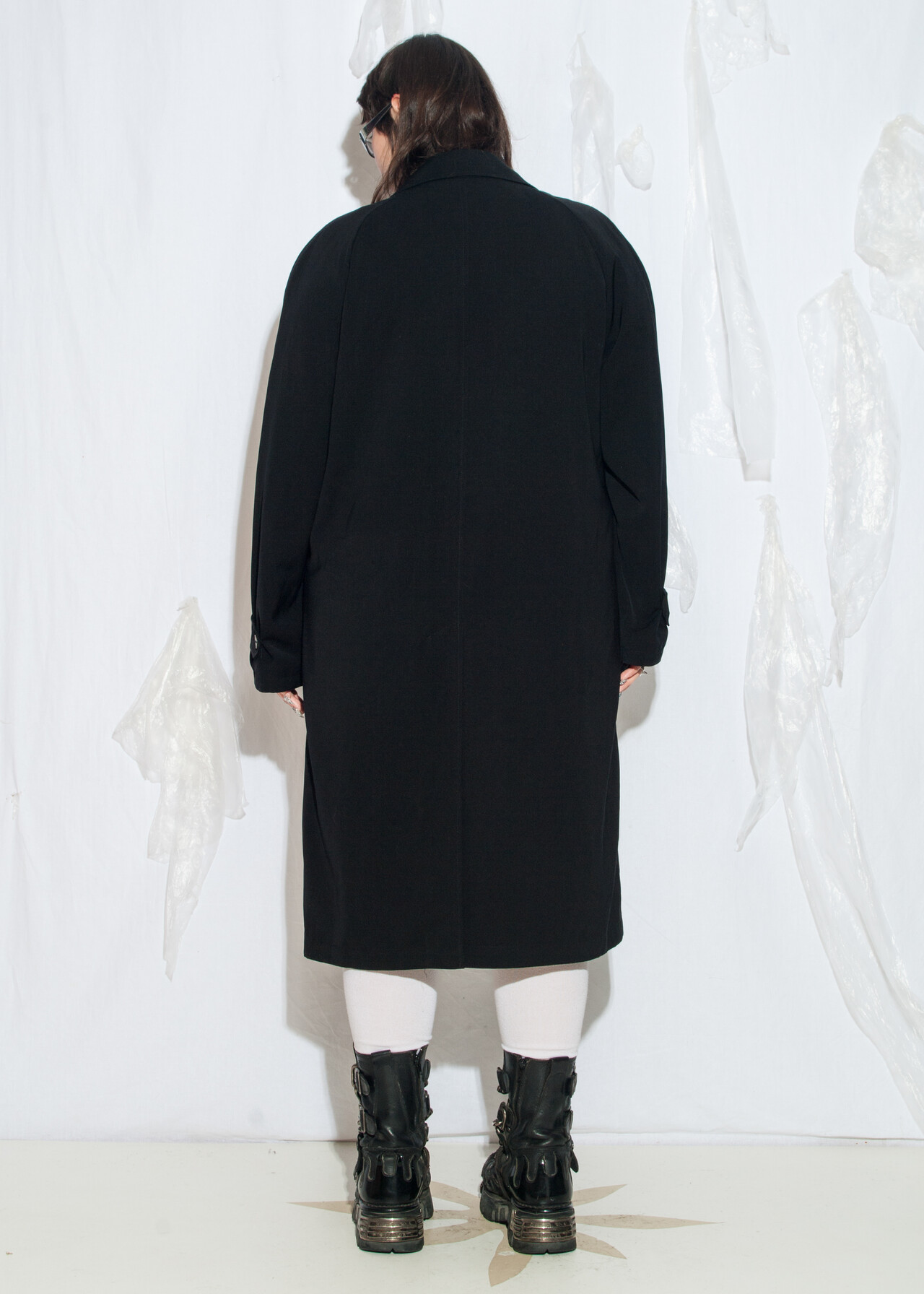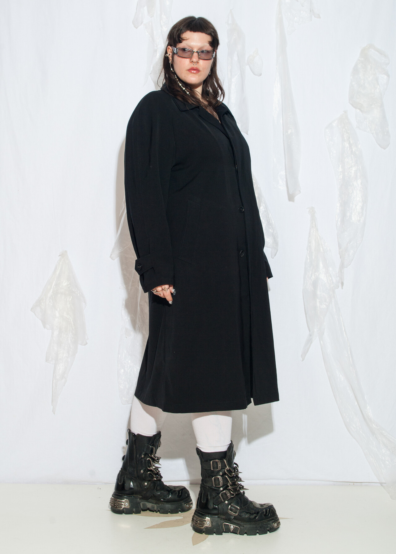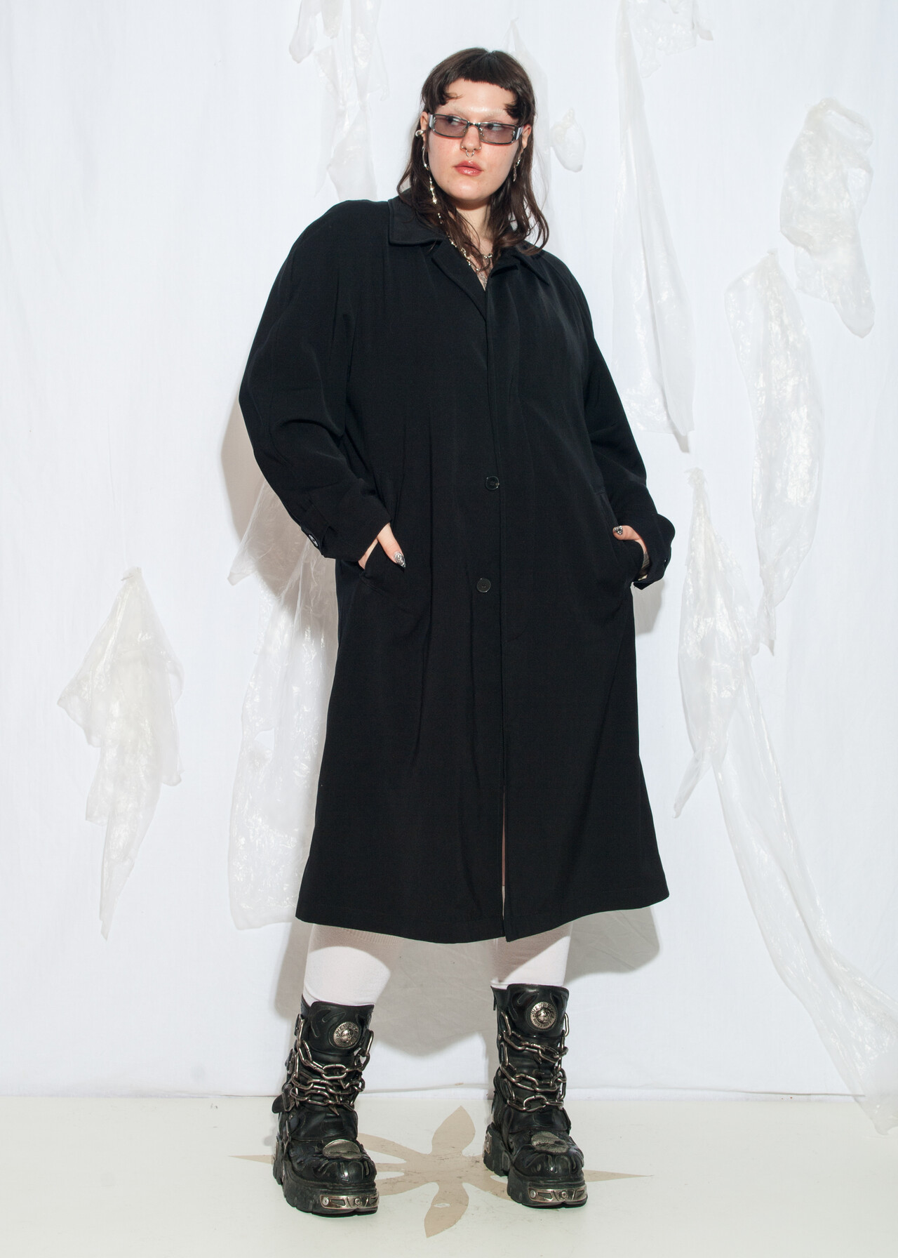 Tags: 2000s style fashion, black trench coat, gender neutral, made in Austria, men's coat, oversized coat, soft fabric, y2k grunge outfit, y2k vintage clothing