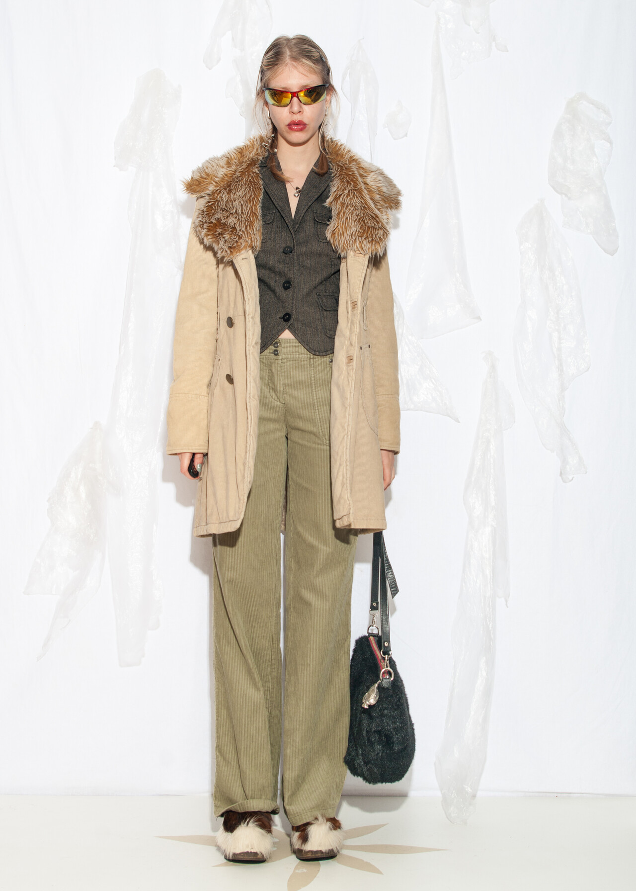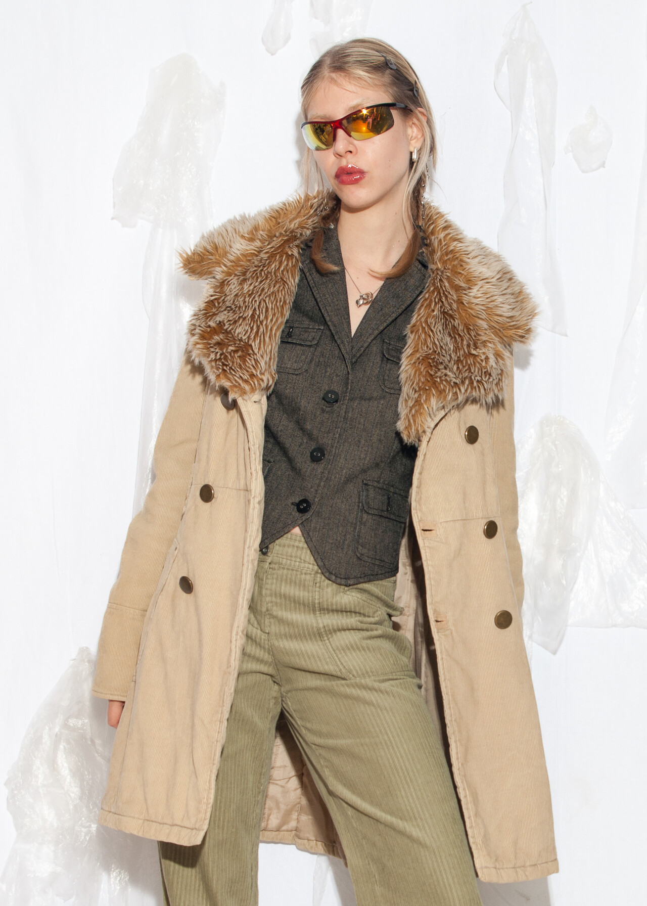 Tags: 2000s style clothing, beige shaggy coat, corduroy jacket, double breasted coat, fur collar coat, long jacket, natural cotton, shaggy furry jacket, y2k vintage fashion