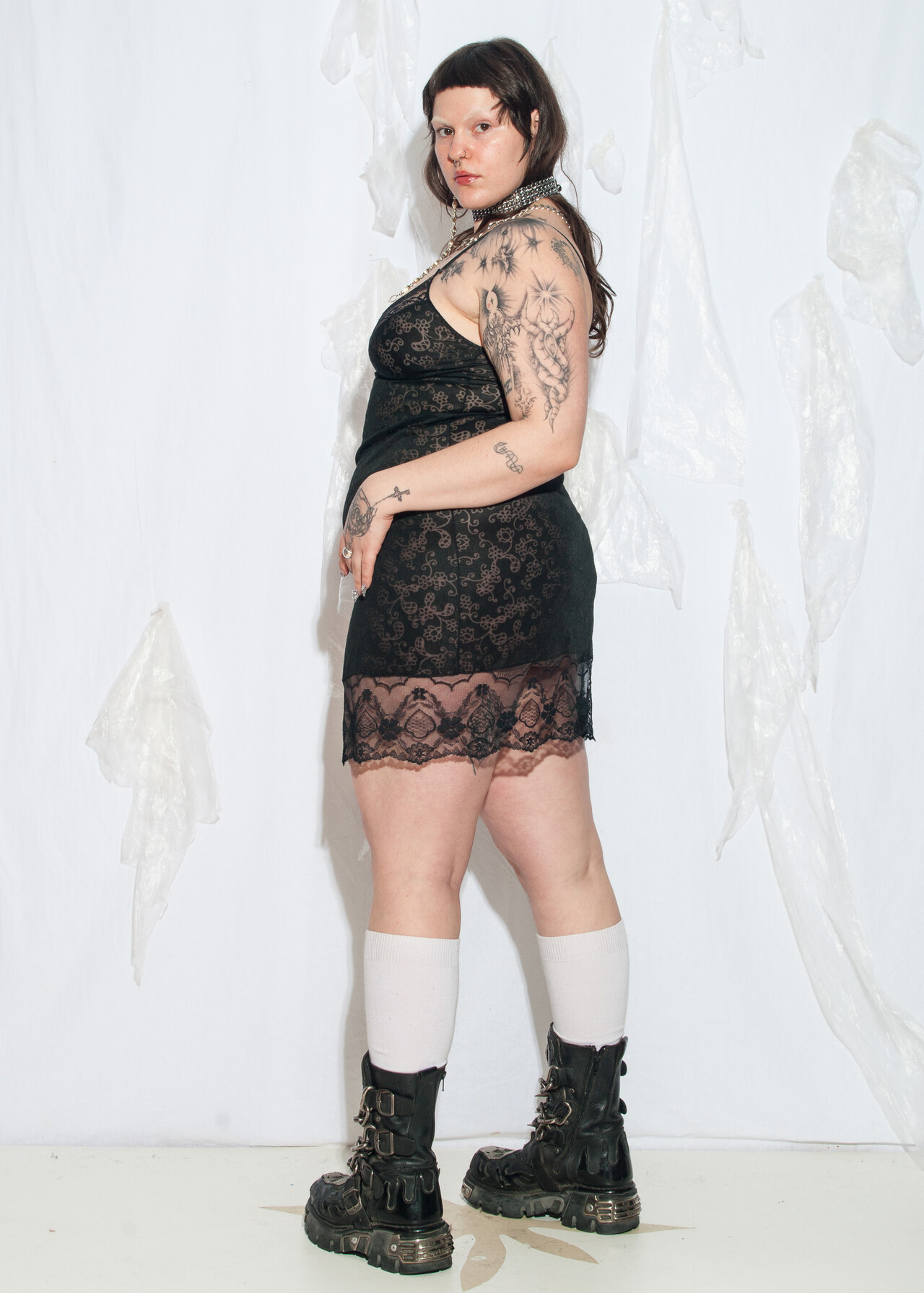 This 70s vintage slip dress is a whimsigoth dream with its lace lingerie vibes, perfect for channeling your inner glam icon. Slide into this black mini and let the 70s vintage fashion transport you to a time when disco and drama ruled the night!