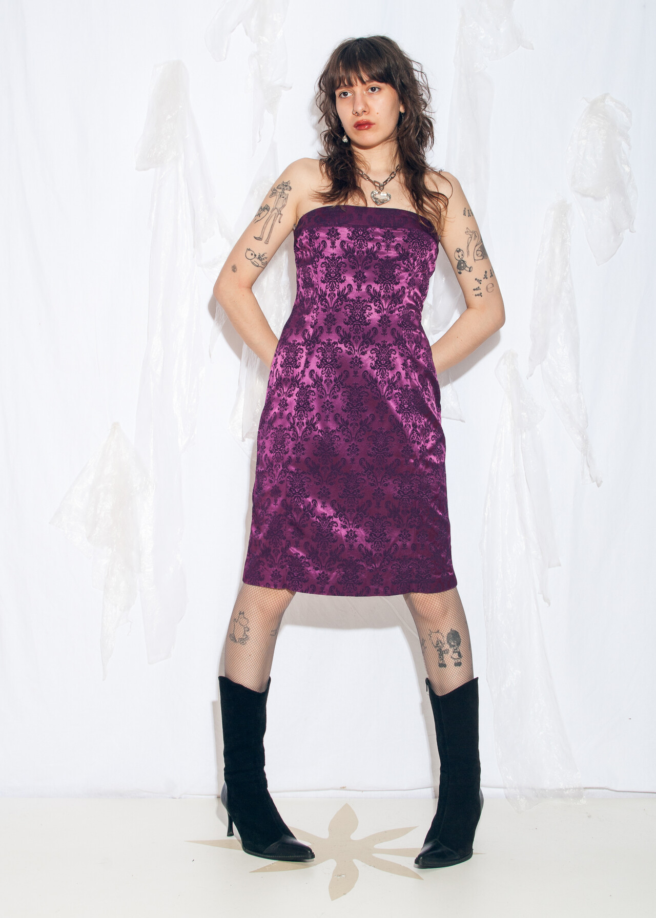 Tags: 2000s style clothing, evening dress, metallic purple, occasionwear, partywear, prom tube dress, sleeveless dress, twilight style, whimsigoth, y2k vintage fashion