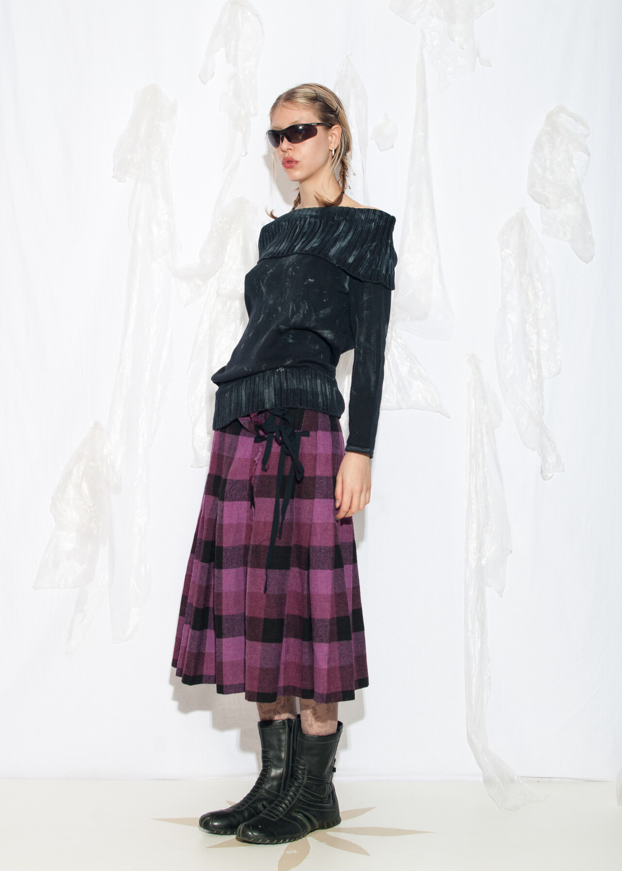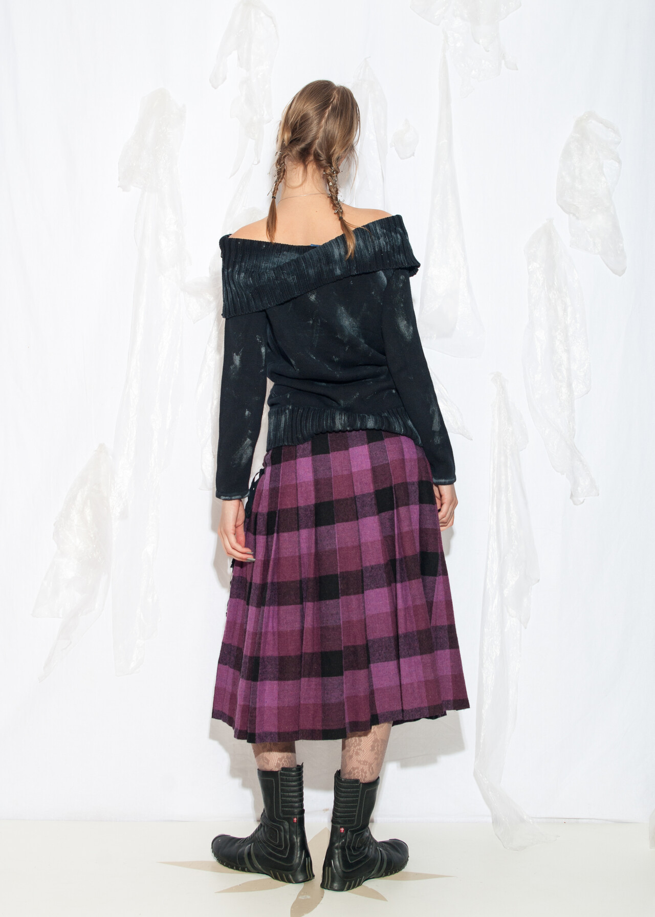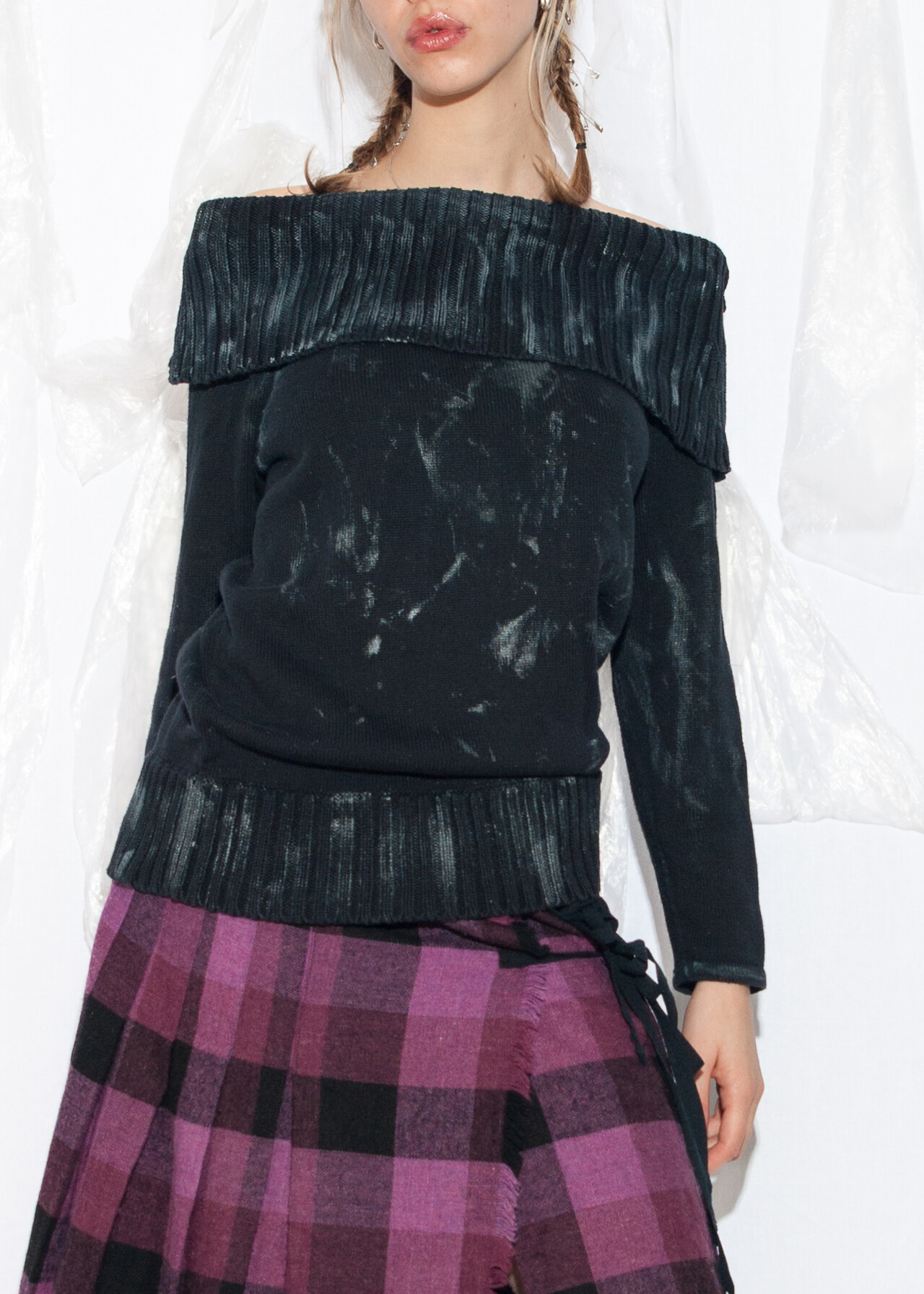Tags: 00s streetwear, 2000s style clothing, cotton knitwear, dirty painted top, hand-painted, knitted sweatshirt, off shoulder jumper, reworked, upcycled pullover, wearable art, whimsigoth, y2k grunge outfit, y2k vintage fashion