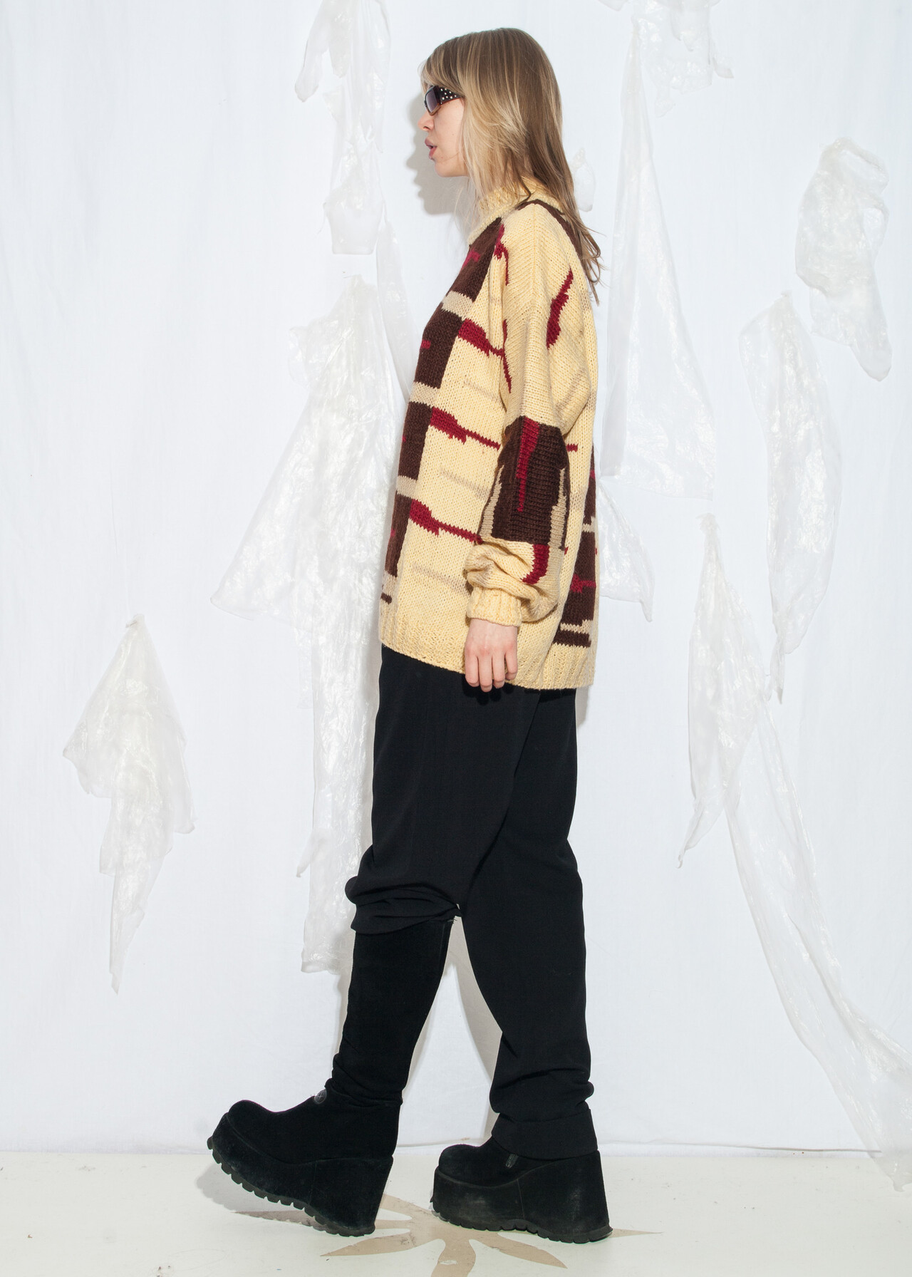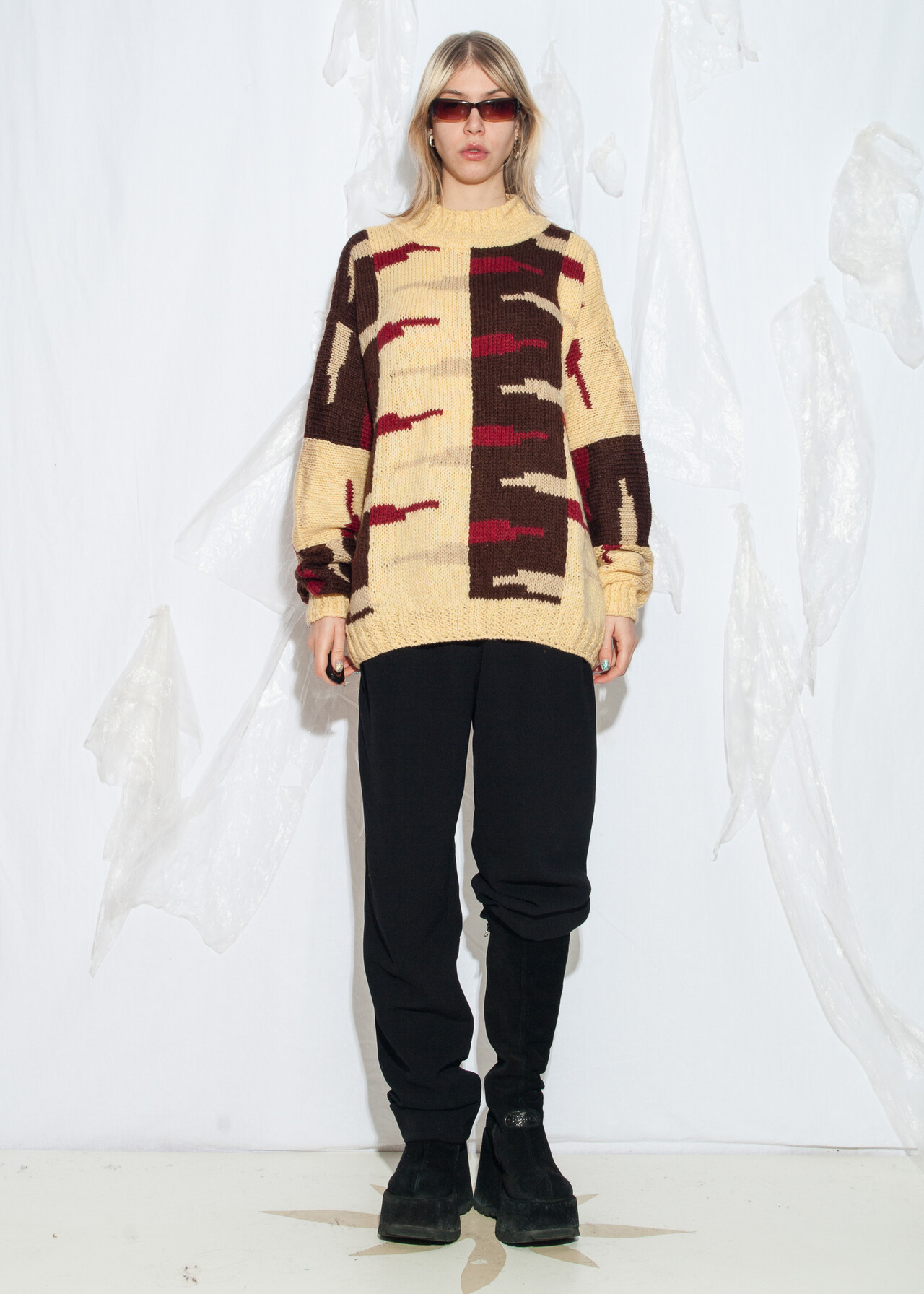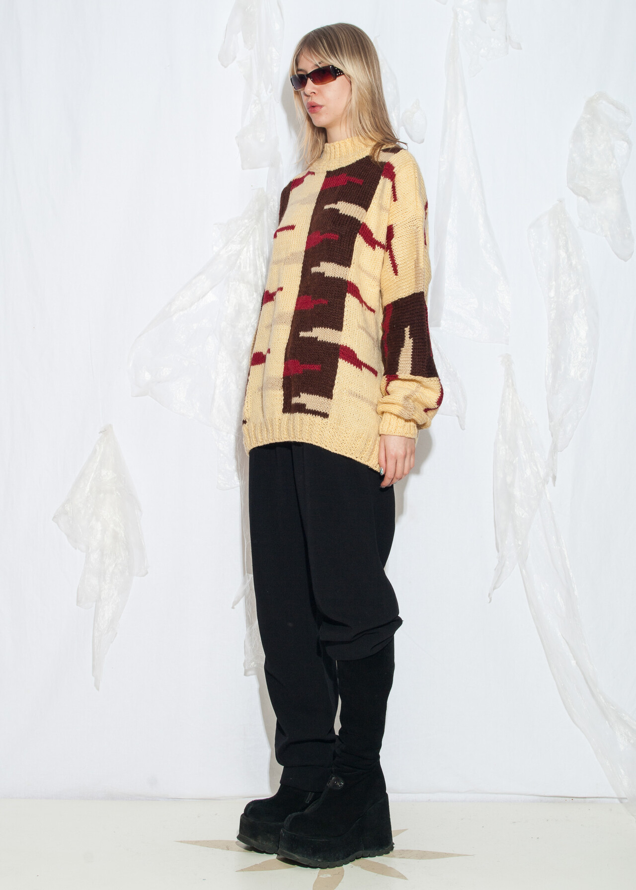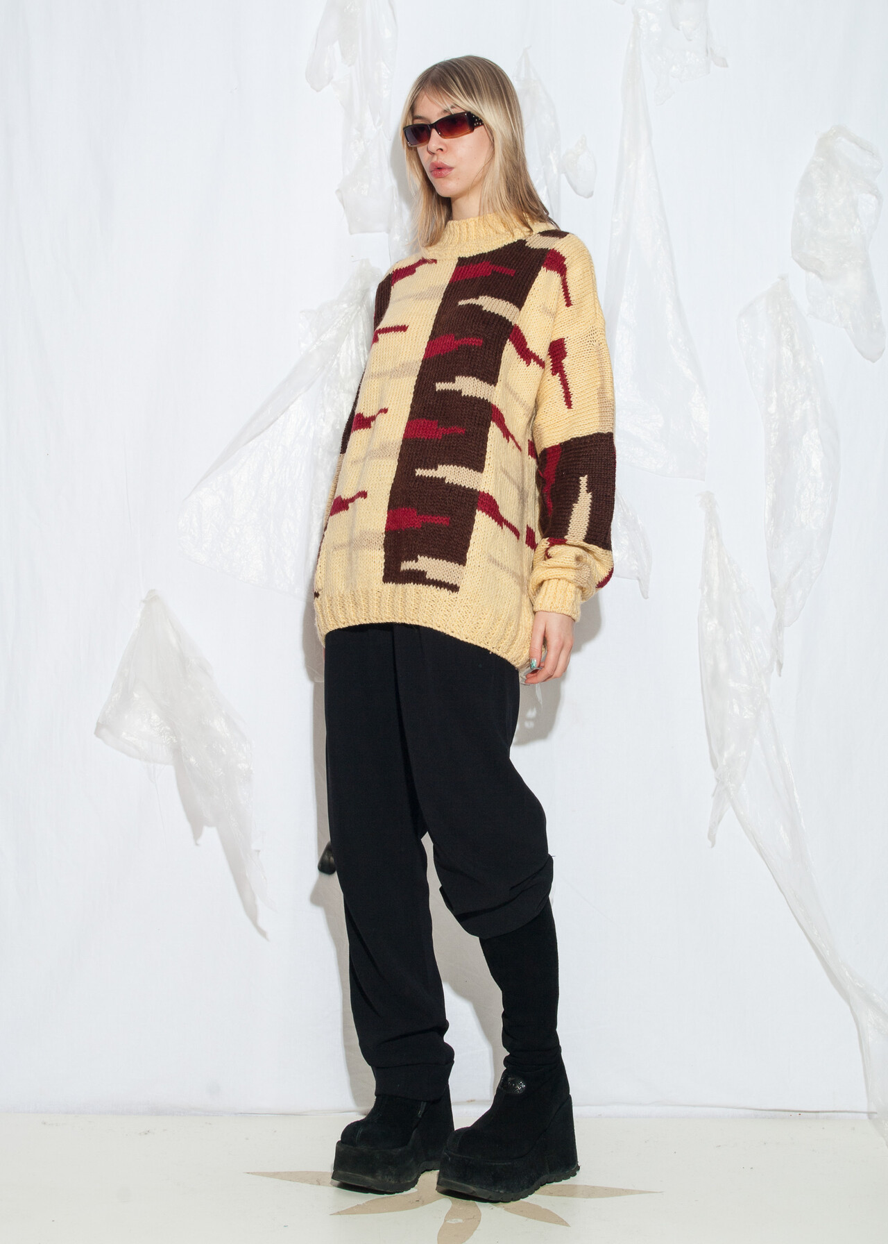 Tags: 80s vintage clothing, abstract pattern, grunge outfit, hand knitted, handmade, one-off sweater, oversized, wool jumper