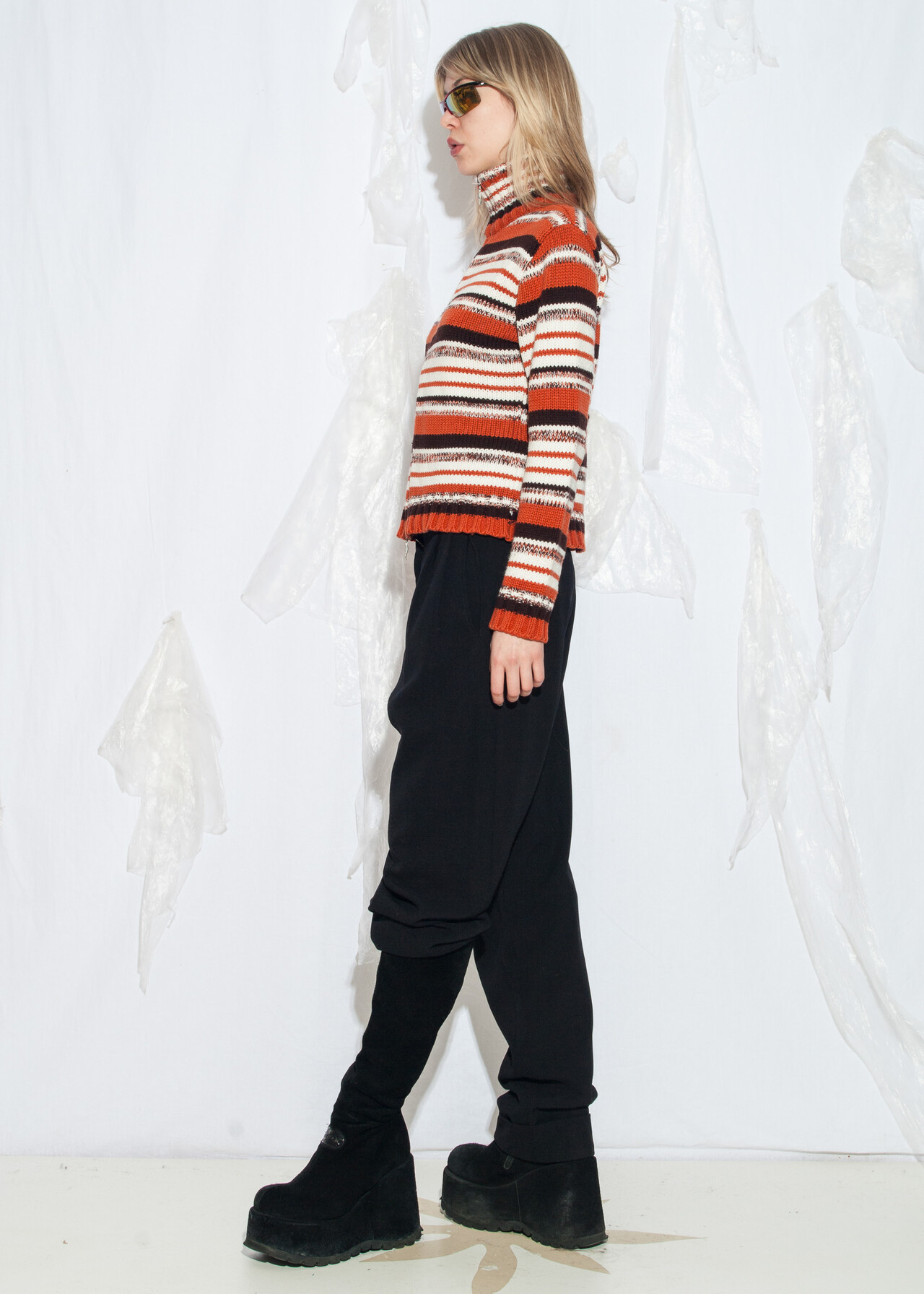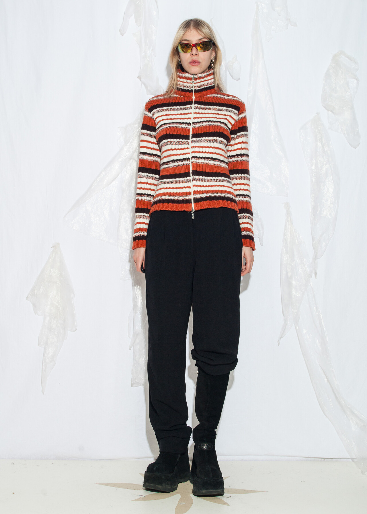 This 90s vintage knit cardigan is your ticket to high neck, two-way zip glory with stripes that scream nostalgia louder than your favorite mixtape.