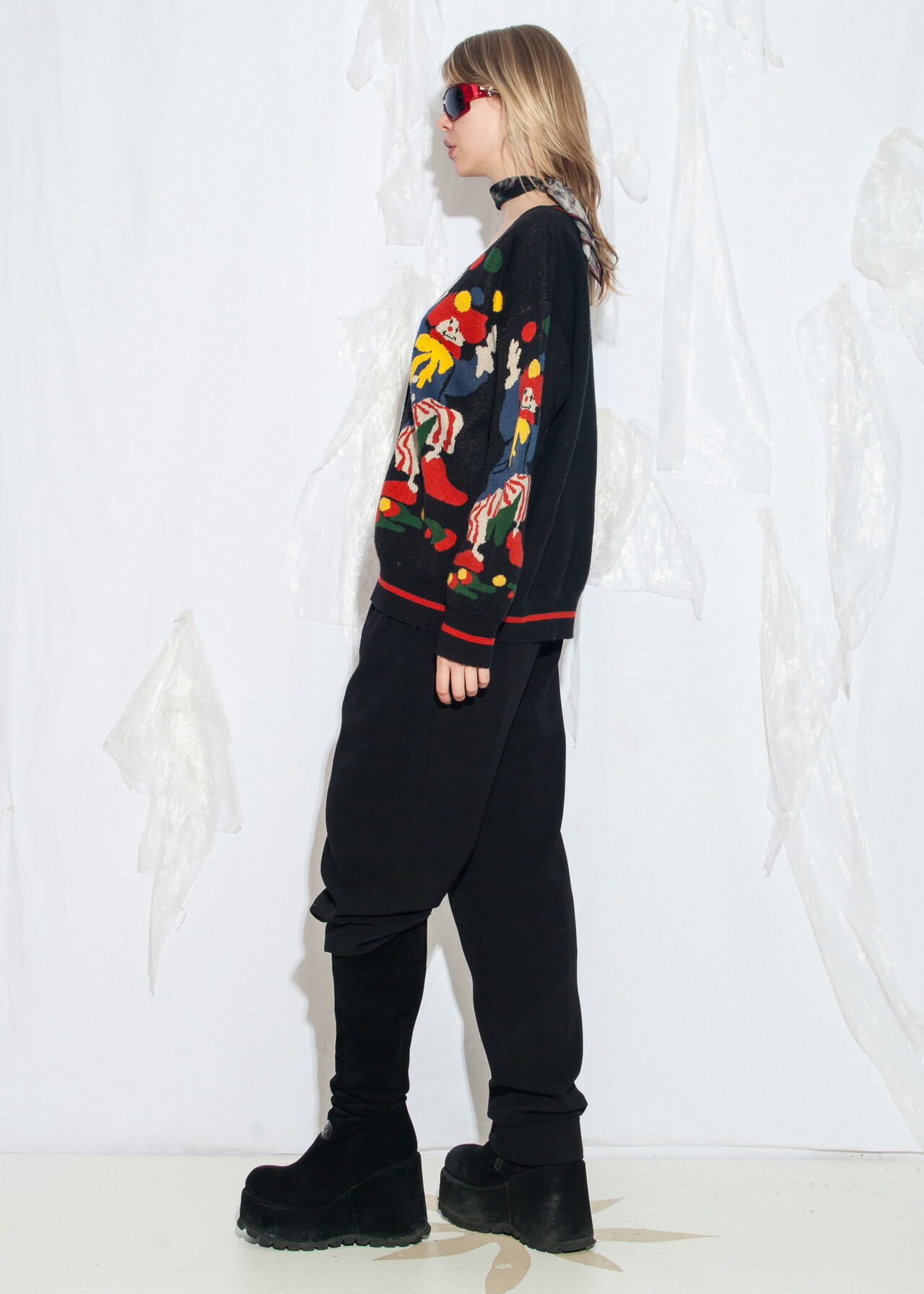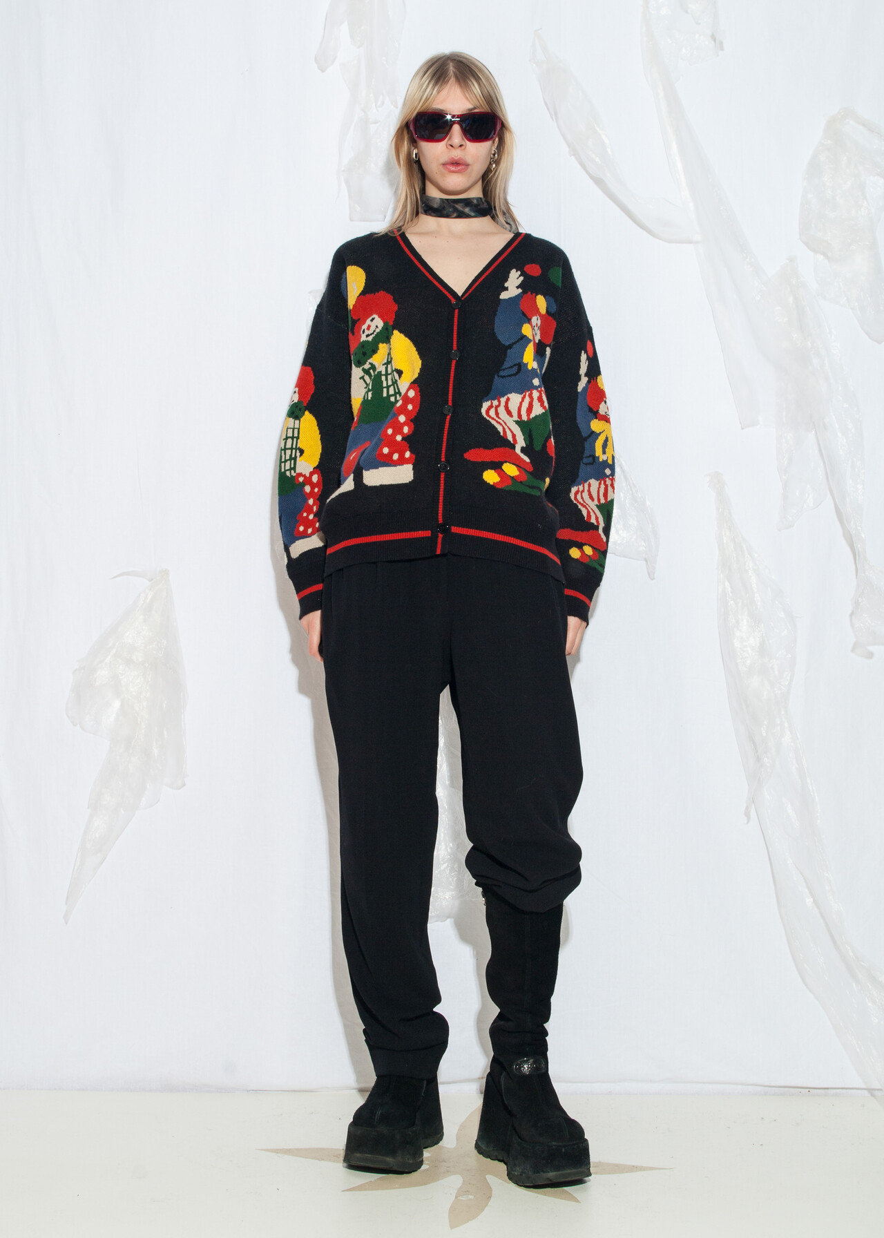 This Y2K vintage knit cardigan is your ticket to kidcore fun with its circus clown pattern and oversized, cozy vibes. Rock this long-sleeved black wonder and teleport back to an era where fashion was as playful as your favorite childhood memories.