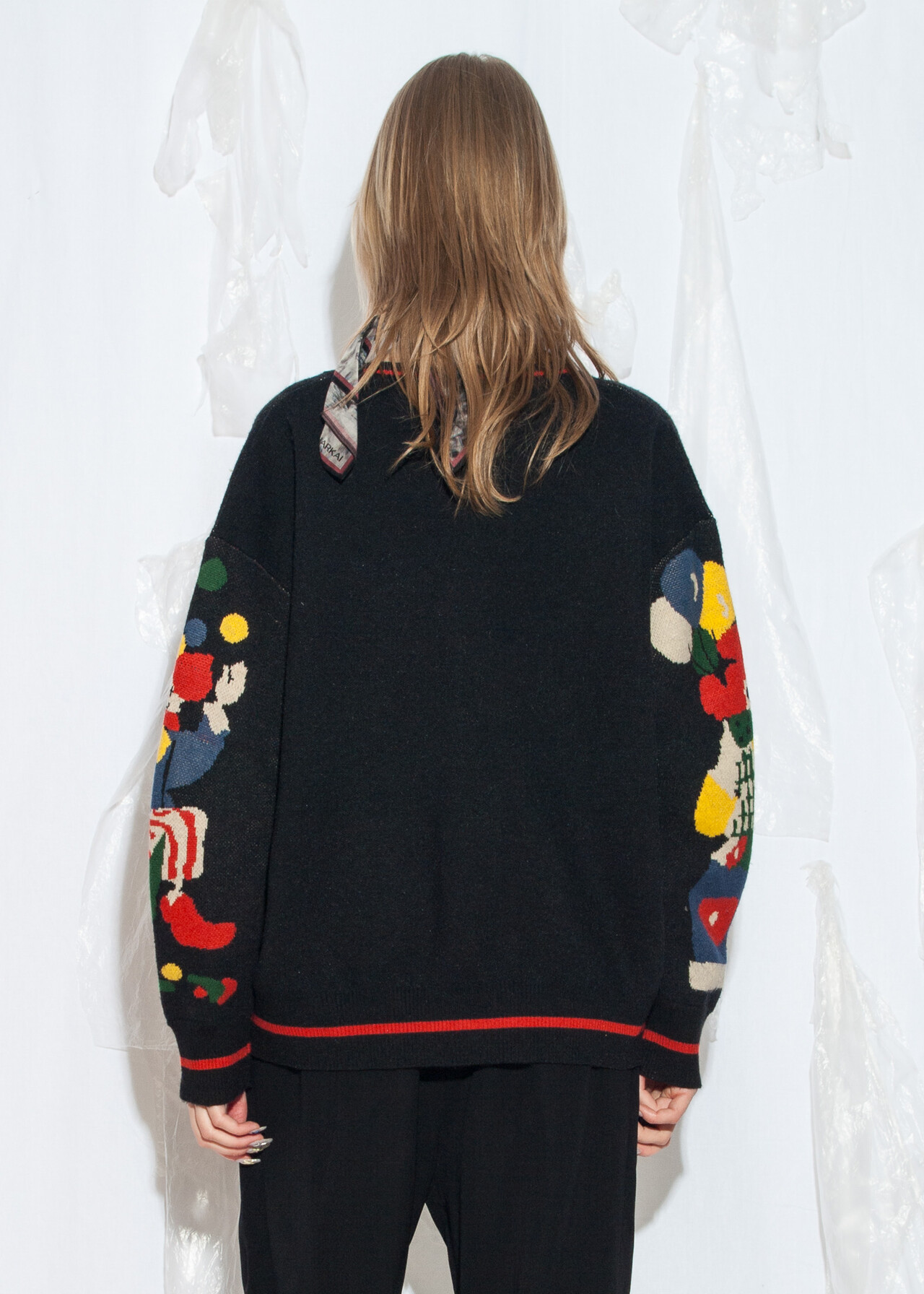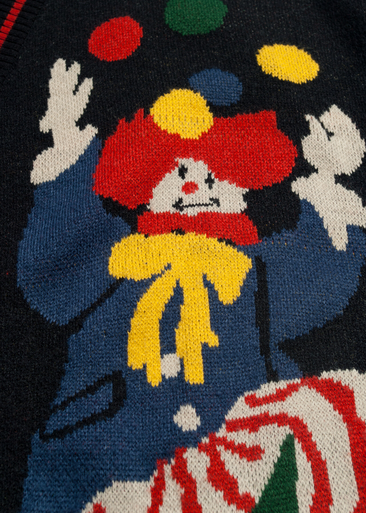 Tags: 2000s style fashion, circus clown pattern, funky jumper, grunge outfit, Kidcore, knit sweater, knitted cardigan, oversized, y2k vintage clothing