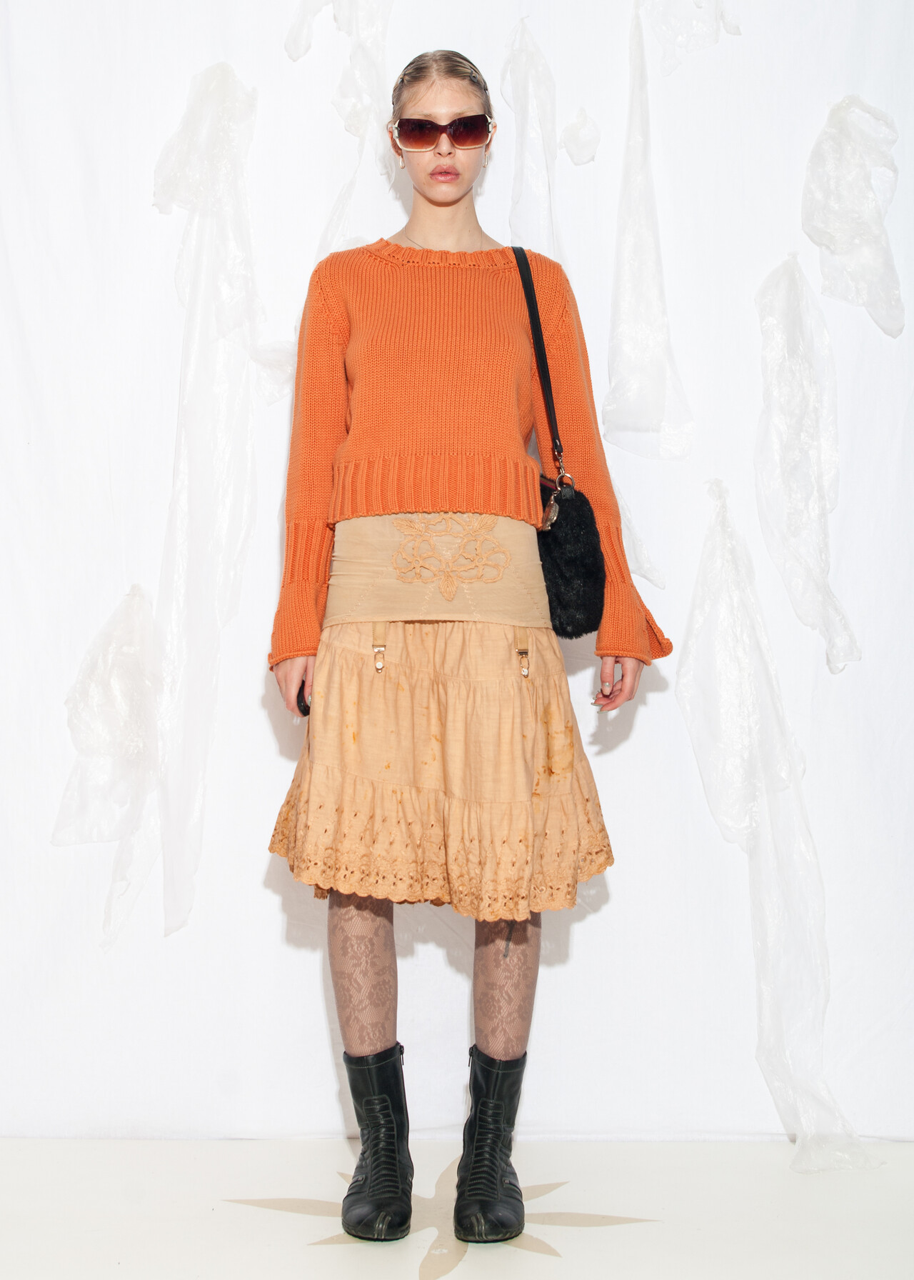 Tags: 2000s style clothing, cotton knitwear, crop pullover, flare sleeve top, orange sweater, whimsi twee look, whimsigoth aesthetic, y2k grunge outfit, y2k vintage fashion
