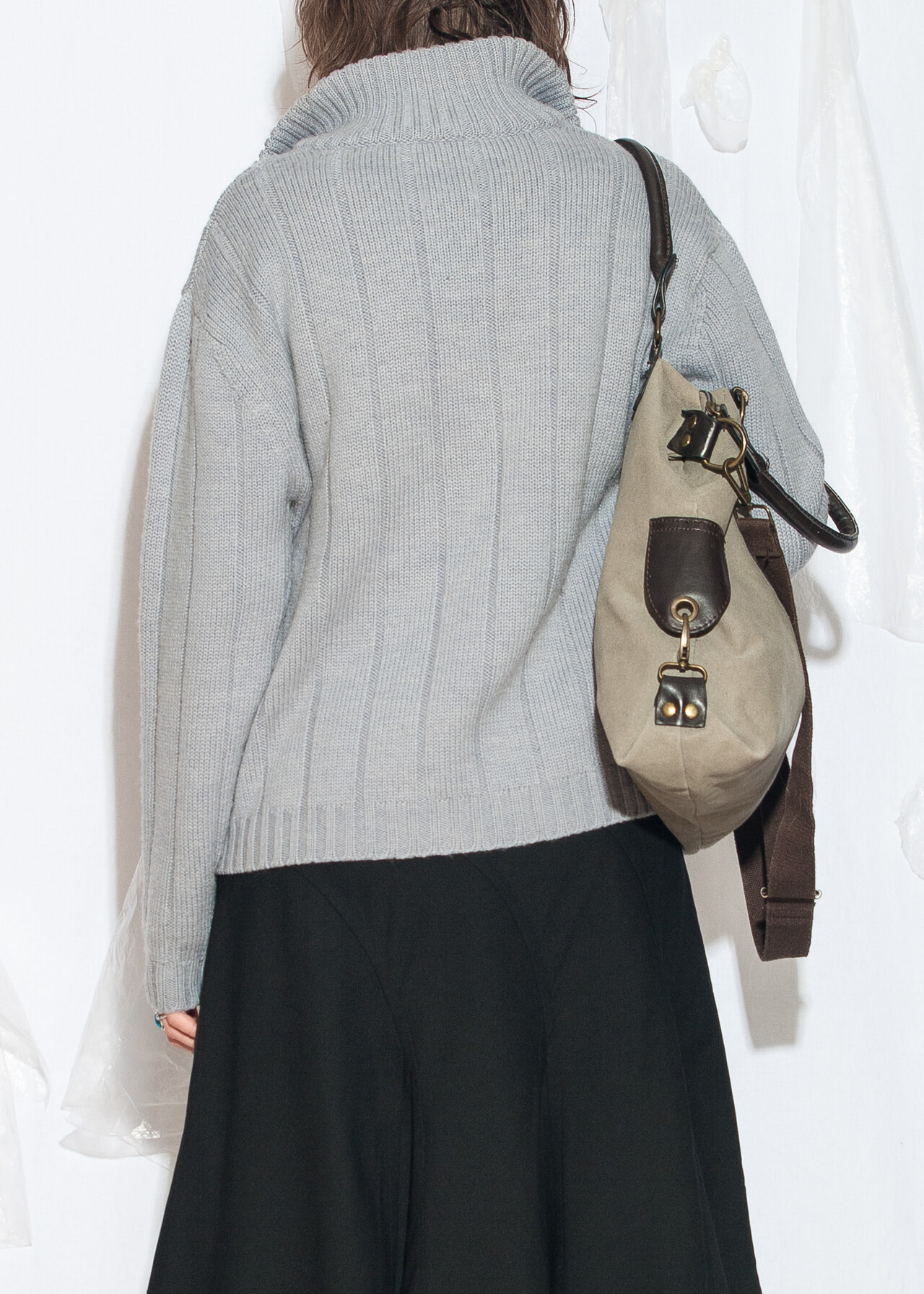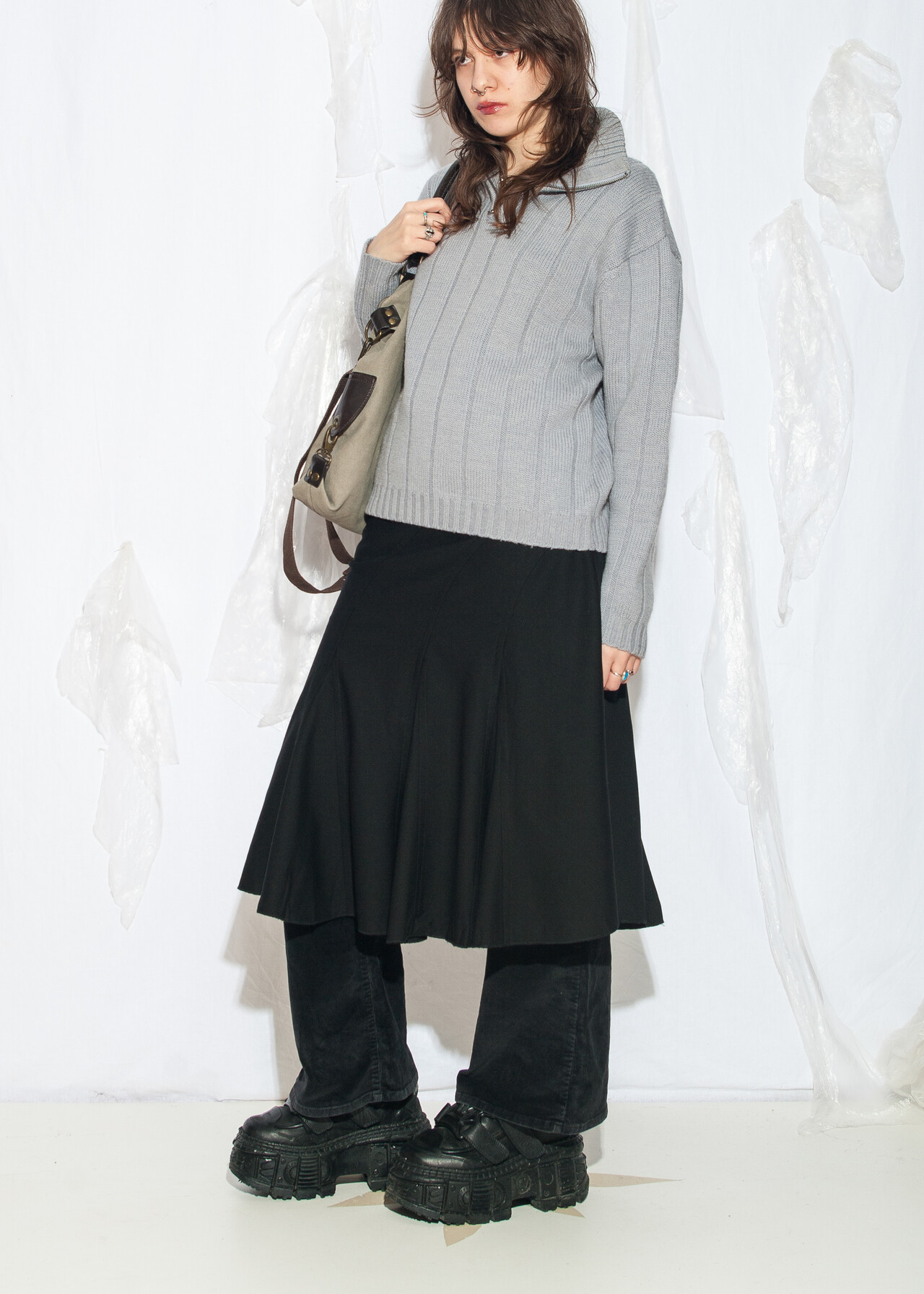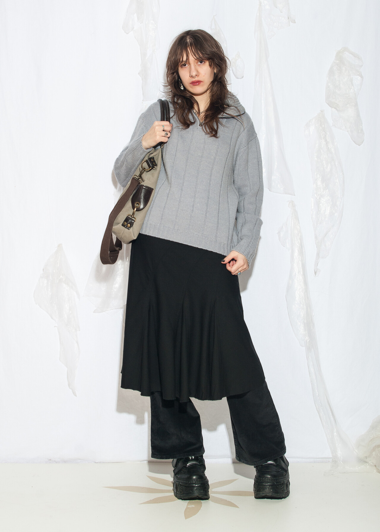 Tags: 00s streetwear, 2000s style fashion, gender neutral, grunge outfit, minimalist look, rib knitted sweater, standing collar, wool blend jumper, y2k vintage clothing