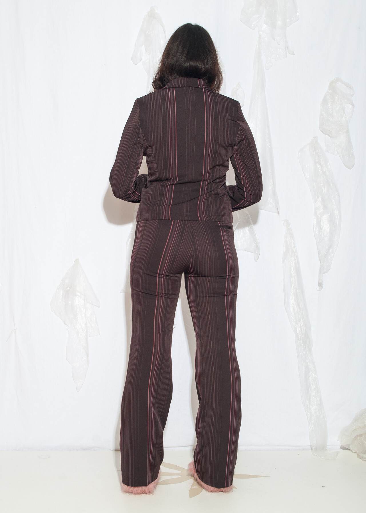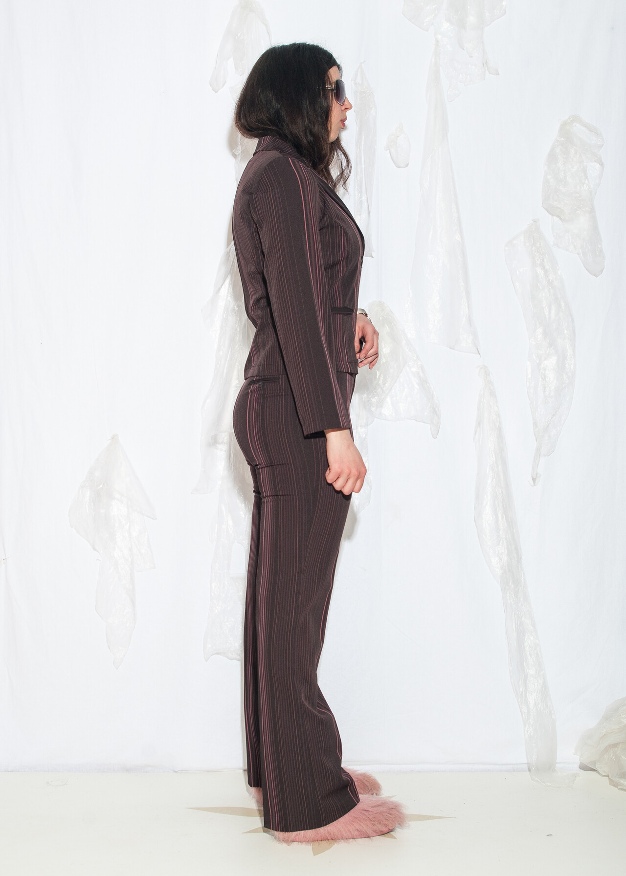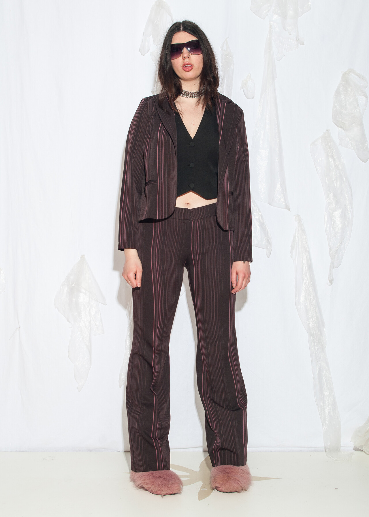 This Y2K vintage business suit set by Pourquoi Pas is the ultimate office siren look, containing a pinstriped blazer and flare pants. Made in France and radiating major early 2000s vibes, this brown ensemble is your ticket to being the CEO of nostalgia.