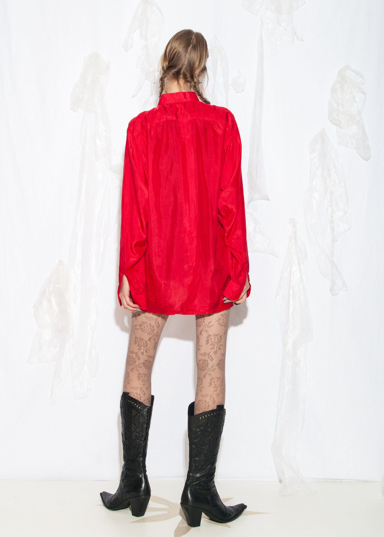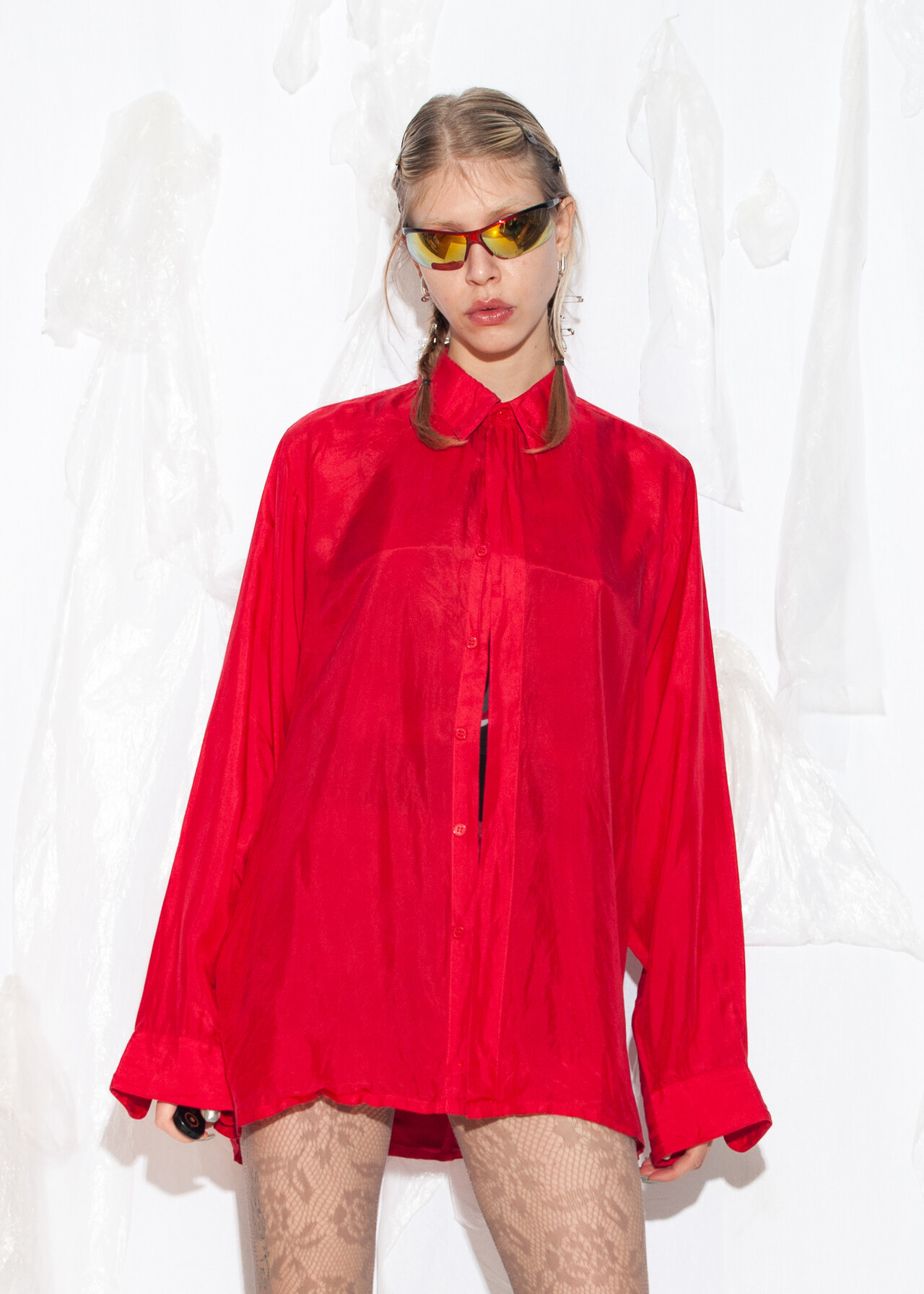 Tags: 80s vintage fashion, gender neutral, grunge outfit, minimalist look, office siren, oversized top, pure silk blouse, red silk shirt, unisex shirt, y2k style clothing