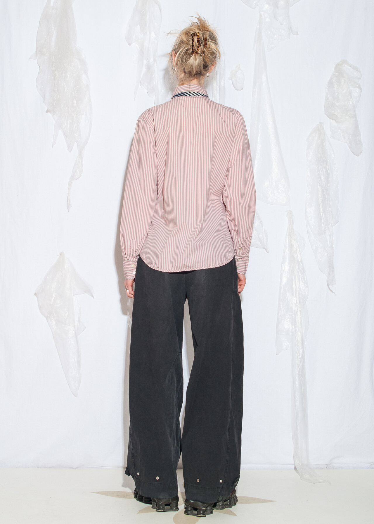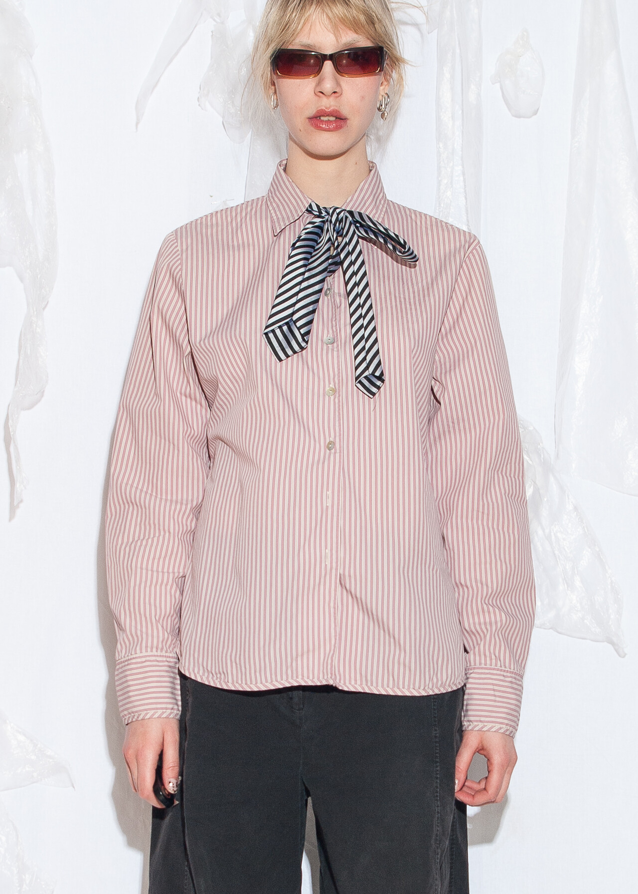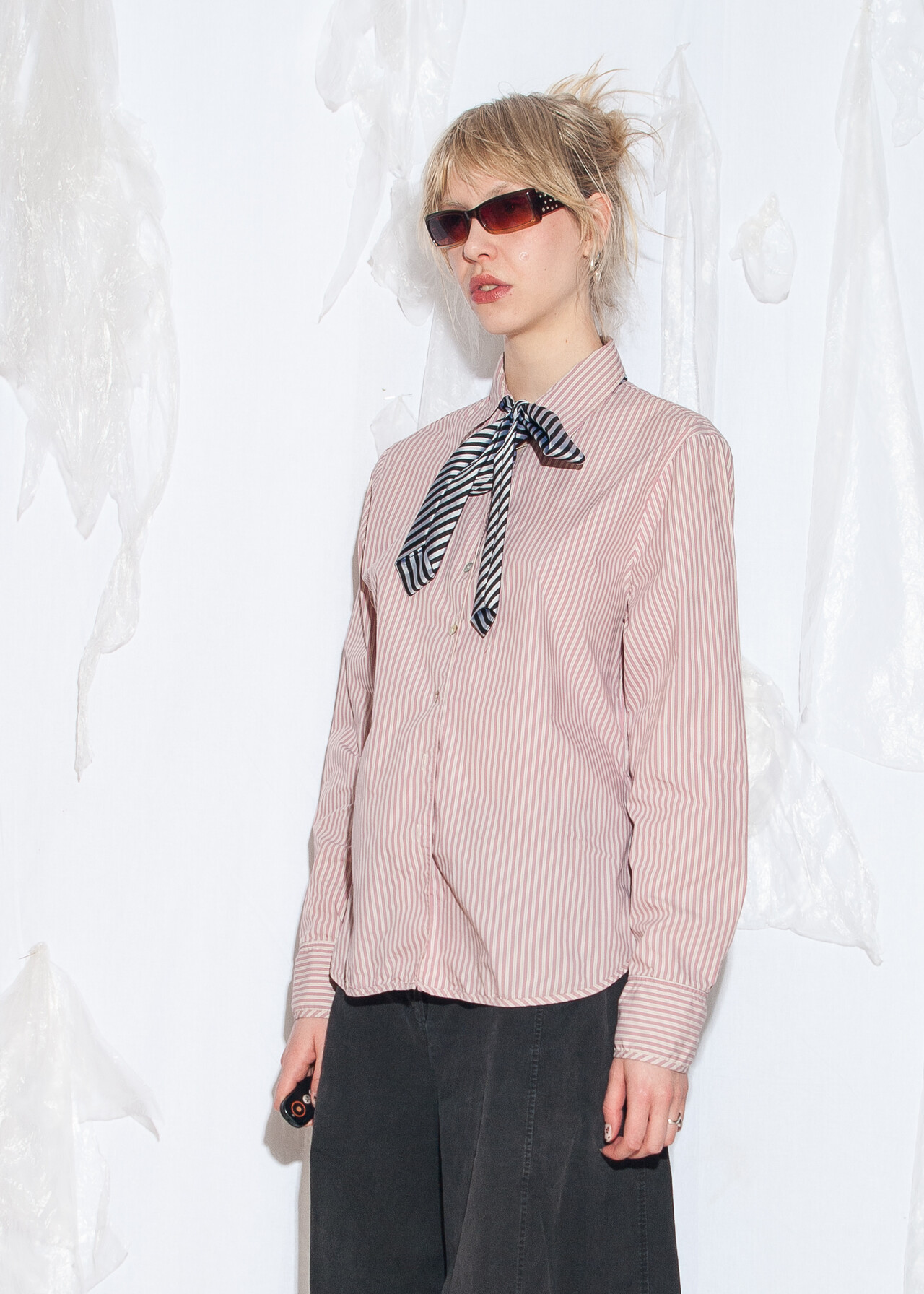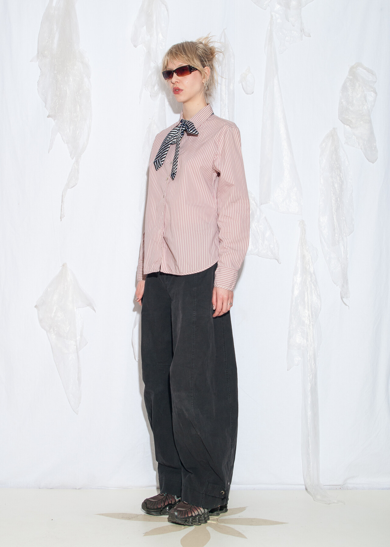 Tags: 2000s style fashion, boyfriend fit, circus aesthetic, grunge outfit, office siren, officecore, pinstriped shirt, y2k vintage clothing