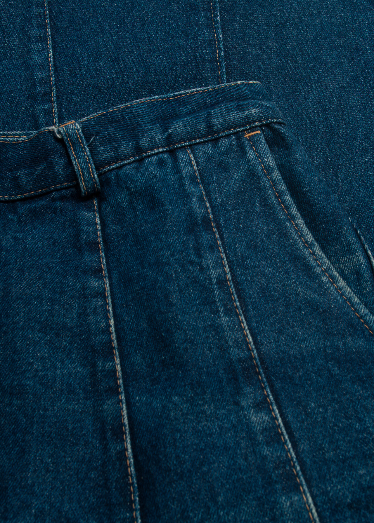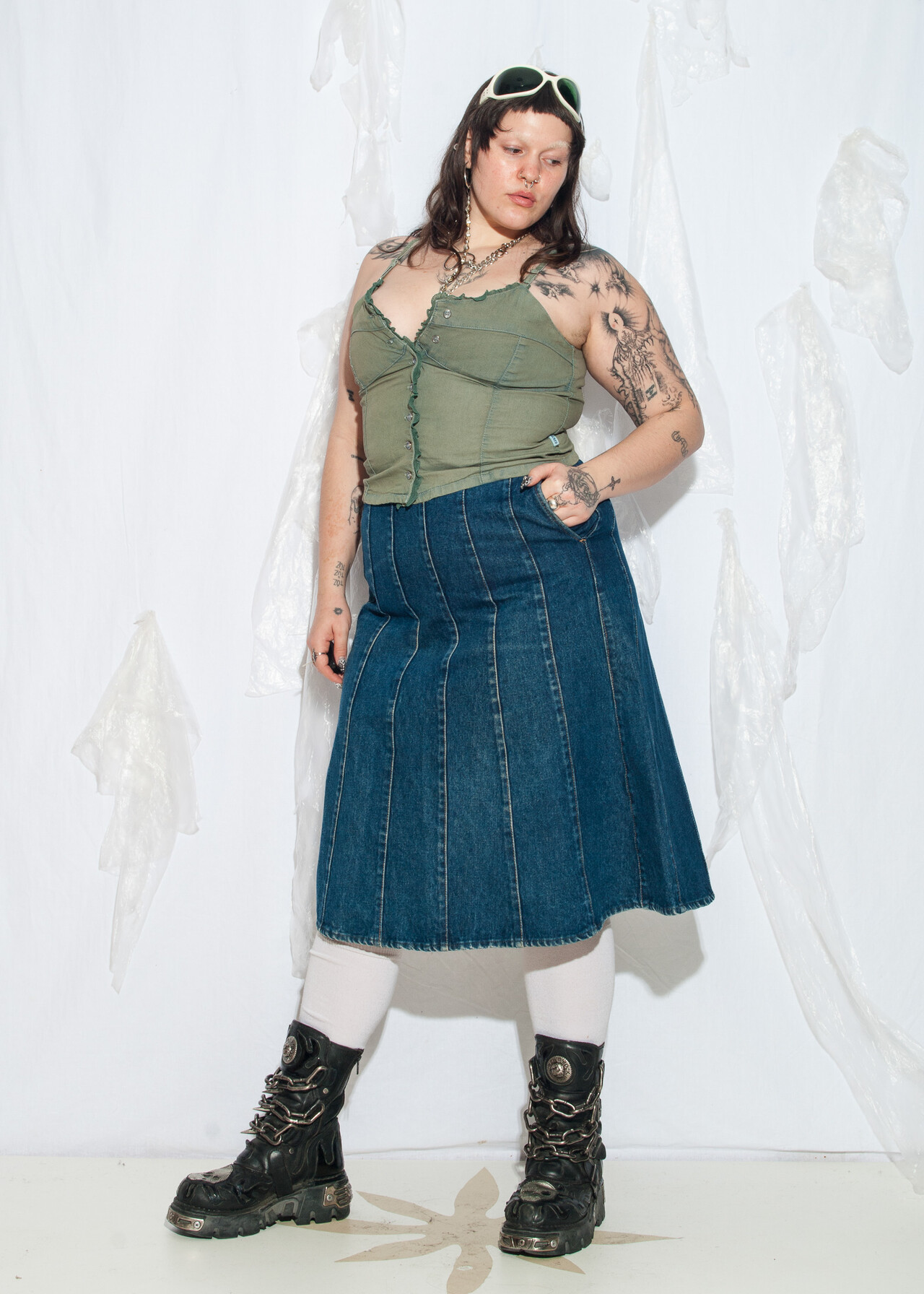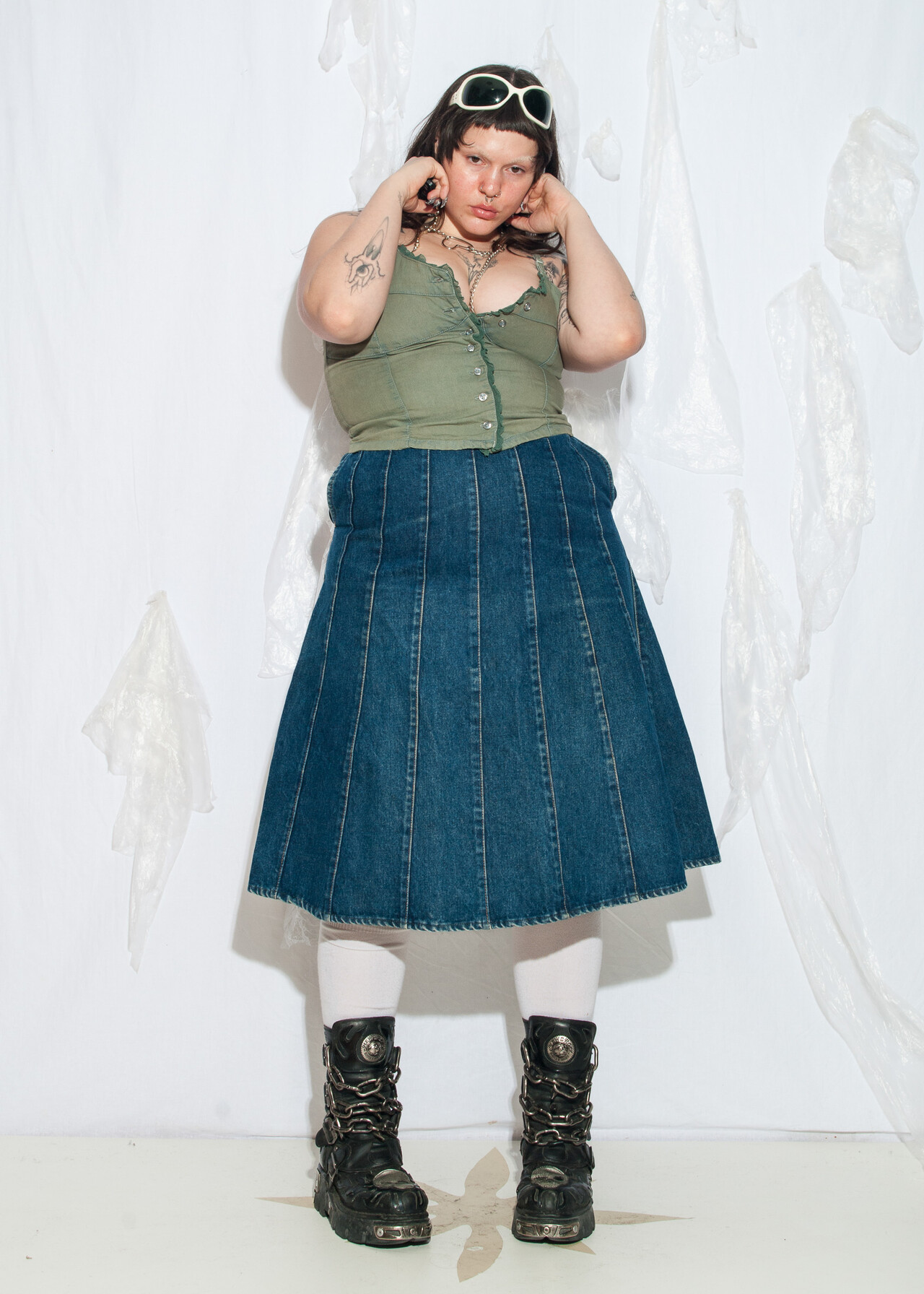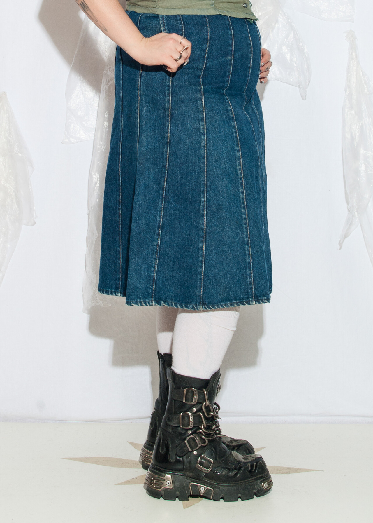Tags: 1980s style clothing, 80s vintage fashion, dark wash denim, denim midi skirt, high waisted jeans, jean skirt, minimalist, retro look, y2k grunge outfit