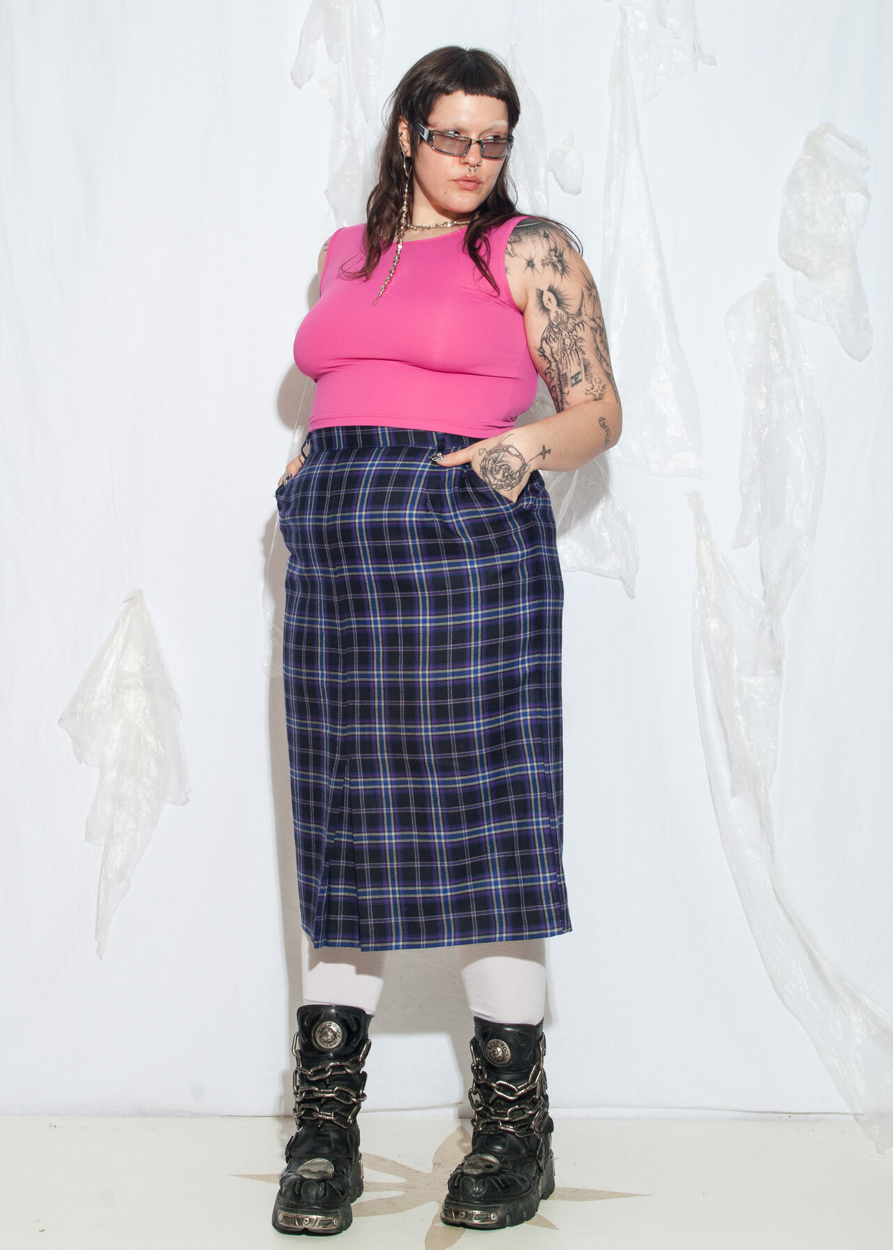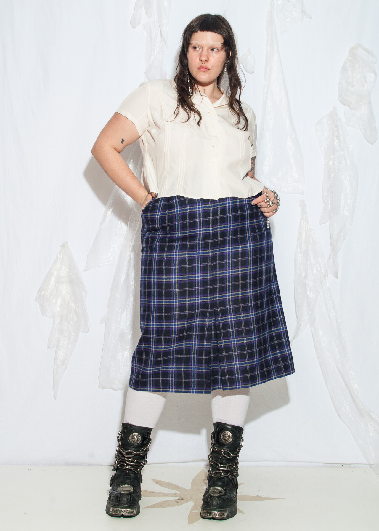 Tags: 90s vintage fashion, grunge outfit, high waisted bottom, made in UK, plaid midi skirt, preppy look, venus size, wool skirt, y2k style clothing