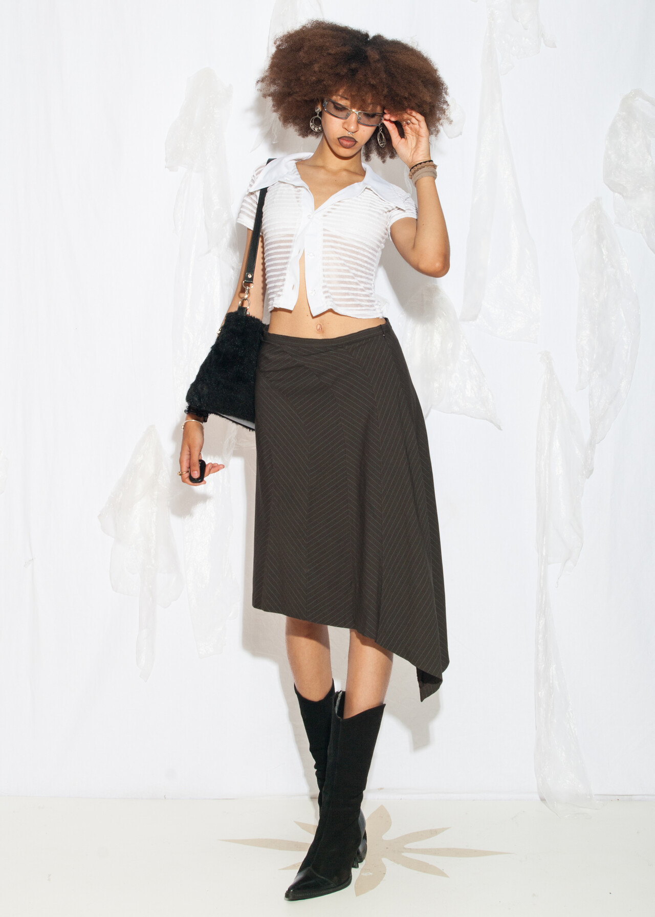 Batiste’s Y2K vintage skirt is the business casual friend you never knew you needed, ready to strut from office siren mode straight into the early 2000s time warp with its asymmetric hem and wool blend charm!