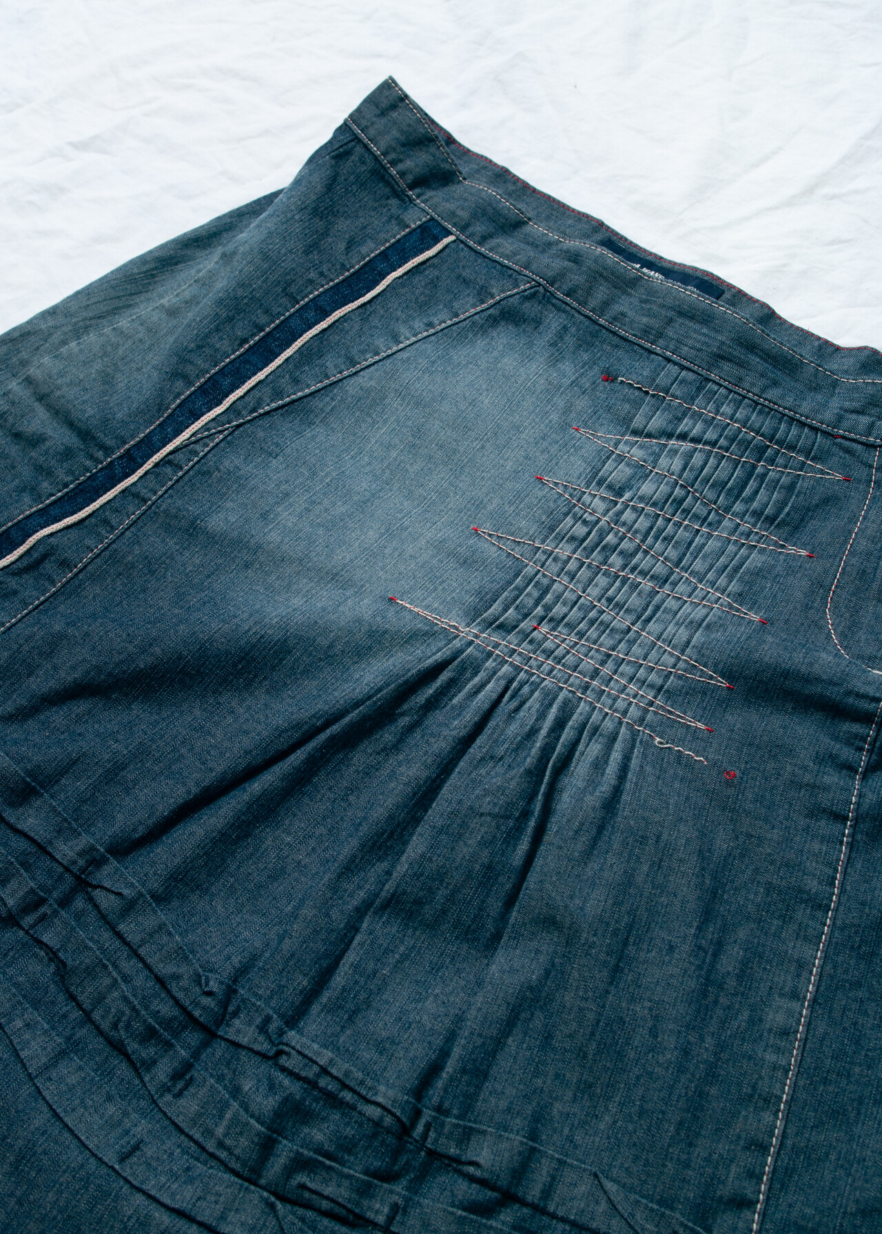 Tags: 00s aesthetic, 00s streetwear, 2000s style clothing, asymmetric cut, dark wash denim, denim midi skirt, Geisha Jeans, knee skirt, low rise bottoms, low waisted skirt, whimsi twee look, y2k grunge outfit, y2k vintage fashion