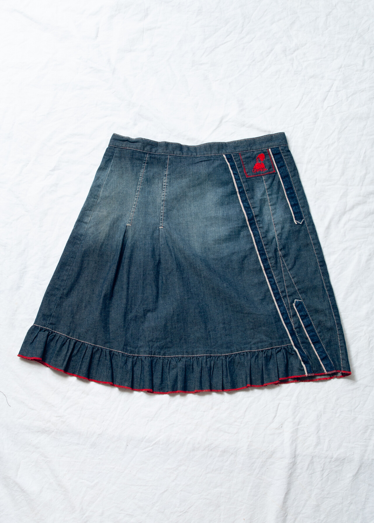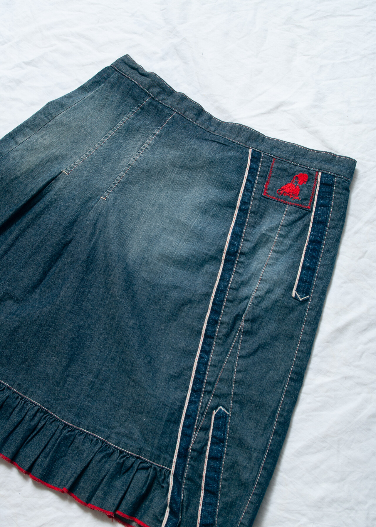 This Y2K vintage Geisha Jeans skirt is your one-way ticket to reliving the 2000s with a low-waisted denim vibe.