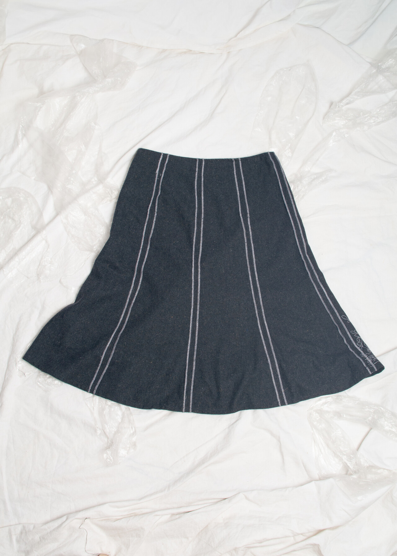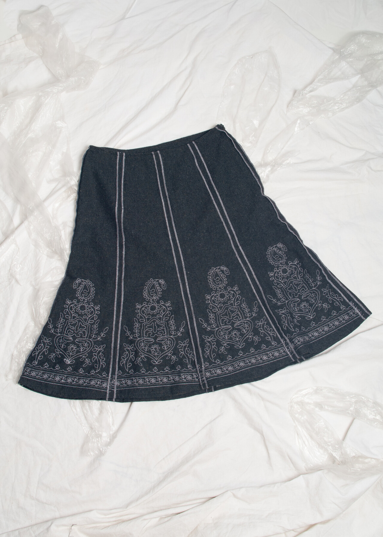 This Y2K vintage skirt is a dream-come-true with its folk embroidery and wool blend magic that’s grey in all the right ways.
