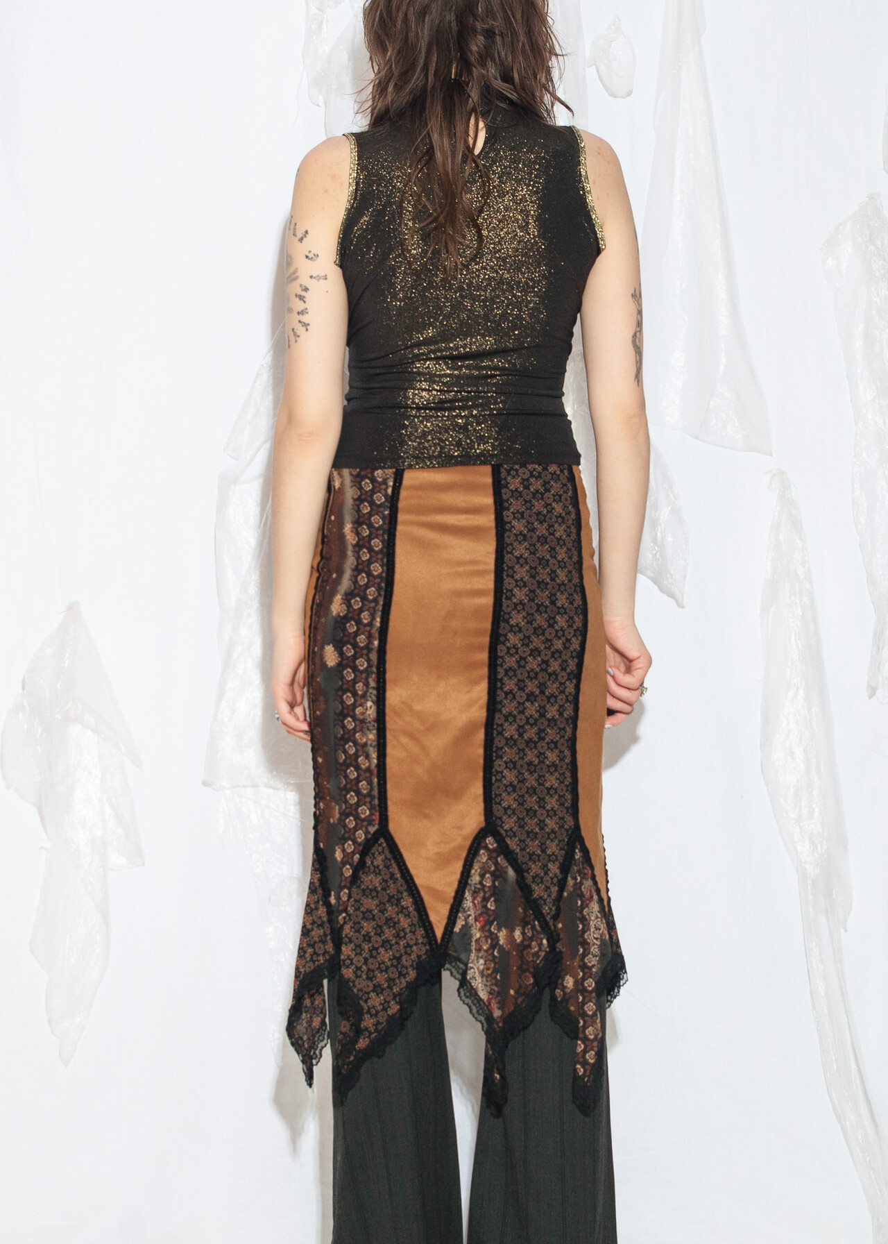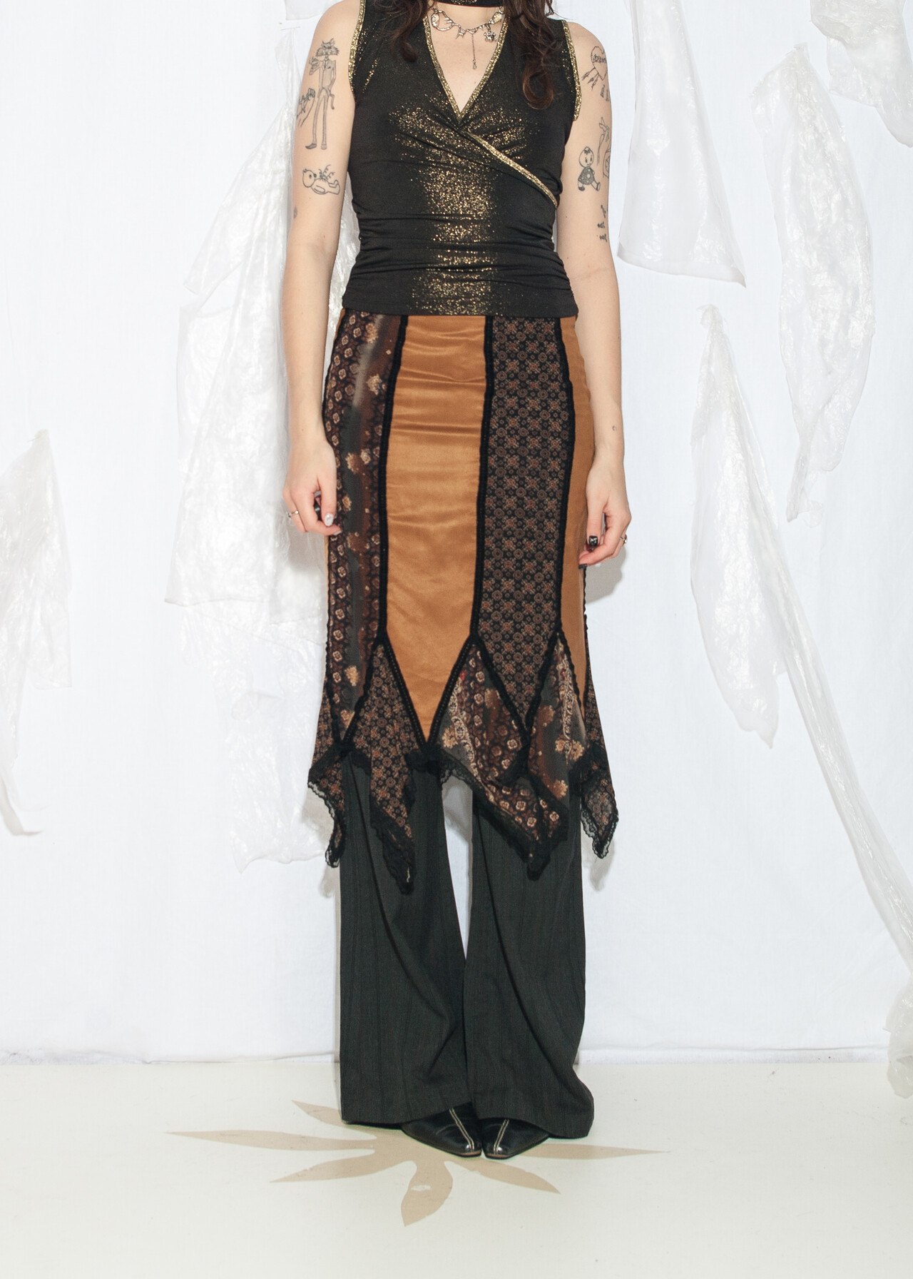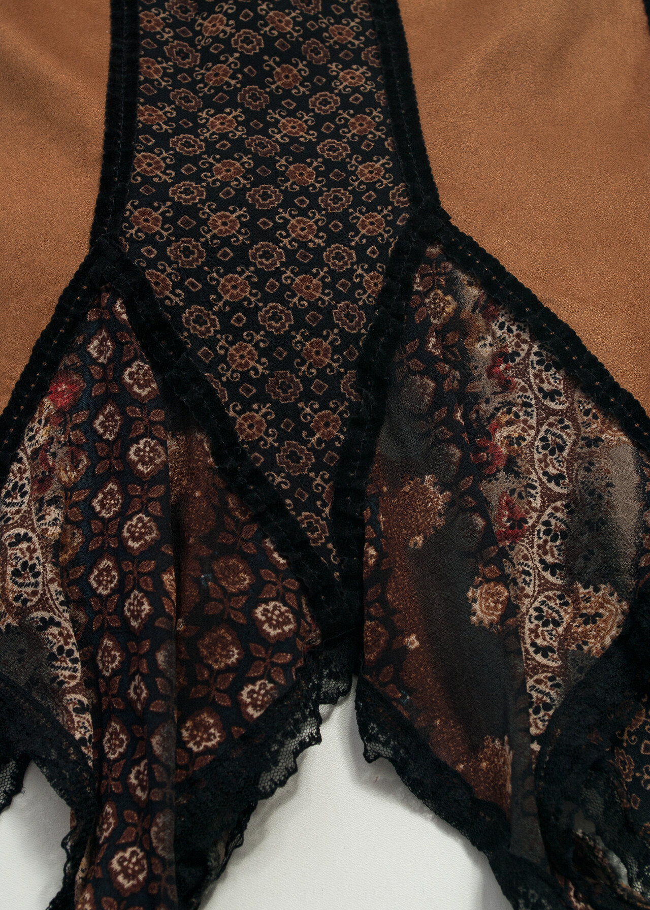 Tags: 2000s style fashion, boho romantic, frilly midi skirt, lace skirt, low rise waist, patchwork skirt, whimsigoth, y2k vintage clothing