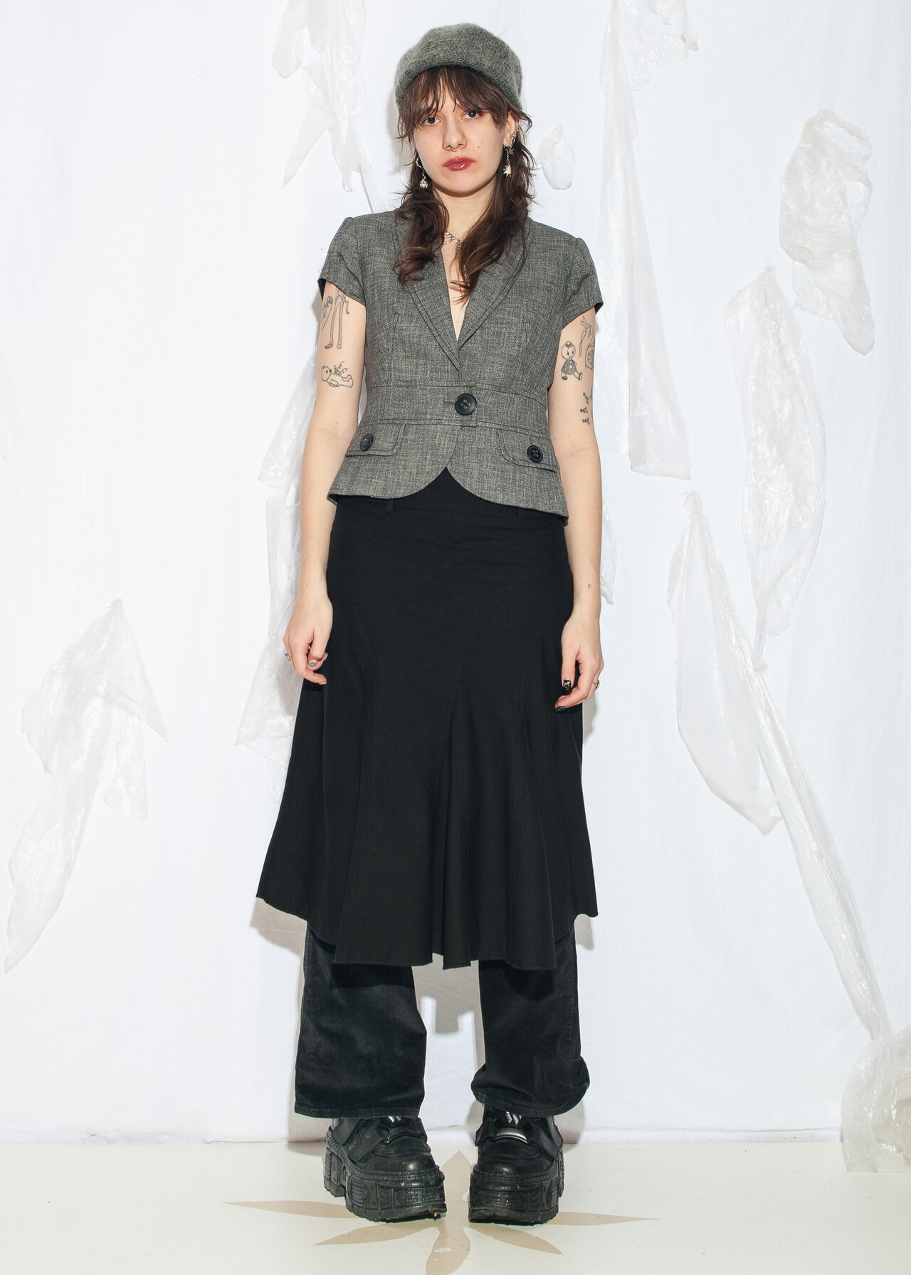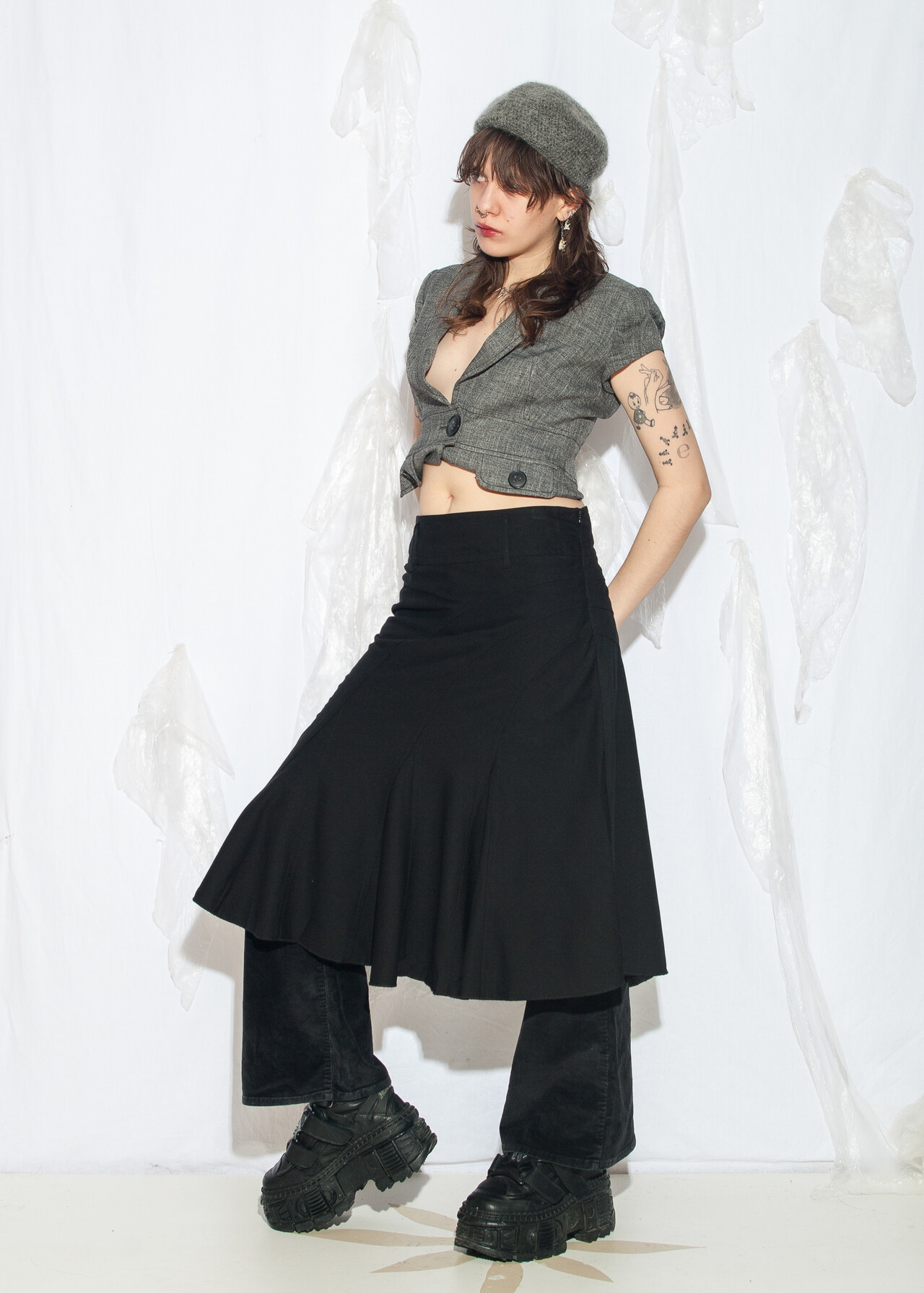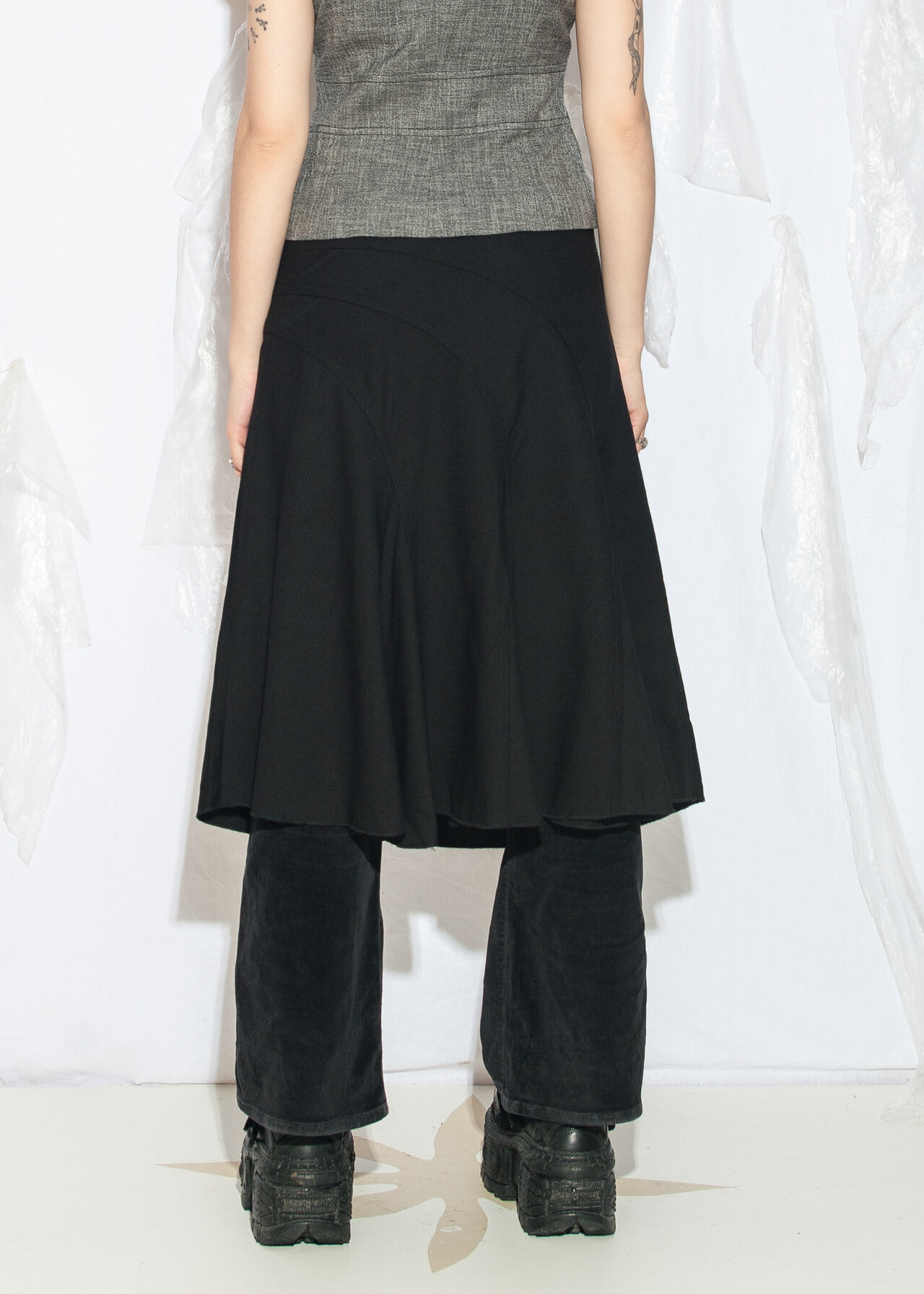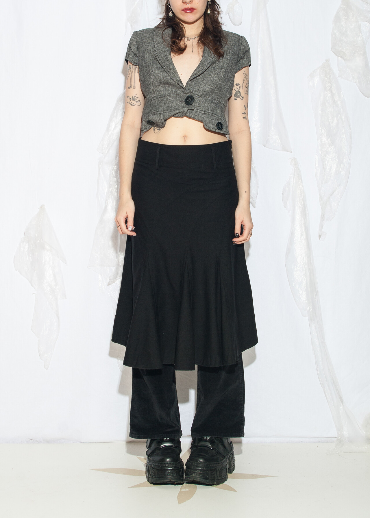 Tags: 2000s style fashion, frilly midi skirt, grunge outfit, middle rise waist, minimalist look, office siren, whimsigoth, y2k vintage clothing