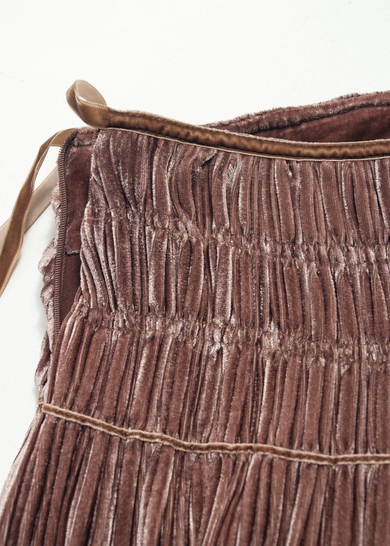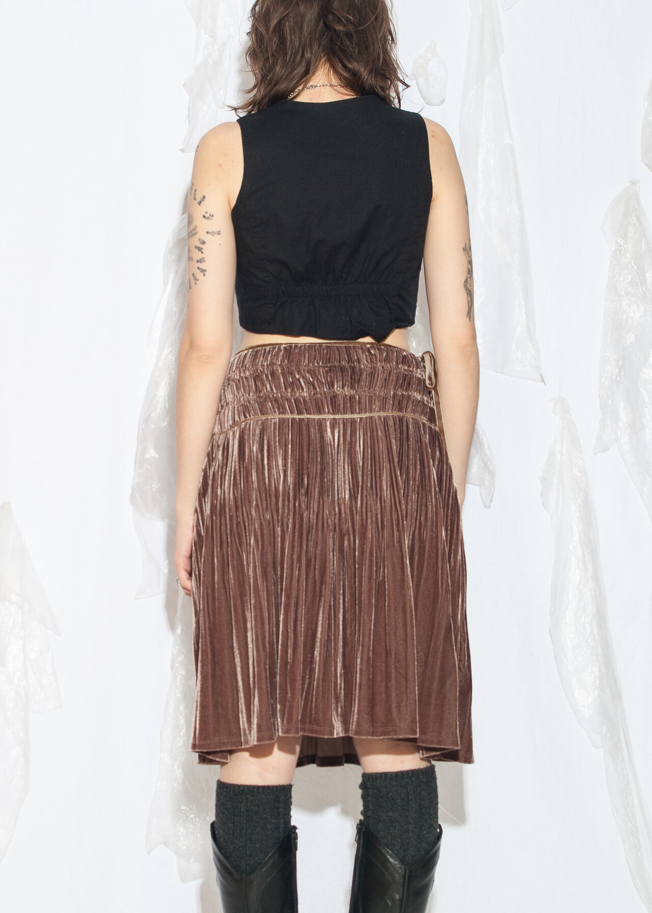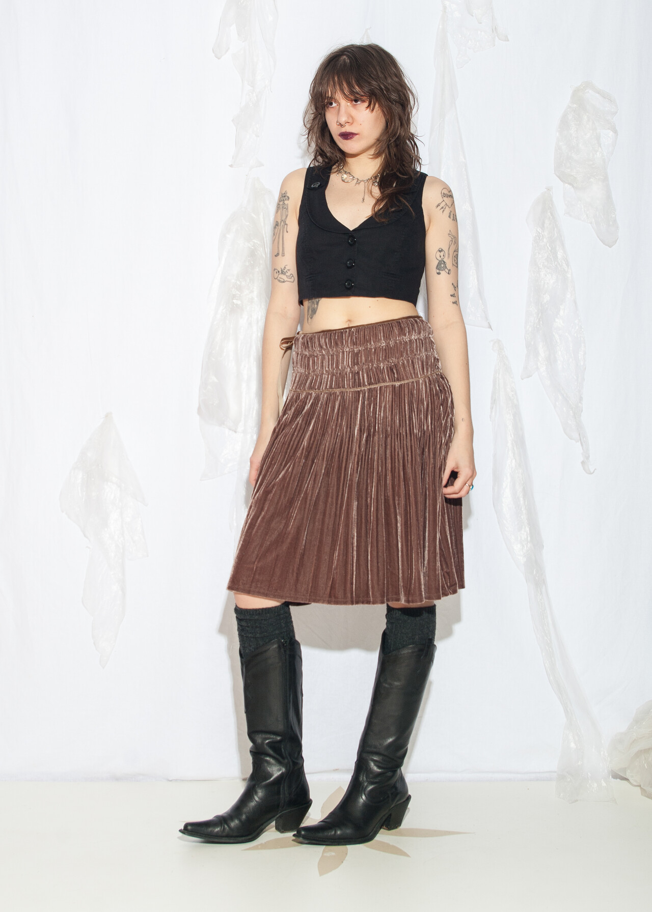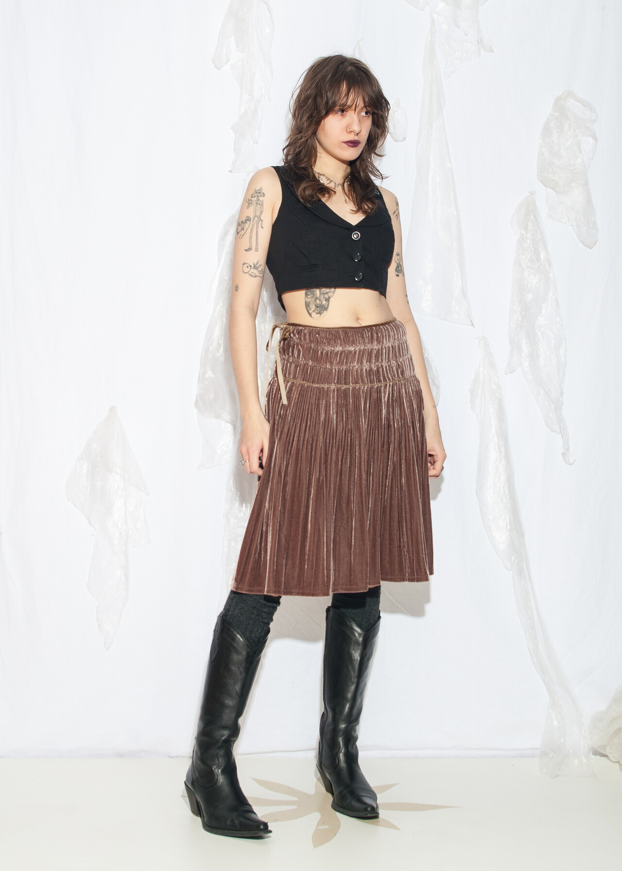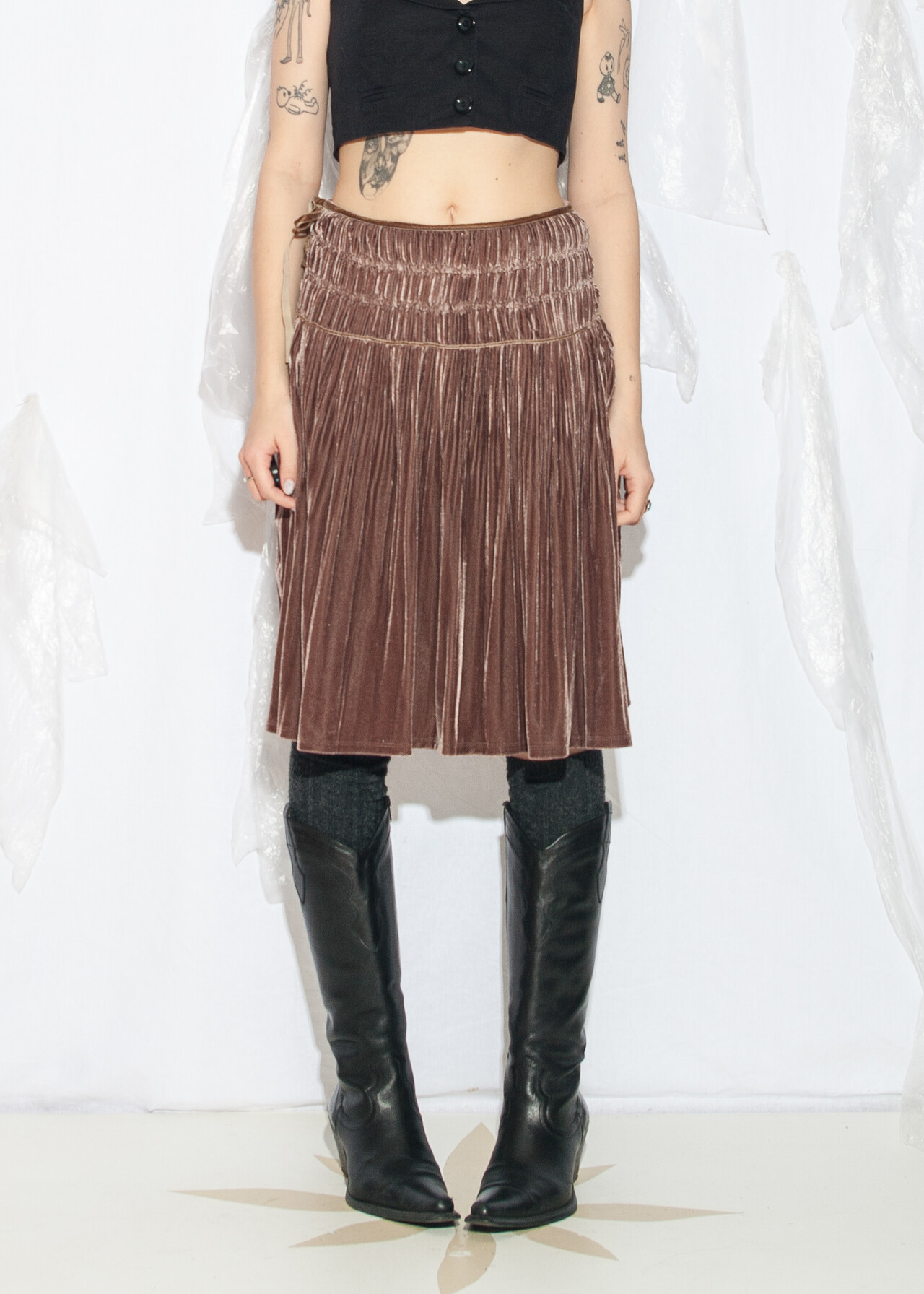 Tags: 2000s style fashion, boho romantic, frilly pleated skirt, middle rise waist, partywear, velvet midi, whimsigoth, y2k vintage clothing