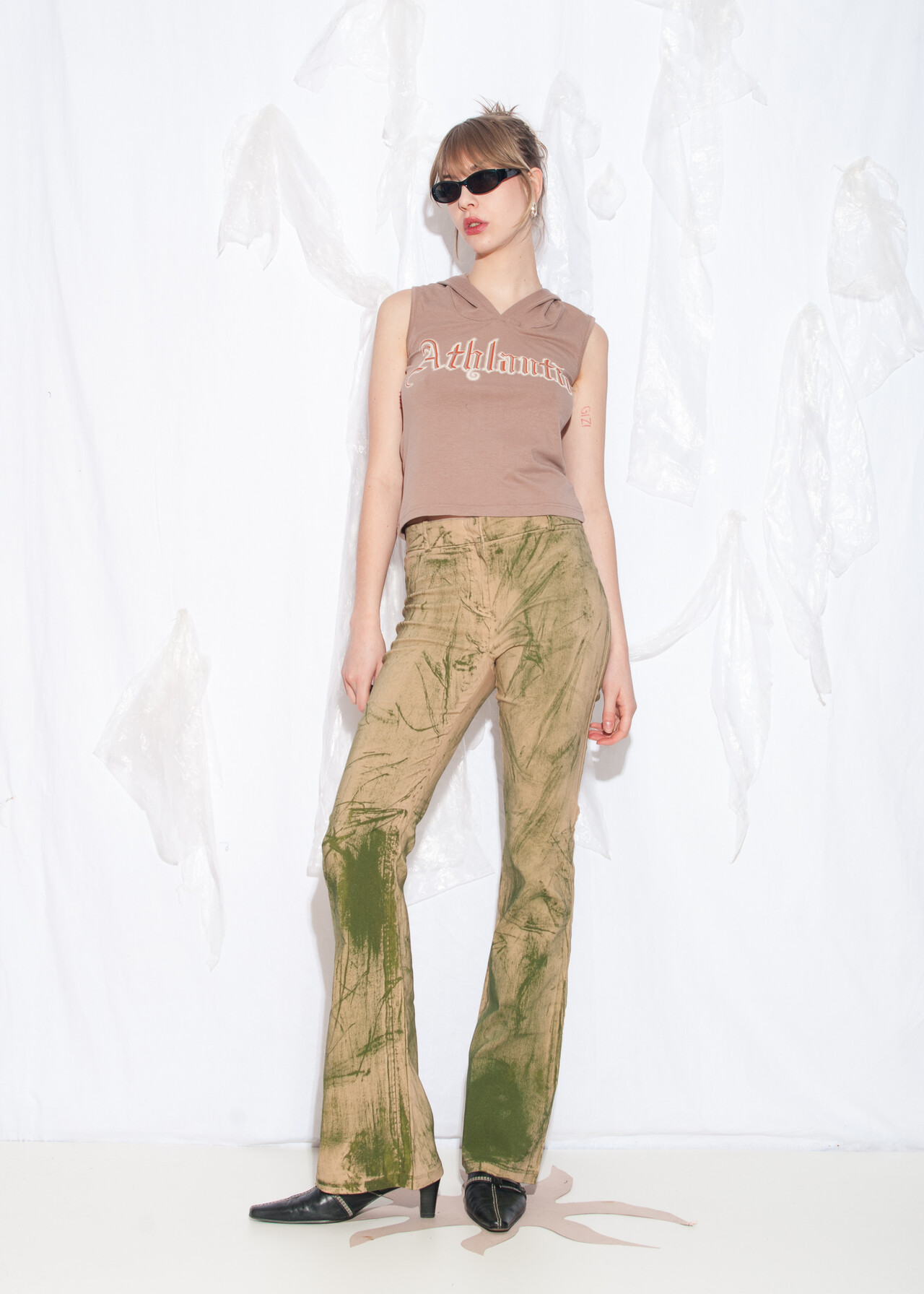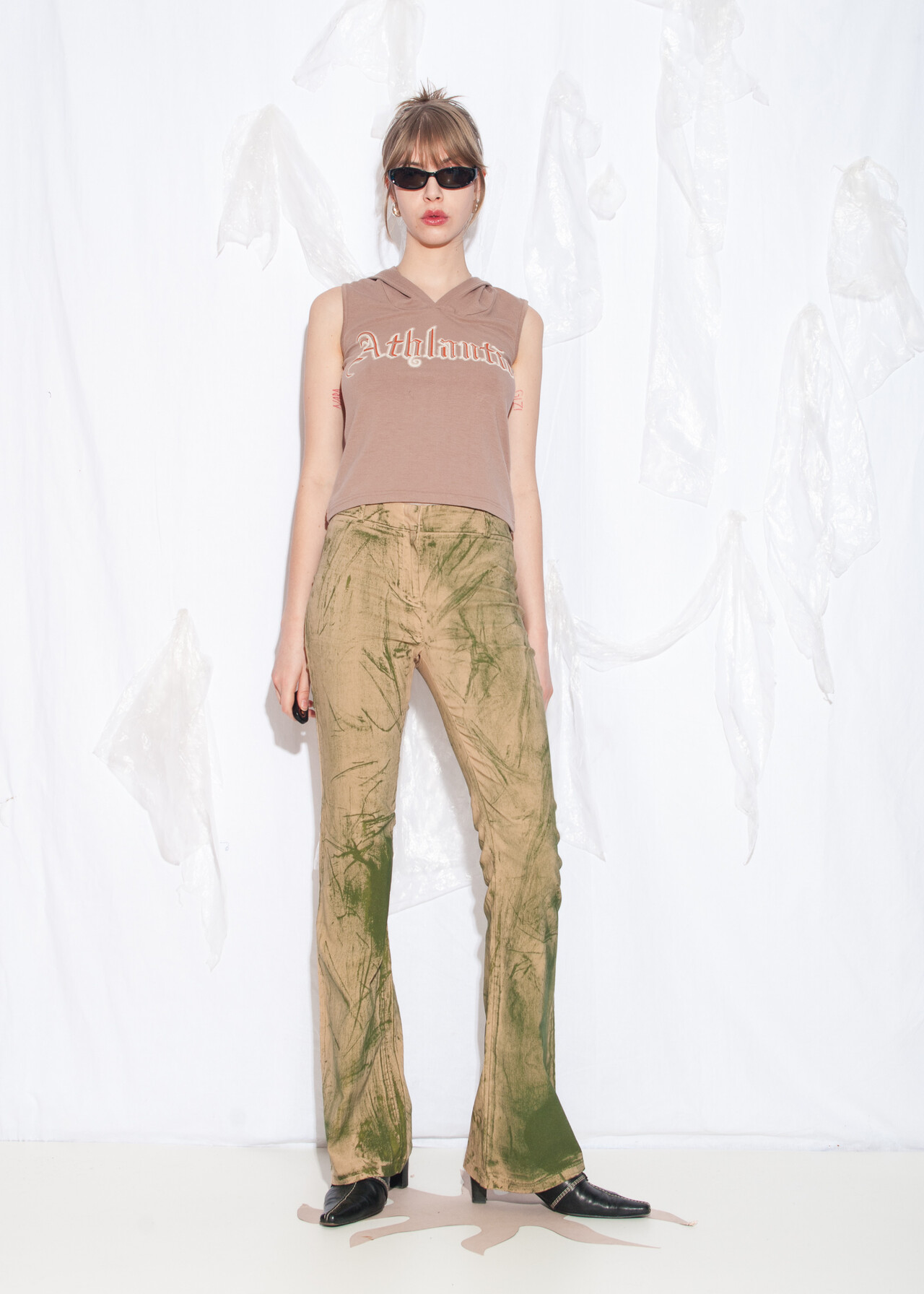 Tags: 00s streetwear look, 2000s style fashion, Athlantic print, gothic logo, grunge outfit, hooded crop top, slim fit tee, spell out tee, tank top, y2k vintage clothing